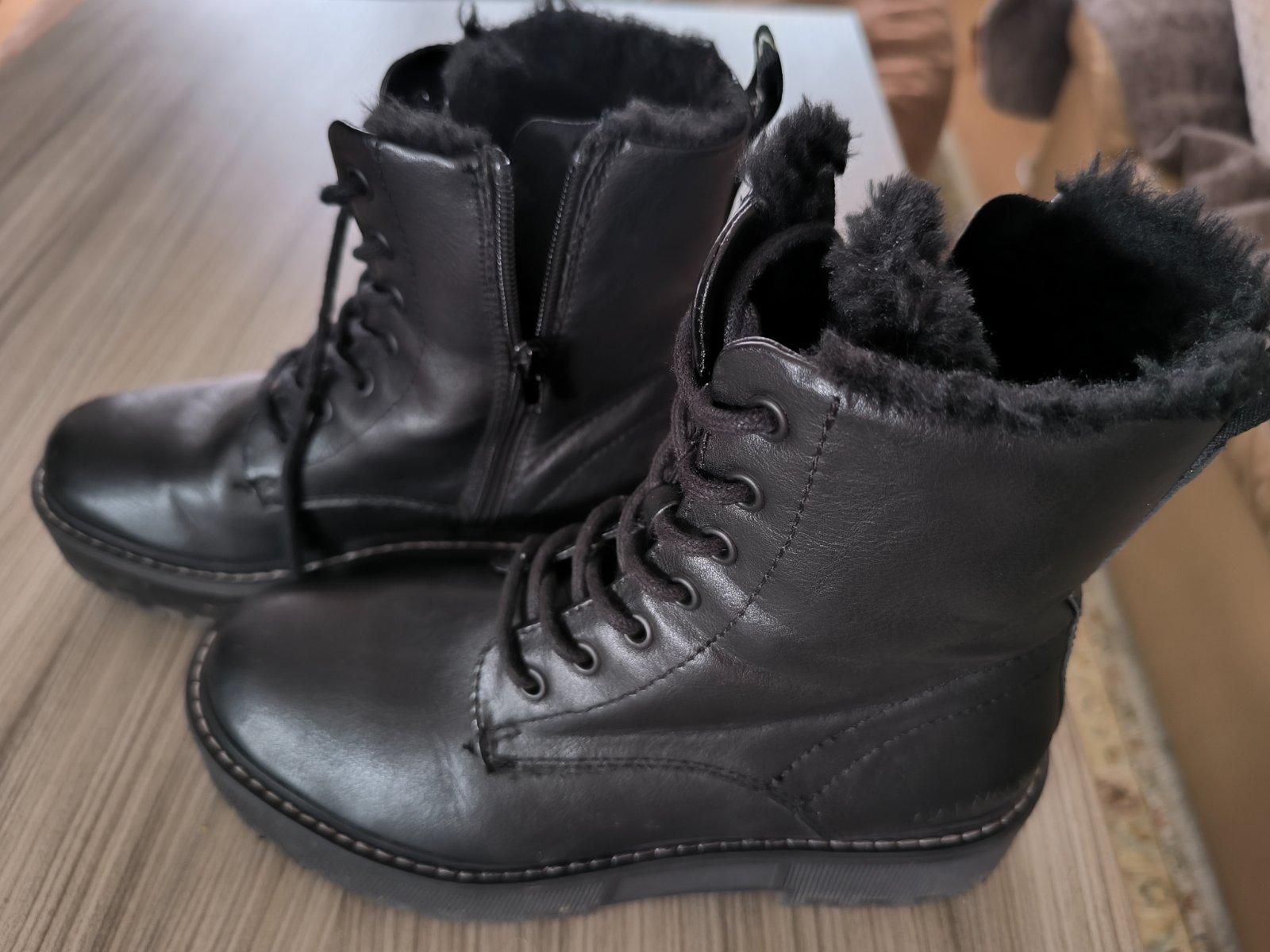 Krasne znackove kozene cizmicky Tamaris, velkost 39, vyska opatku 8 cm, cierna koza, parkrat obute, dovoz UK.