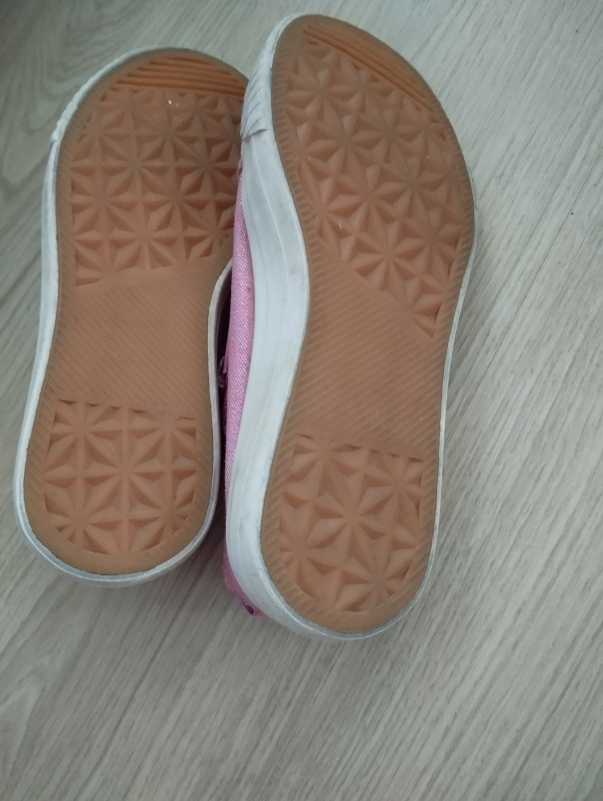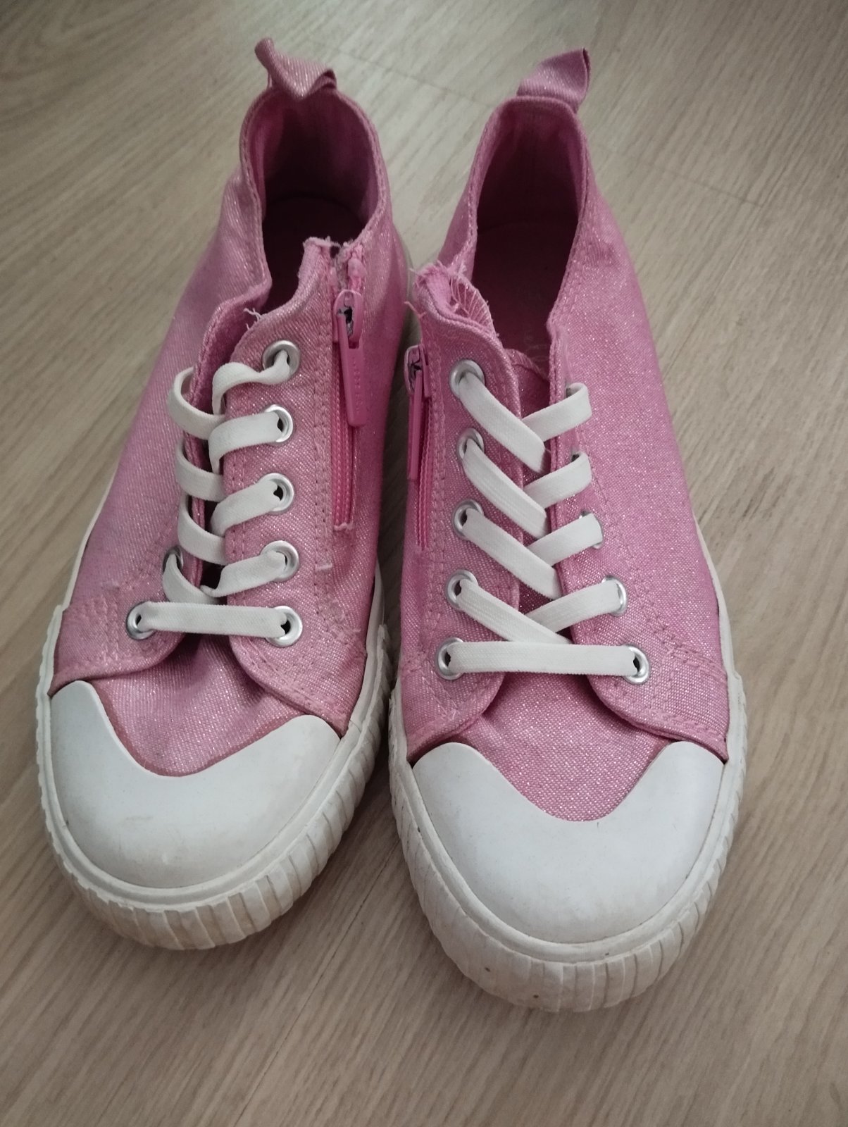 Krasne, jemne trblietave tenisky, vhodne aj ku satam, do skolky, ci na ihrisko. Bez poskodenia, na bielej casti vidno pouzivanie, su vyprate. Snurky elasticke, zapinanie cez zips na boku.