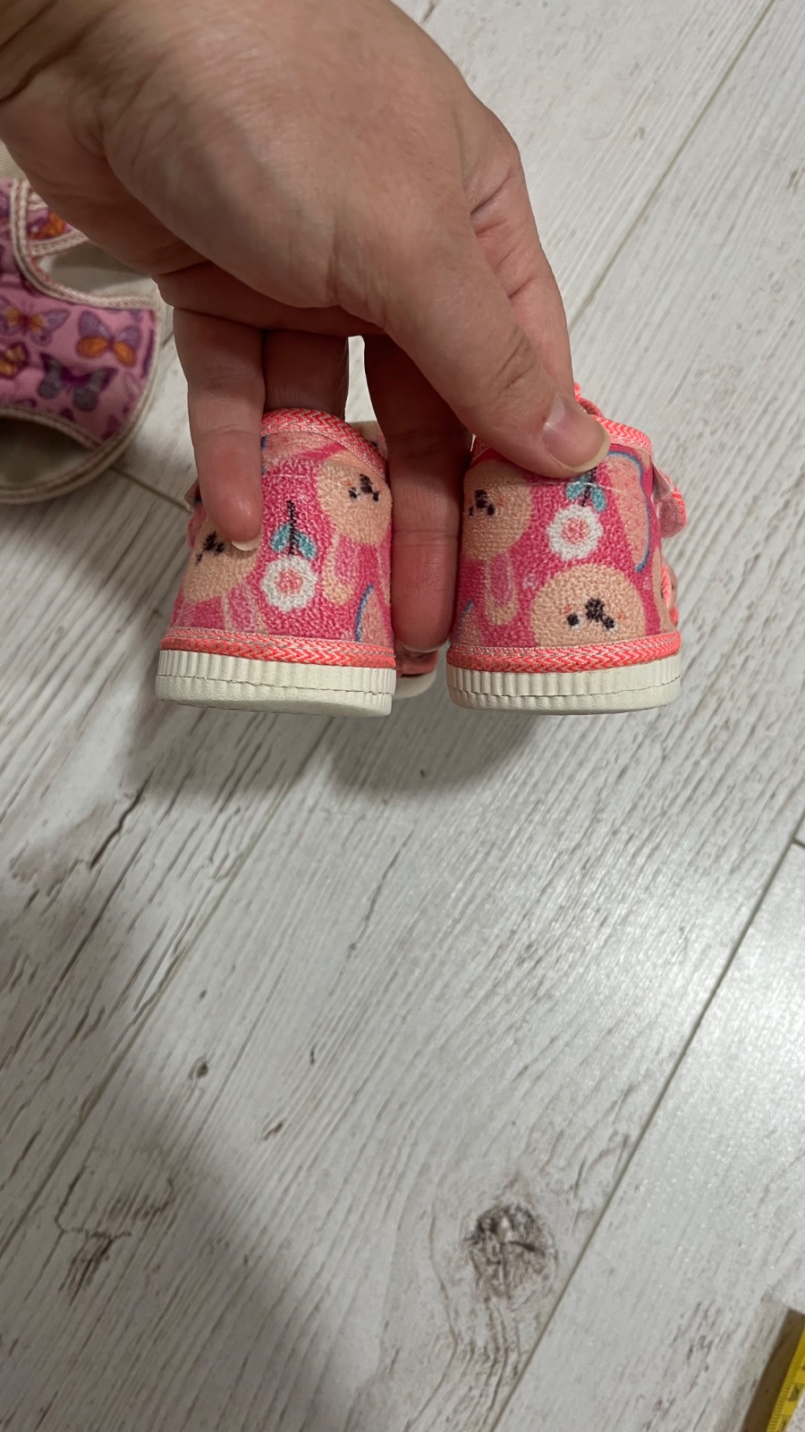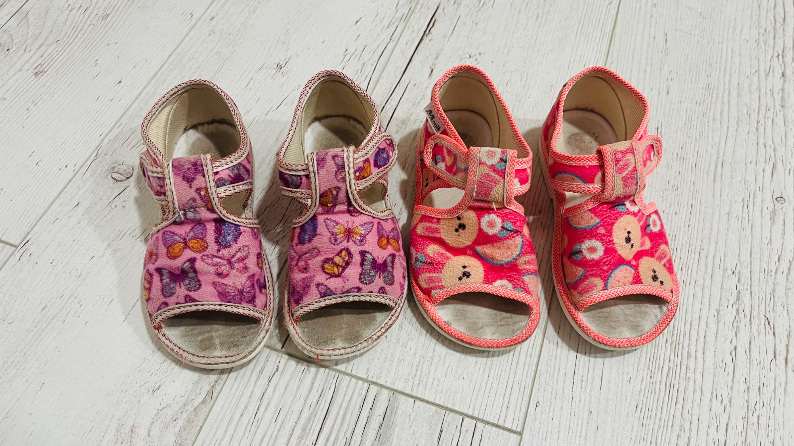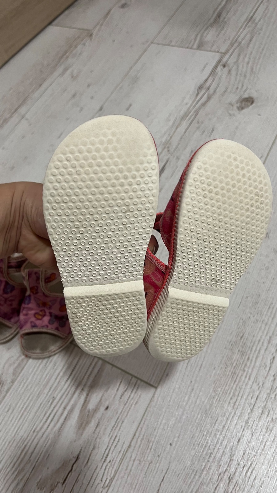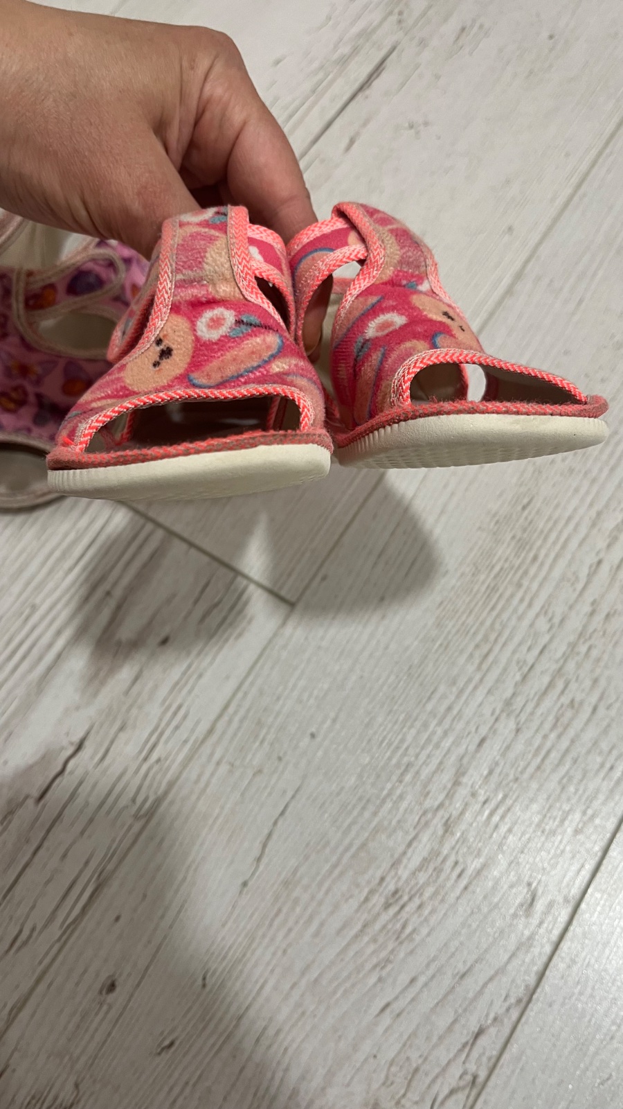 Lososové papucky skoro ako nové. Pouzivane v škôlke (v ktorej často nebola 😇) a motýlikove používala doma, tie dám grátis sú viac schodené.