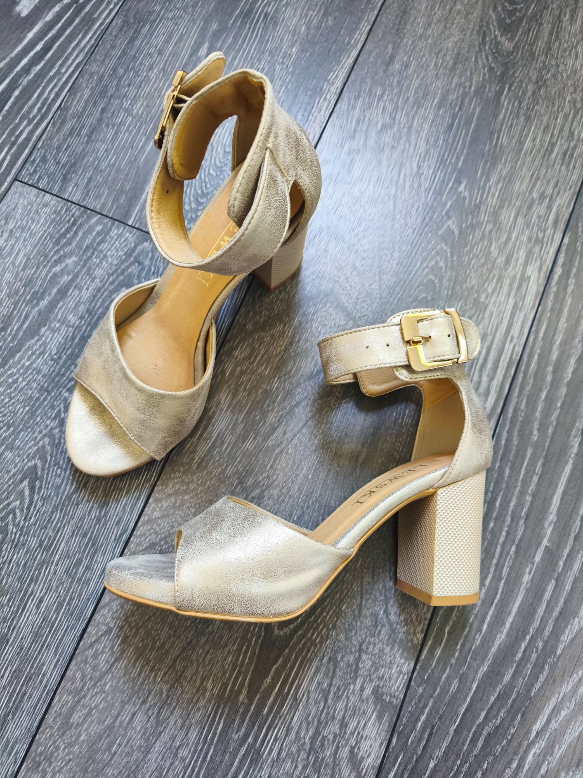 Krasne makke kozene sandalky Lewski, kvalitne velmi pohodlne vdaka hrubsiemu opatku ktory nie je vysoky. Farba je krasna bezovo-zlata. Dobre sa v nich chodi aj kvoli zapinaniu okolo clenku. Obute boli parkrat na oslave a v praci v top stave bez poskodenia. Jedina mala nedokonalost je na poslednej fotke, ako je stielka tak akoby sa kusok odliepala ale drzi bolo to tak uz od kupy. Noseniu to vobec neprekaza a dalo by sa to casom aj lahko zalepit komu by to vadilo. Povodna cena bola vysoka.