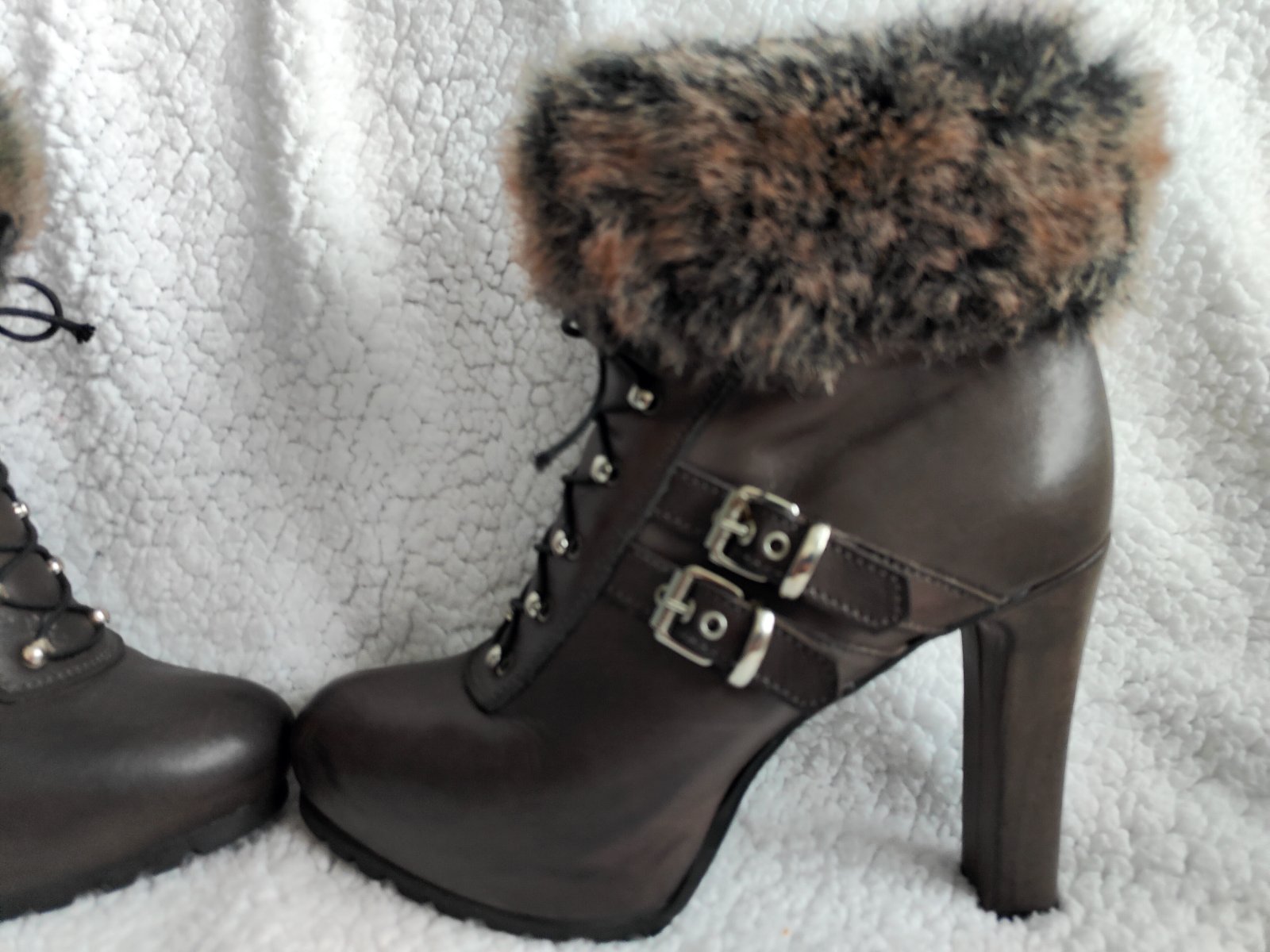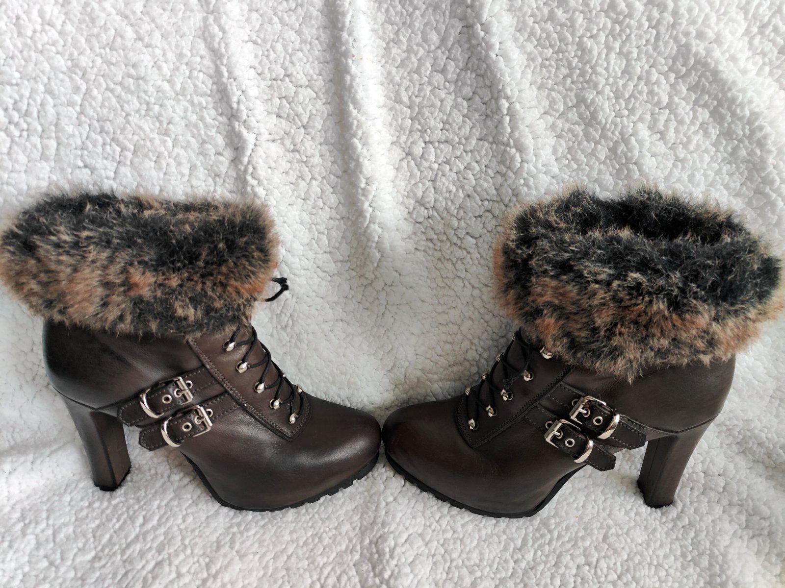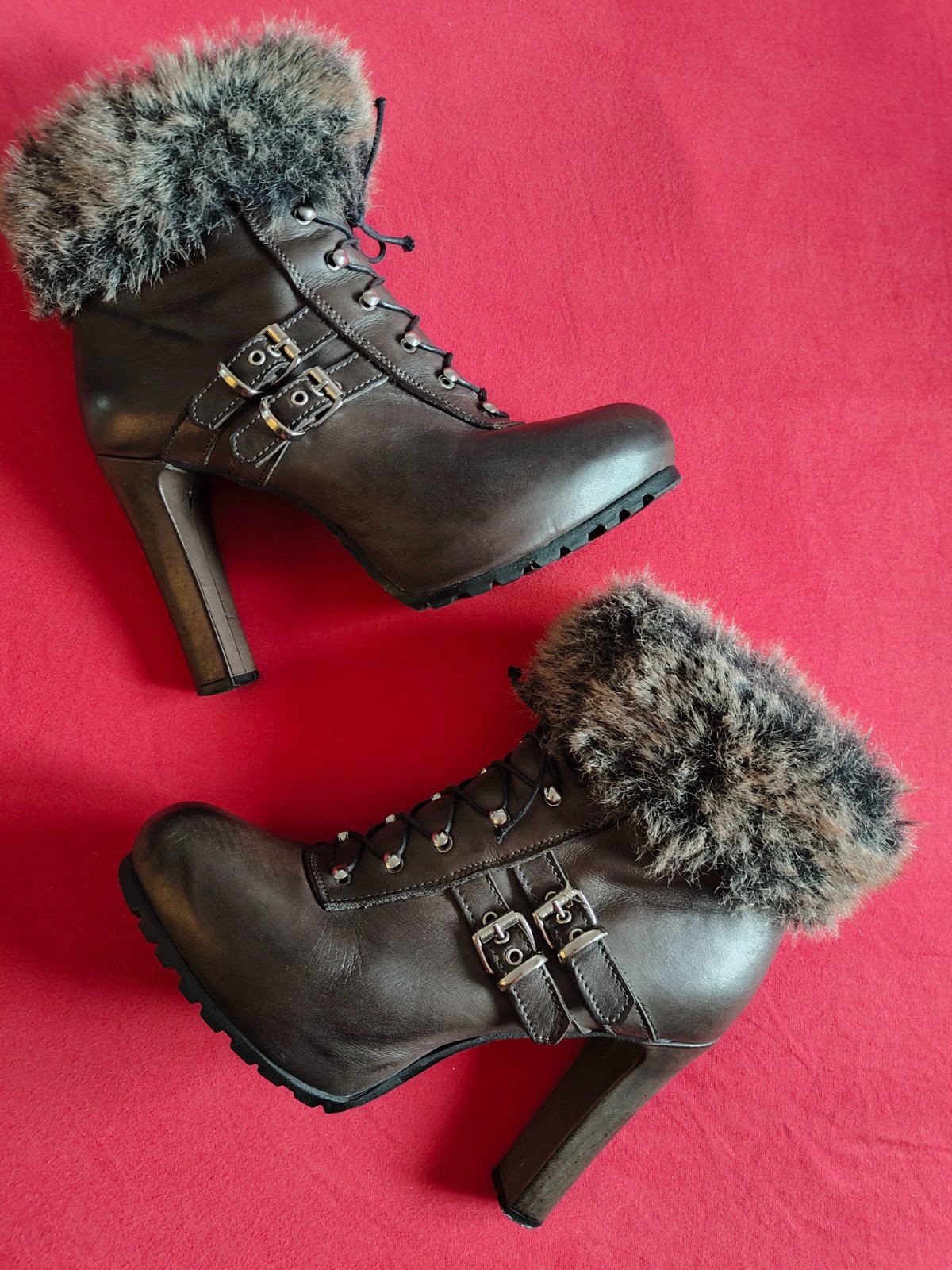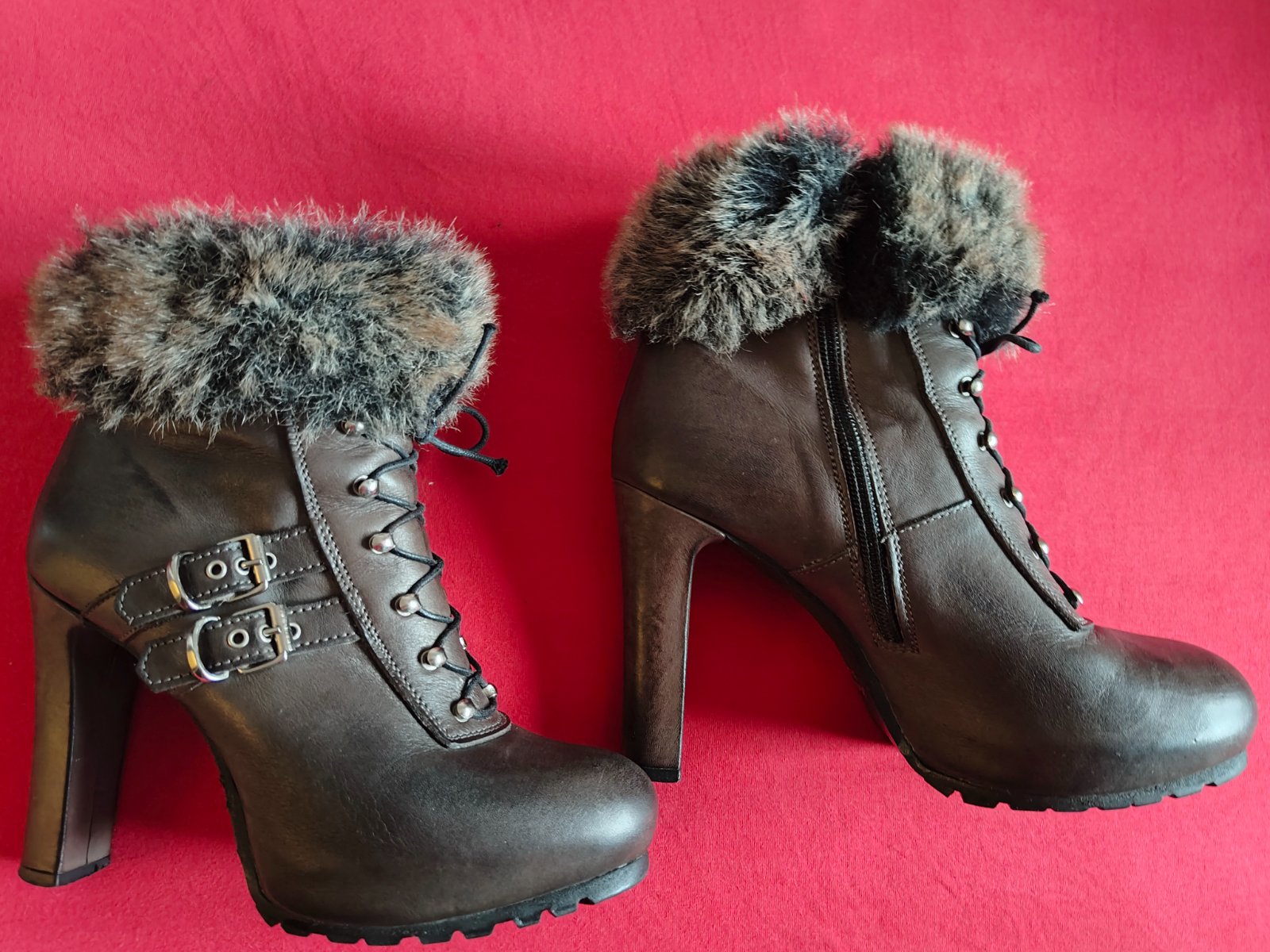 Členkové čižmy z pravej kože lemované kožušinkou. Na boku sa zapínajú na zips. Farba šedo-hnedá, veľkosť 38, vnútorná dĺžka 24,5cm. Vyrobené v Taliansku. Veľmi dobrý stav, boli obuté 2x. Bez schodenej podrážky a pätníkov. Pätníky vykazujú len jemné opotrebovanie pri chôdzi-viď foto. Výška podpätku 11cm.