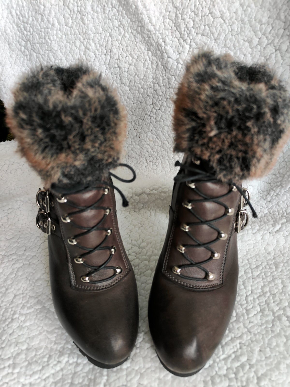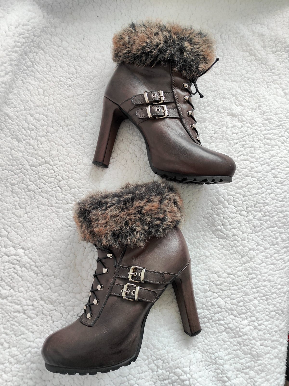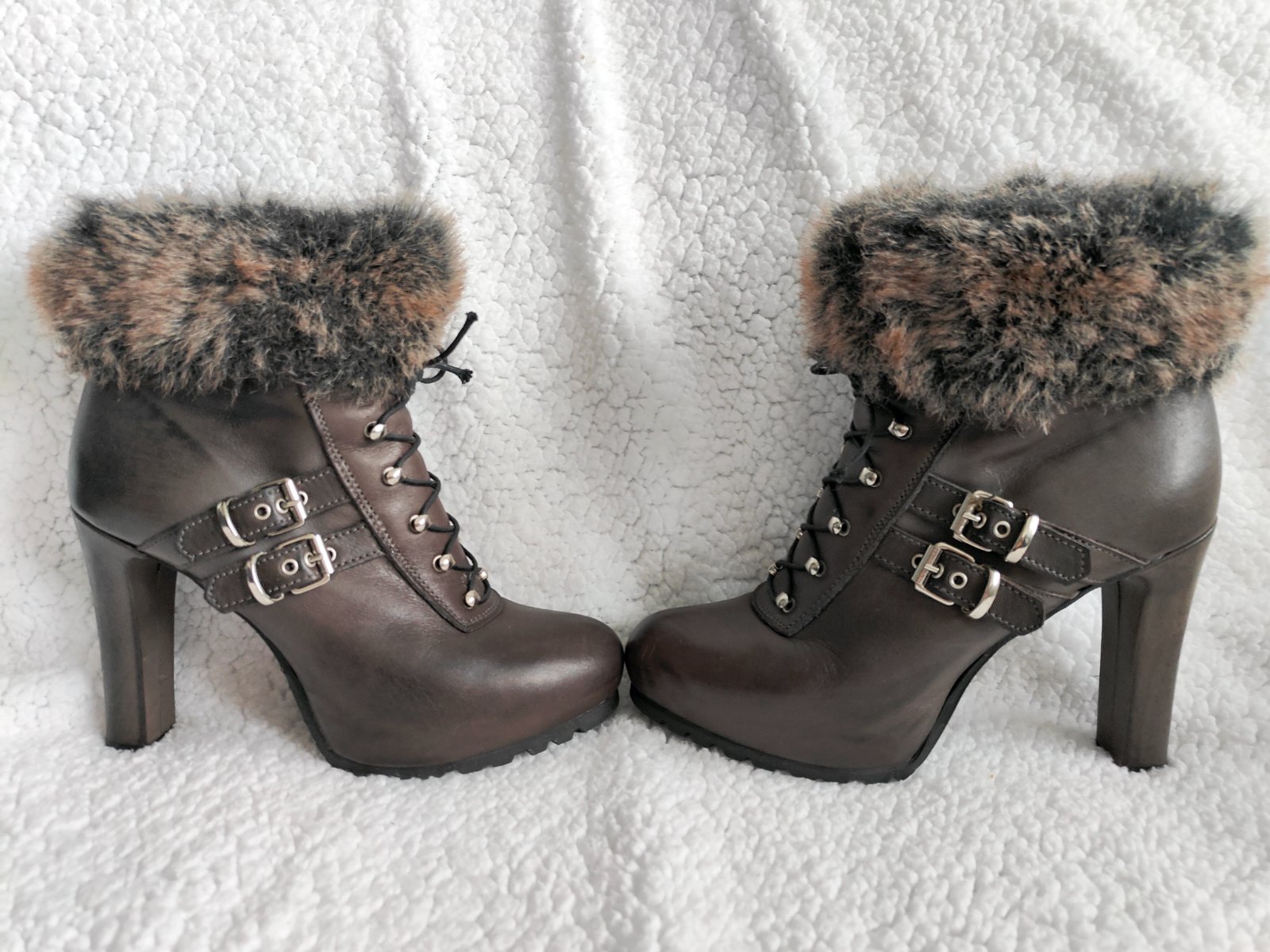 Členkové čižmy z pravej kože lemované kožušinkou. Na boku sa zapínajú na zips. Farba šedo-hnedá, veľkosť 38, vnútorná dĺžka 24,5cm. Vyrobené v Taliansku. Veľmi dobrý stav, boli obuté 2x. Bez schodenej podrážky a pätníkov. Pätníky vykazujú len jemné opotrebovanie pri chôdzi-viď foto. Výška podpätku 11cm.