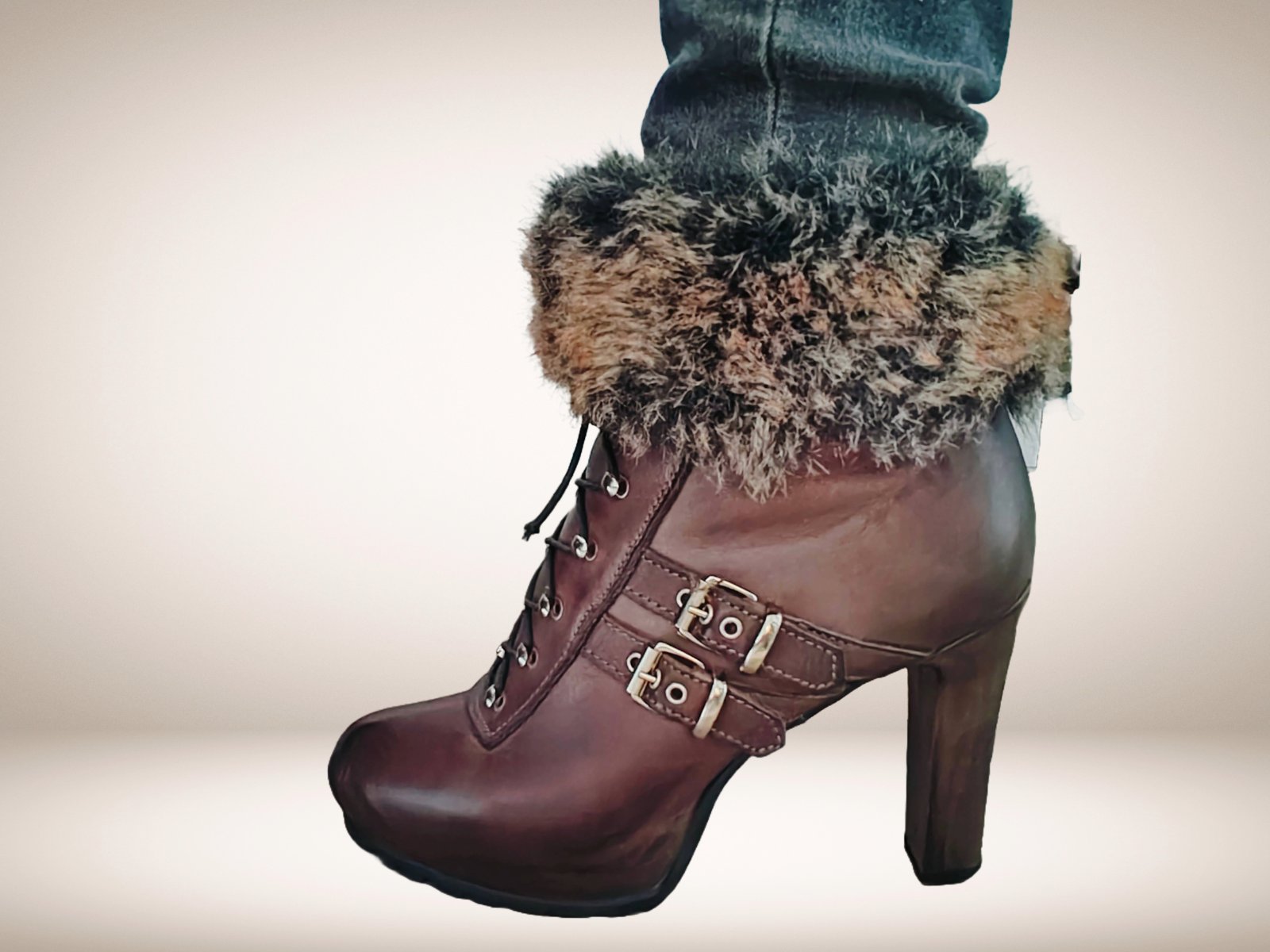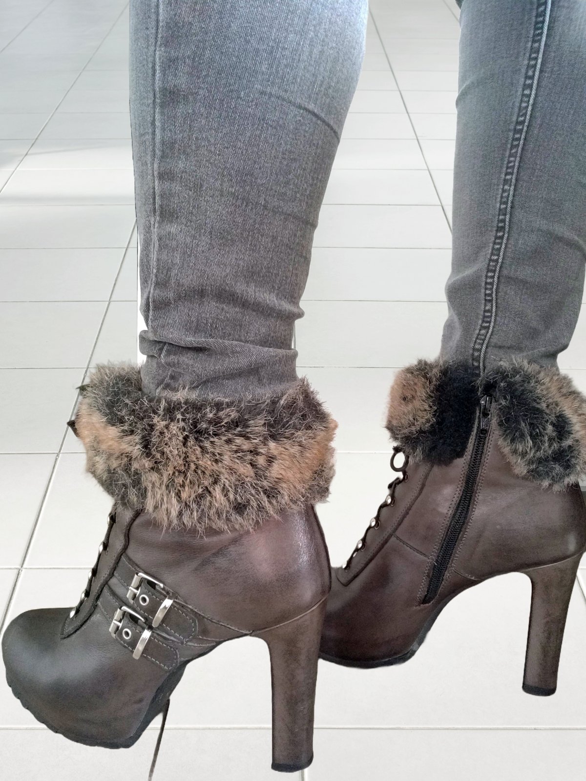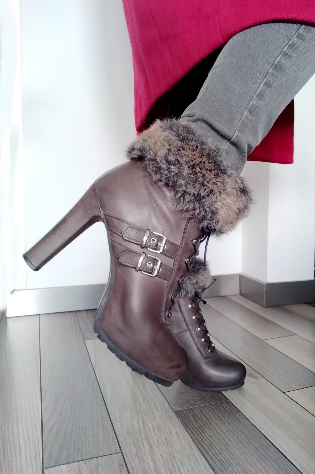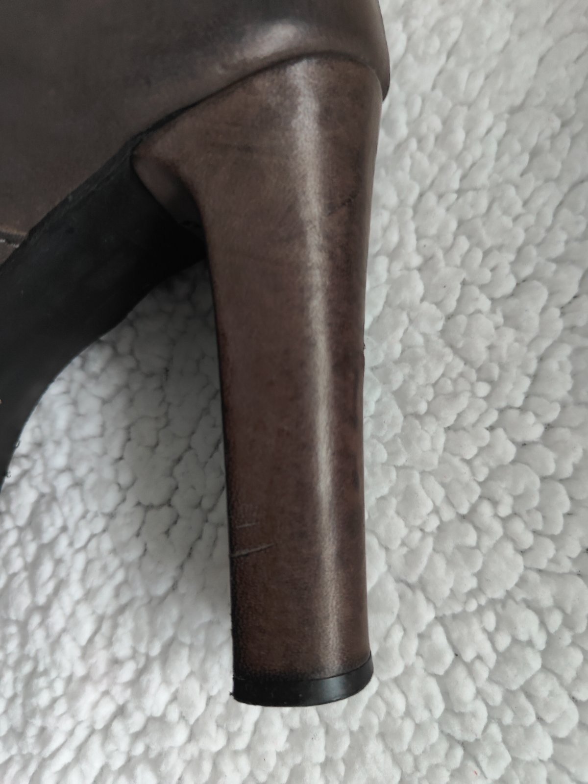 Členkové čižmy z pravej kože lemované kožušinkou. Na boku sa zapínajú na zips. Farba šedo-hnedá, veľkosť 38, vnútorná dĺžka 24,5cm. Vyrobené v Taliansku. Veľmi dobrý stav, boli obuté 2x. Bez schodenej podrážky a pätníkov. Pätníky vykazujú len jemné opotrebovanie pri chôdzi-viď foto. Výška podpätku 11cm.