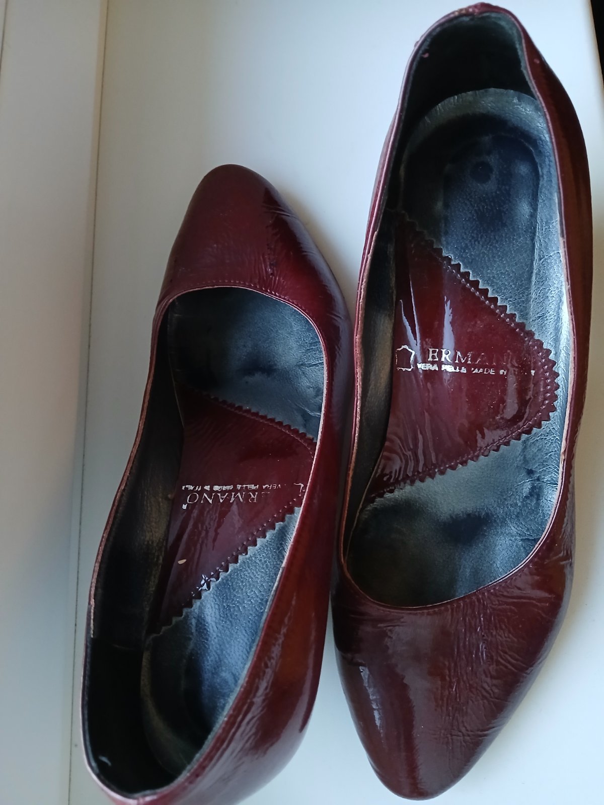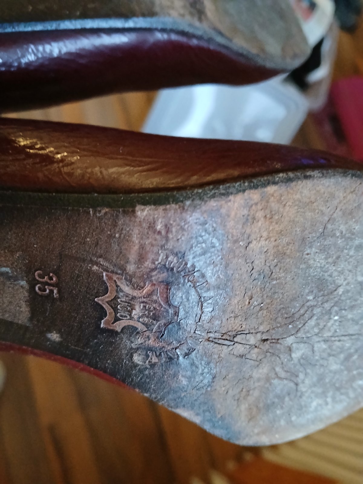 Stav pofotený - vnútro pravej topánky škrabanec, spodok topánok vidno chodenie,opätky trrba určite vymeniť. Inak žiadne poškodenie