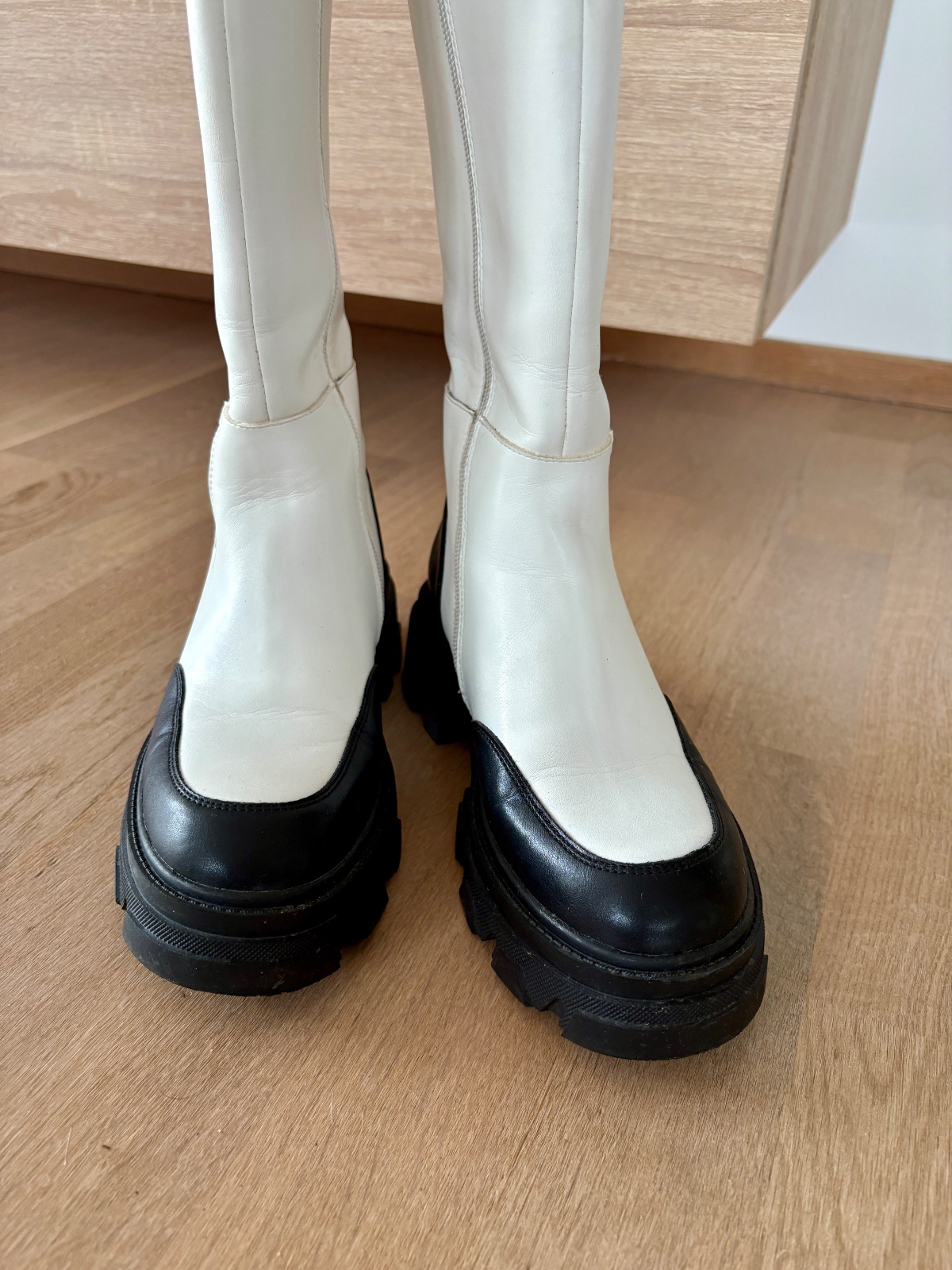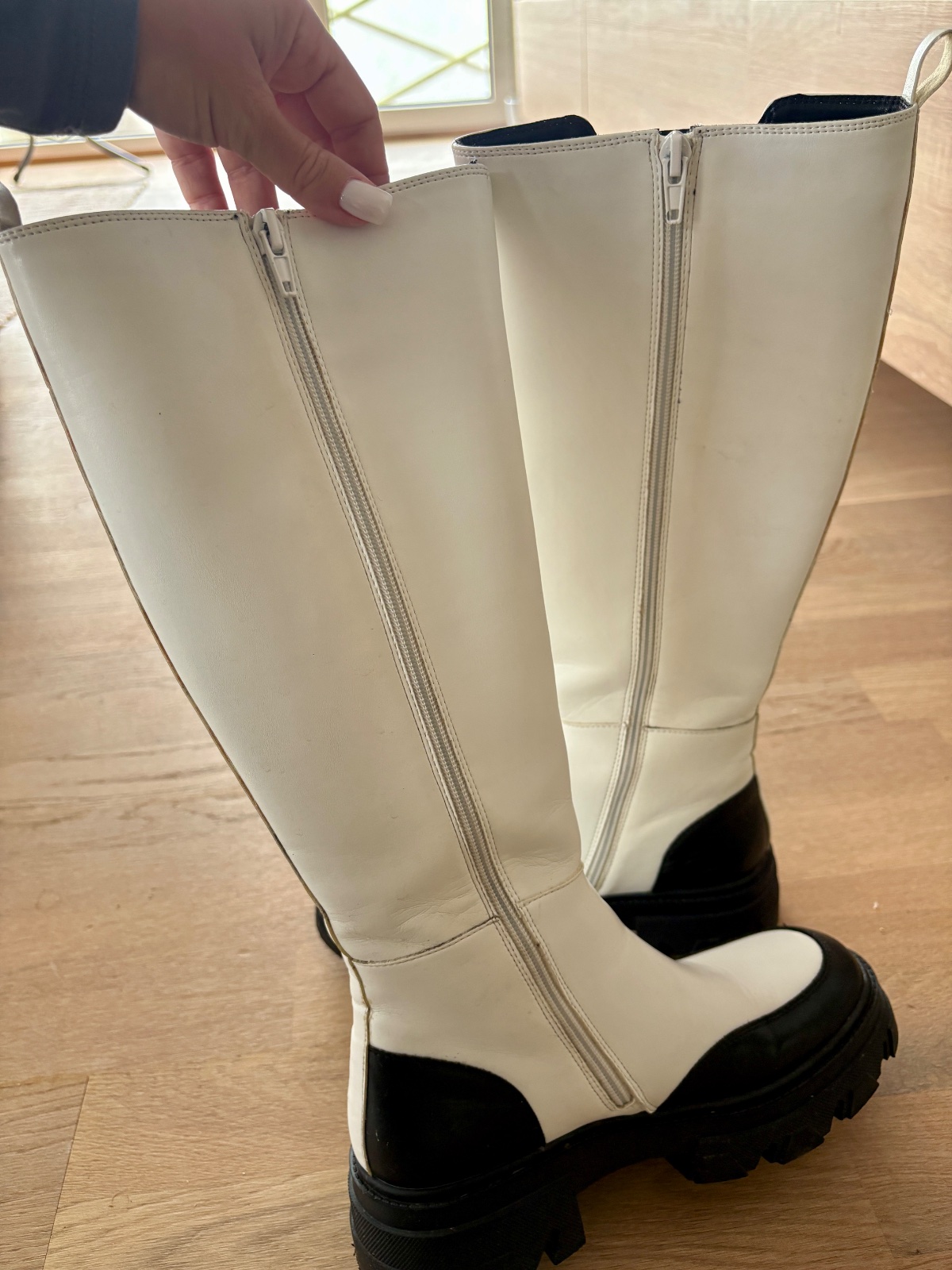 Krásne biele kožené čižmy. Celé zateplené barančekom. Na jednej čižmičky je odlomený kúsok bežca, ale dá sa zapínať. Vnútorná dĺžka 21 - 21,5 cm. Mne žiaľ už úzke. Inak by som ich nepredávala.