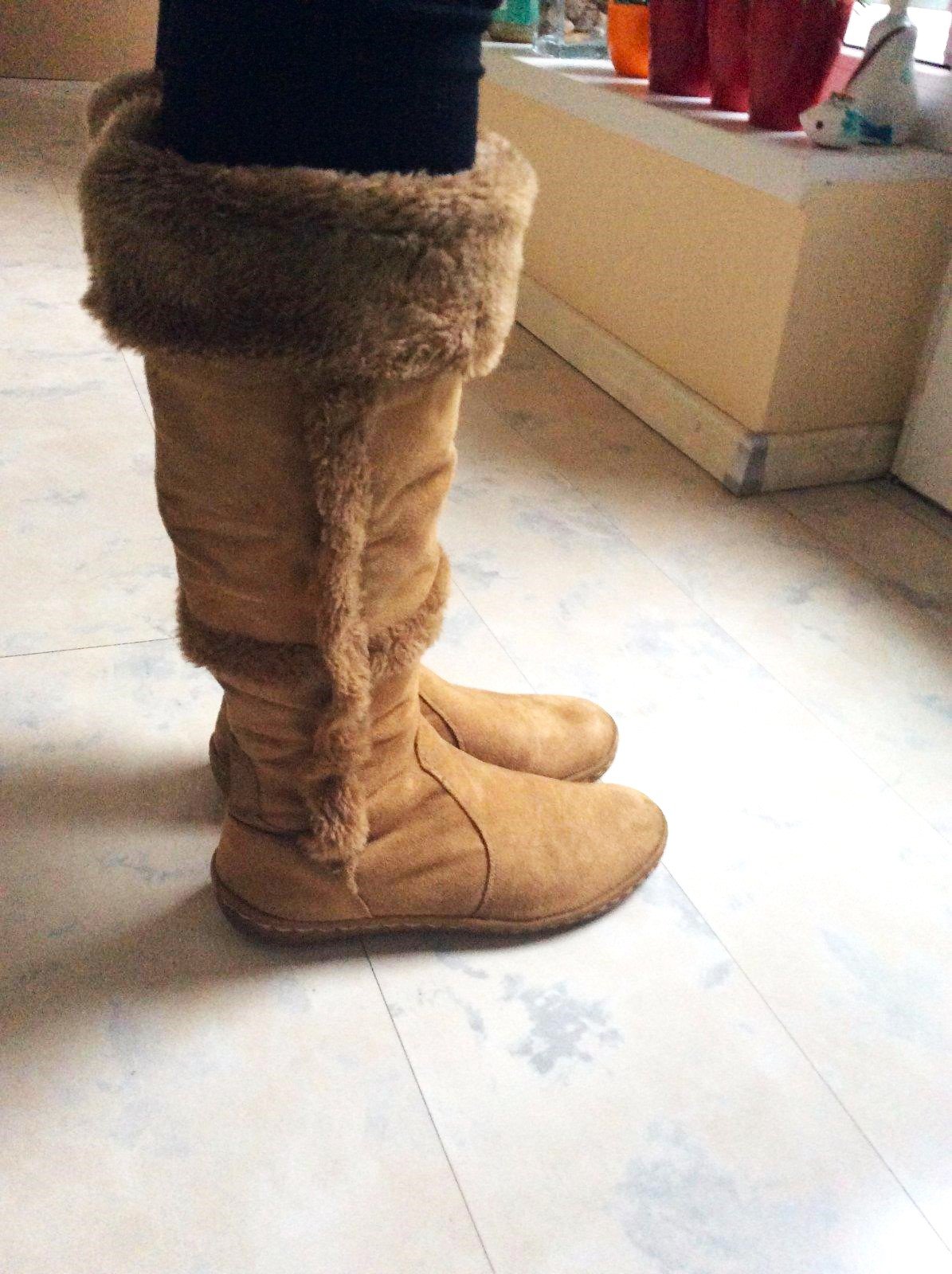 nosené ľahké športové čižmy,látková imitácia semišu,na spodku surová guma, teplé - zateplené jemným molitanom,zdnuka zipsy ( nie po celej dlžke )pre lepšie obúvanie,krásne sa čistia,vhodné aj na č. 39, vnút. dlžka 26 cm,horný obvod meraný pod kožušinkou = 20 x 2 cm,výška od podrážky = 38,dajú sa predlžiť vyhrnutím kožušinky ( 8 cm ) - v prípade veľkej zimy sa manžetky dajú ľahko vyhnúť až na kolená
