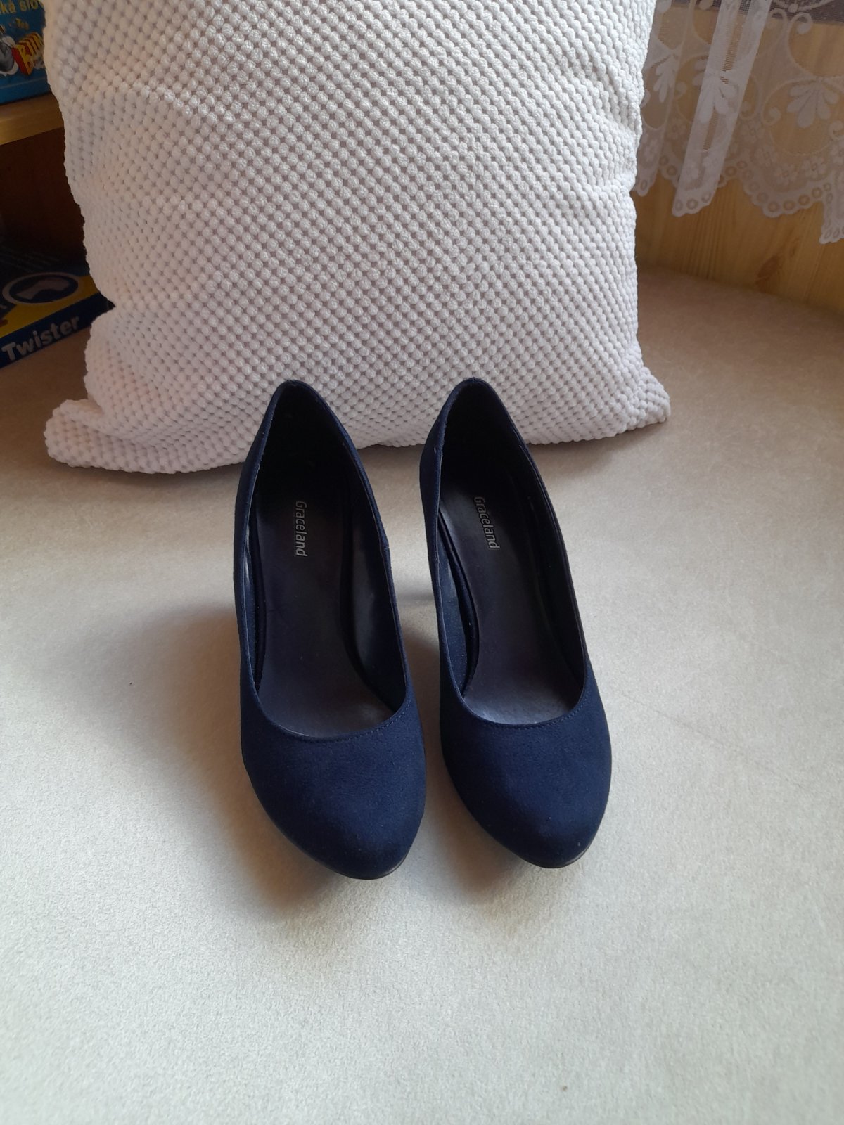 Krásne tmavomodré semišové lodičky na platforme boli ubute raz v sále