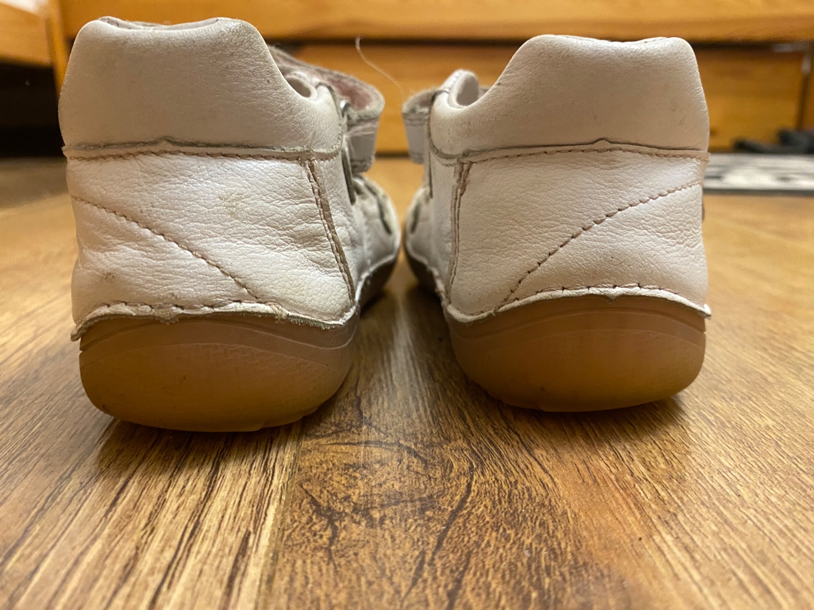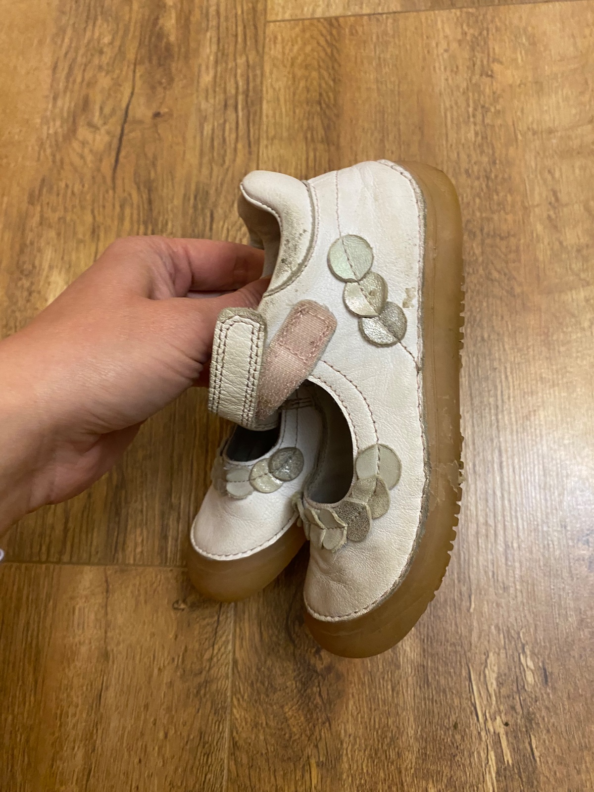 Nízke barefoot celokožené topánky. Farba je jemná perleťová s detailom kvietkov. Vhodné na bacuľaté nôžky. Vnútorné rozmery: 26: 16,5 x 6,7 cm 27: 17,3 x 6,9 cm 28: 17,9 x 7 cm 29: 18,5 x ...