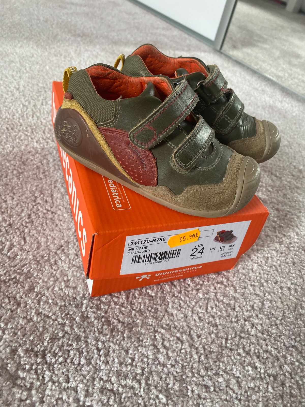 Topánky majú fľaky a na jednom kúsku sa šúpe farba. Ale na dvor sú super, sú stále pevné, nezoslapane, ortopedická stielka, veľmi vhodné na prvé kroky. VD 15 cm