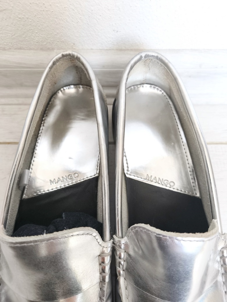 Ponúkam tieto kožené mokasíny zn. Mango, striebornej farby, výborný stav, veľkosť uvádzaná 38, ale sedí aj podľa vnútornej dĺžky ktorá je 24cm, na veľkosť 37.