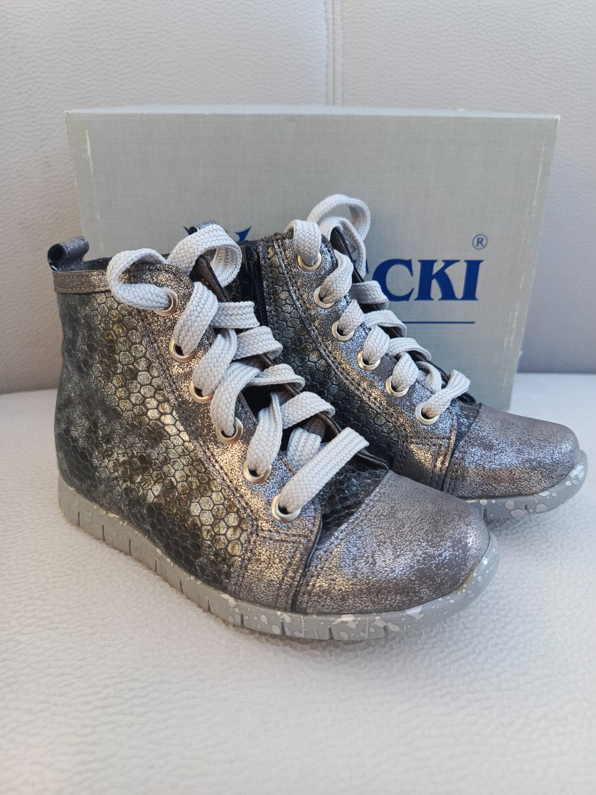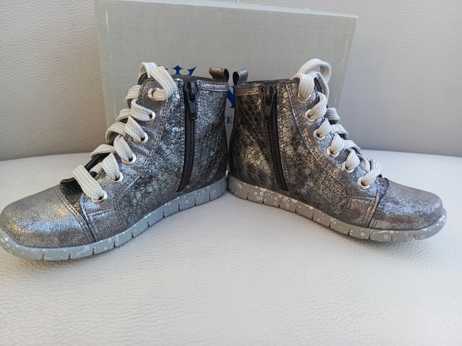 Predám krásne dievčenské topánky v lesklej striebornej farbe s holografickým efektom. Na vrchnej časti je veľká trblietavá hviezda. Vďaka gumičke po bokoch sa ľahko obúvajú aj vyzúvajú. Vnútorná dl...