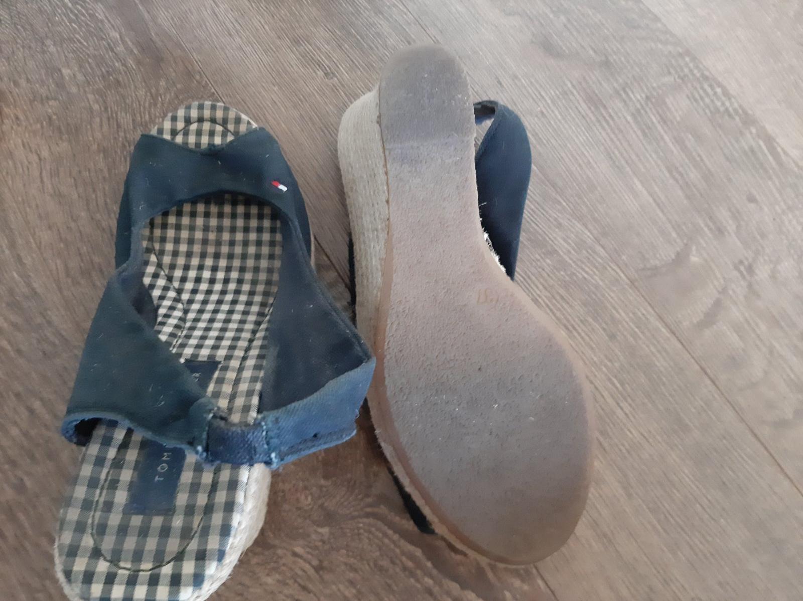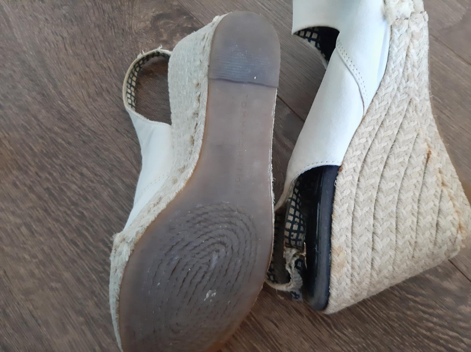 Noseny stav,pre uraz clenka uz nemozem nosit opätky, posuvam.Kremove, tmavo modre a svetlo modro biele.Platforma vpredu na tmavo modrych a kremovych 2 cm, pri päte 9 cm.Na modro bielych vpredu 2,5 cm a pri päte 8 cm.Cena za vsetky spolu s postou je 26 eur s postou.Po kuse je 14 eur s postou.