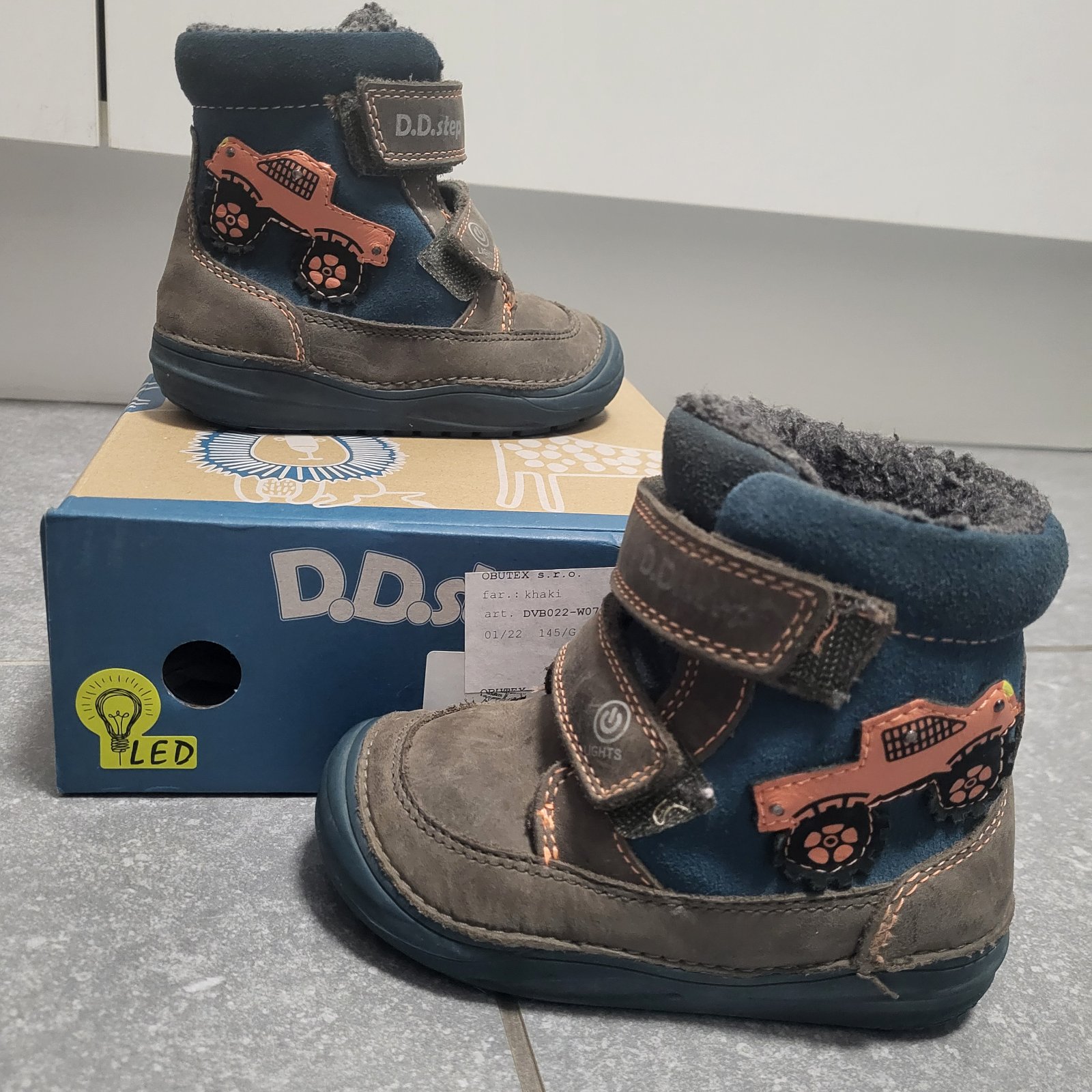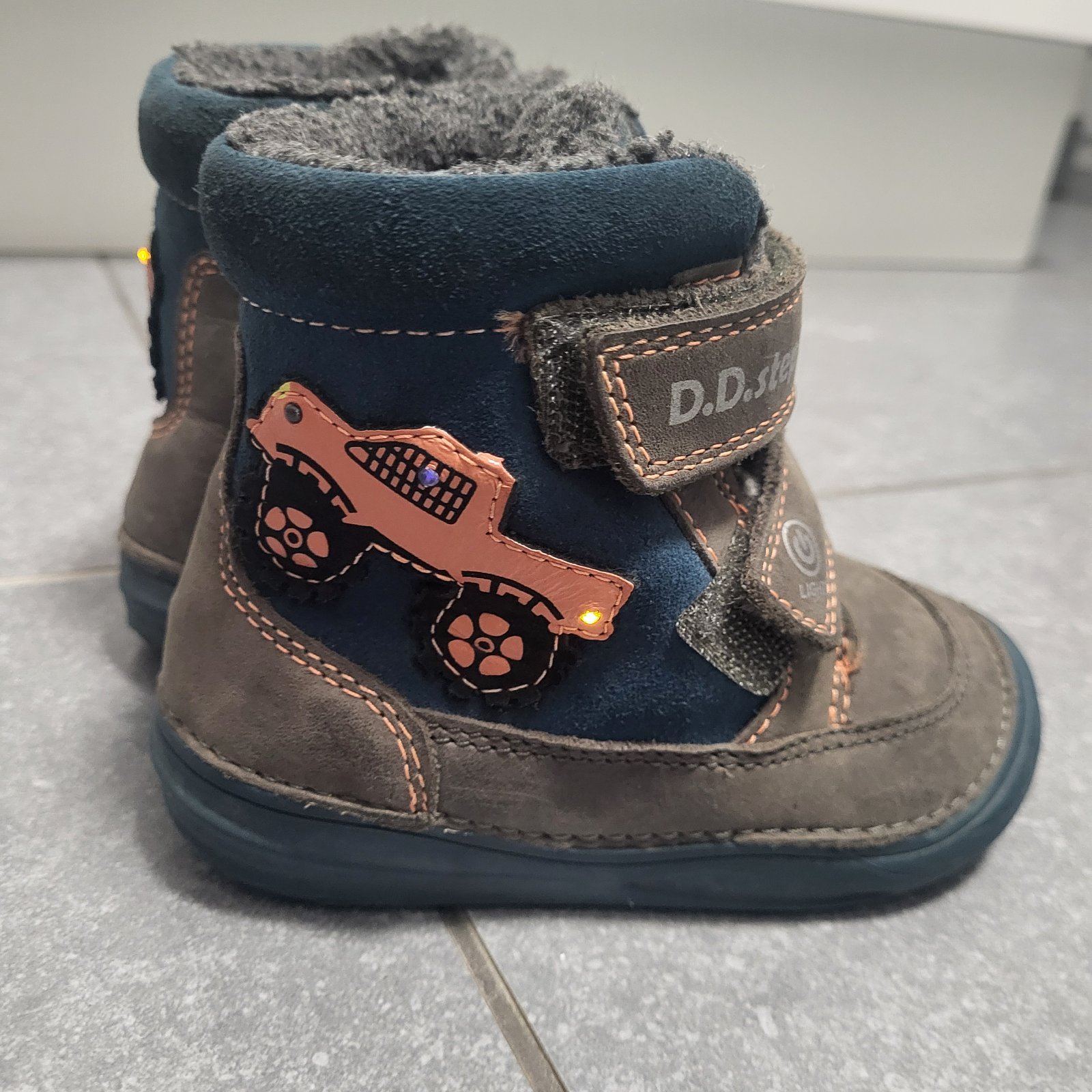 Teplučké pohodlné topánočky D.D.Step veľkosti 23, vnútorná dĺžka cca 15,8 cm, vnútorná šírka cca 6 cm. Topánočky sú led, ale momentálne blikajú na každej topánočke už len dve diódky z troch (nosené pred dvoma rokmi).