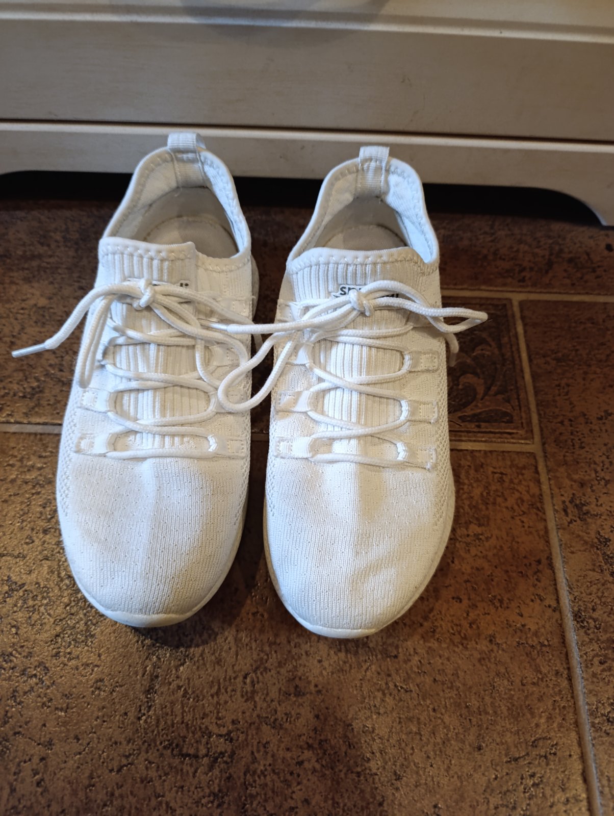 Kupované 09/2024, ešte v záruke. Nosené len na TV, stále v super nosenom stave, len jemne šuchnutie vpredu, ale nič viditeľné. V pohode aj do školy na telesnú ešte. Super praktické zapínanie na gum...