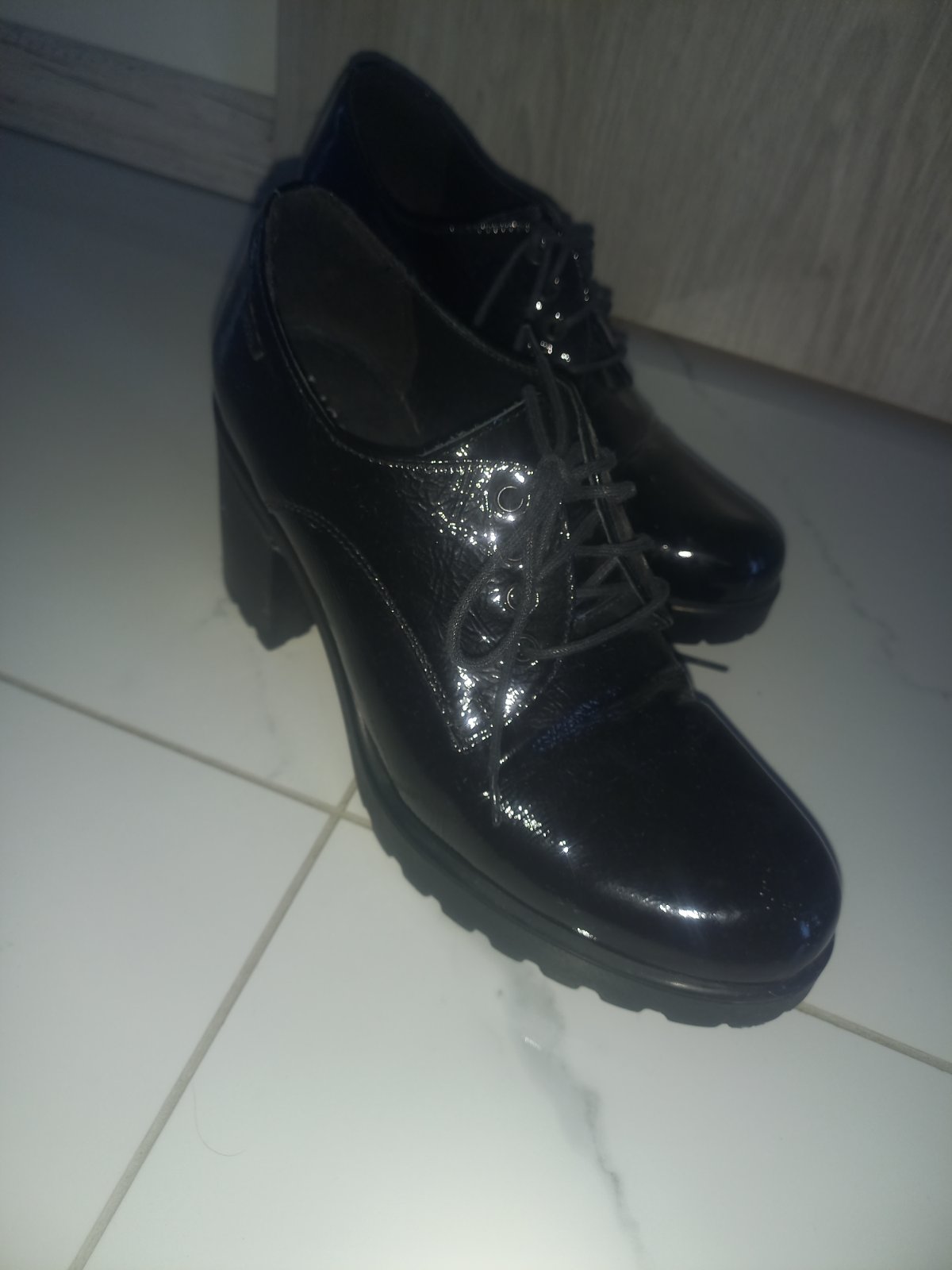 Vpredu a vzadu lakované, po bokoch brúsená koza. Obuté raz na svadbe. Mne sú veľké. Kedze menšie nemali a ja som súrne potrebovala topánky, dala som do nich kožené vložky a päticky. Náhradné opätky...