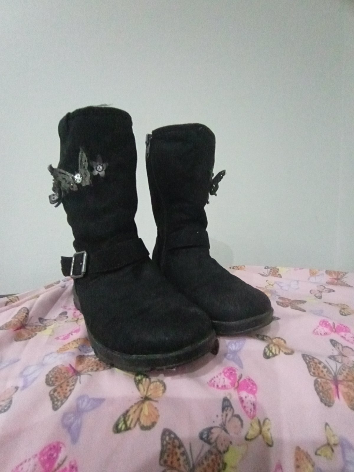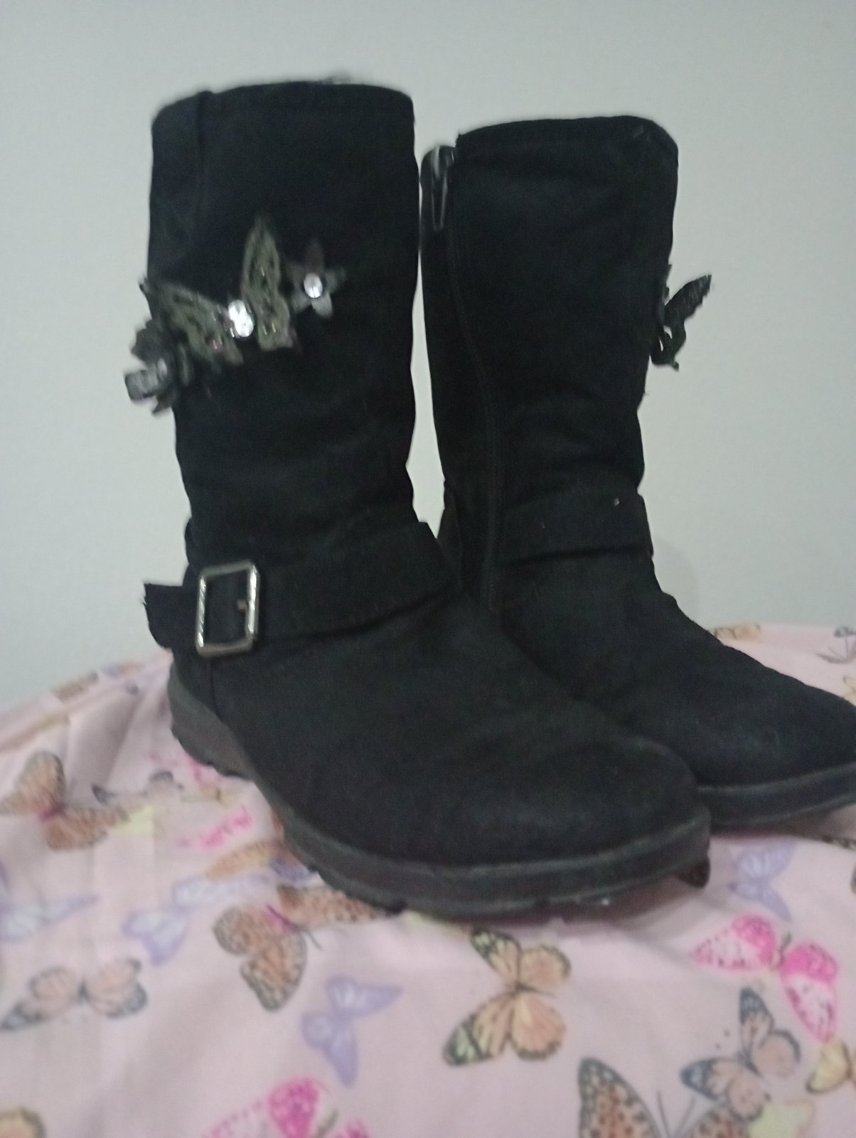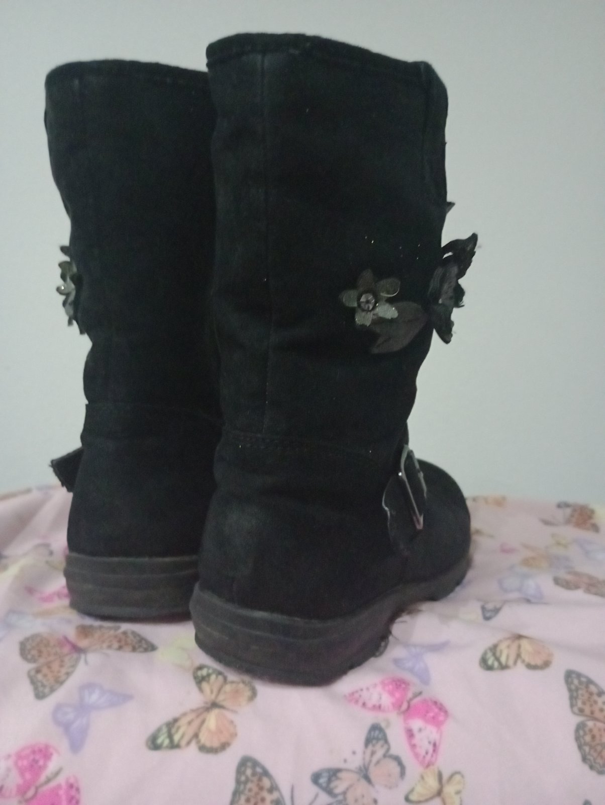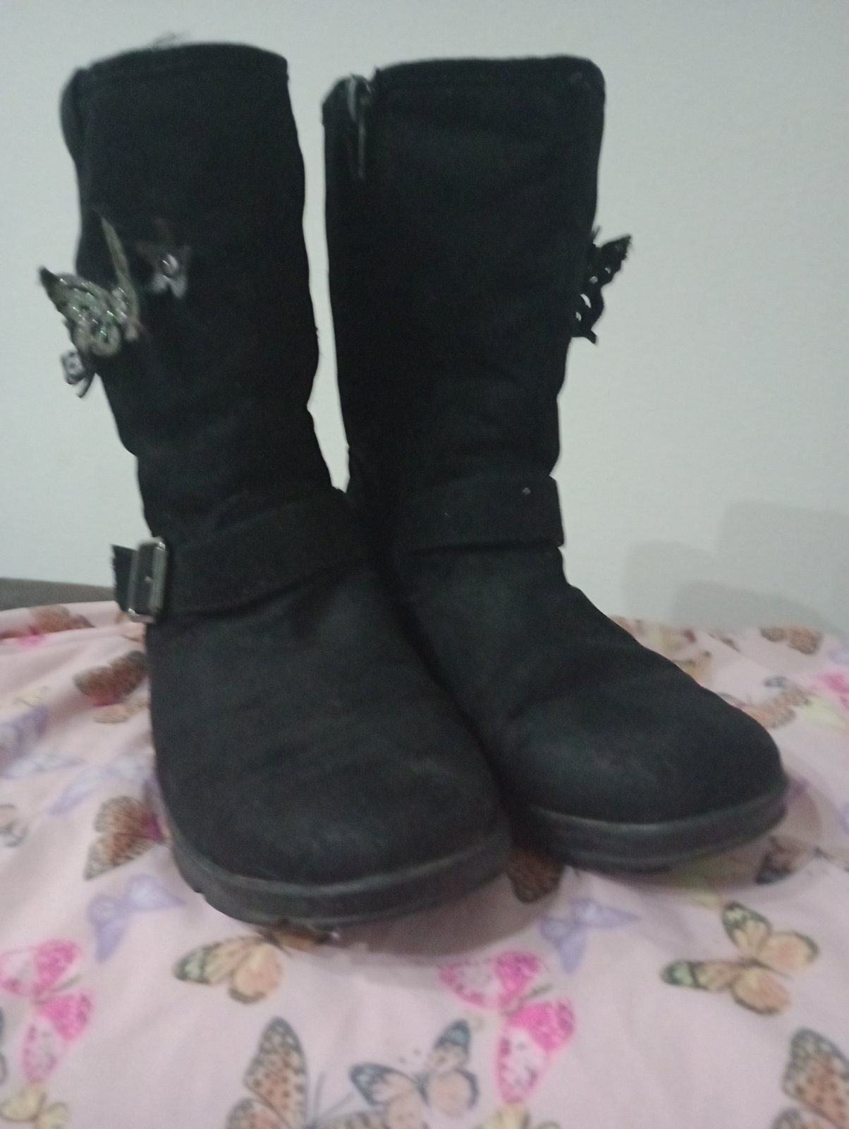V super stave, podrážka neschodena, zipsu fungujú. Na oboch vonkajších stranách motýliky a kvietky. Zateplené, veľkosť 30, VD:19 cm. Zn. Cupcake