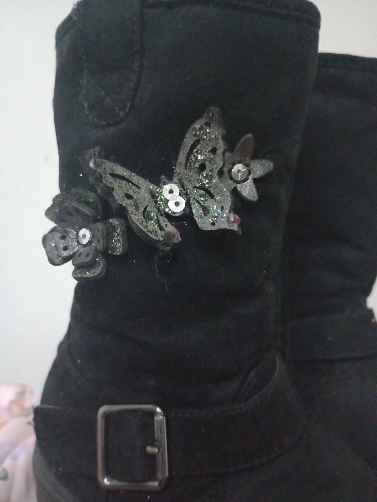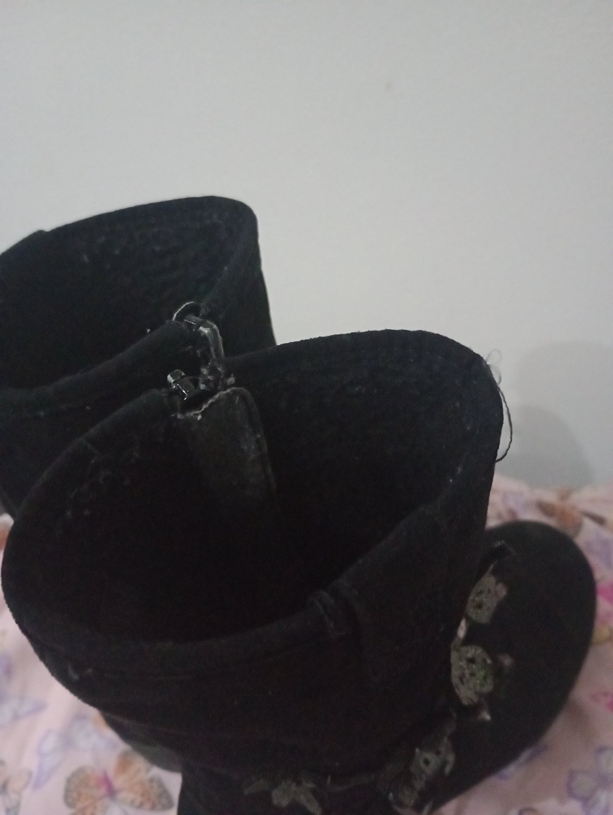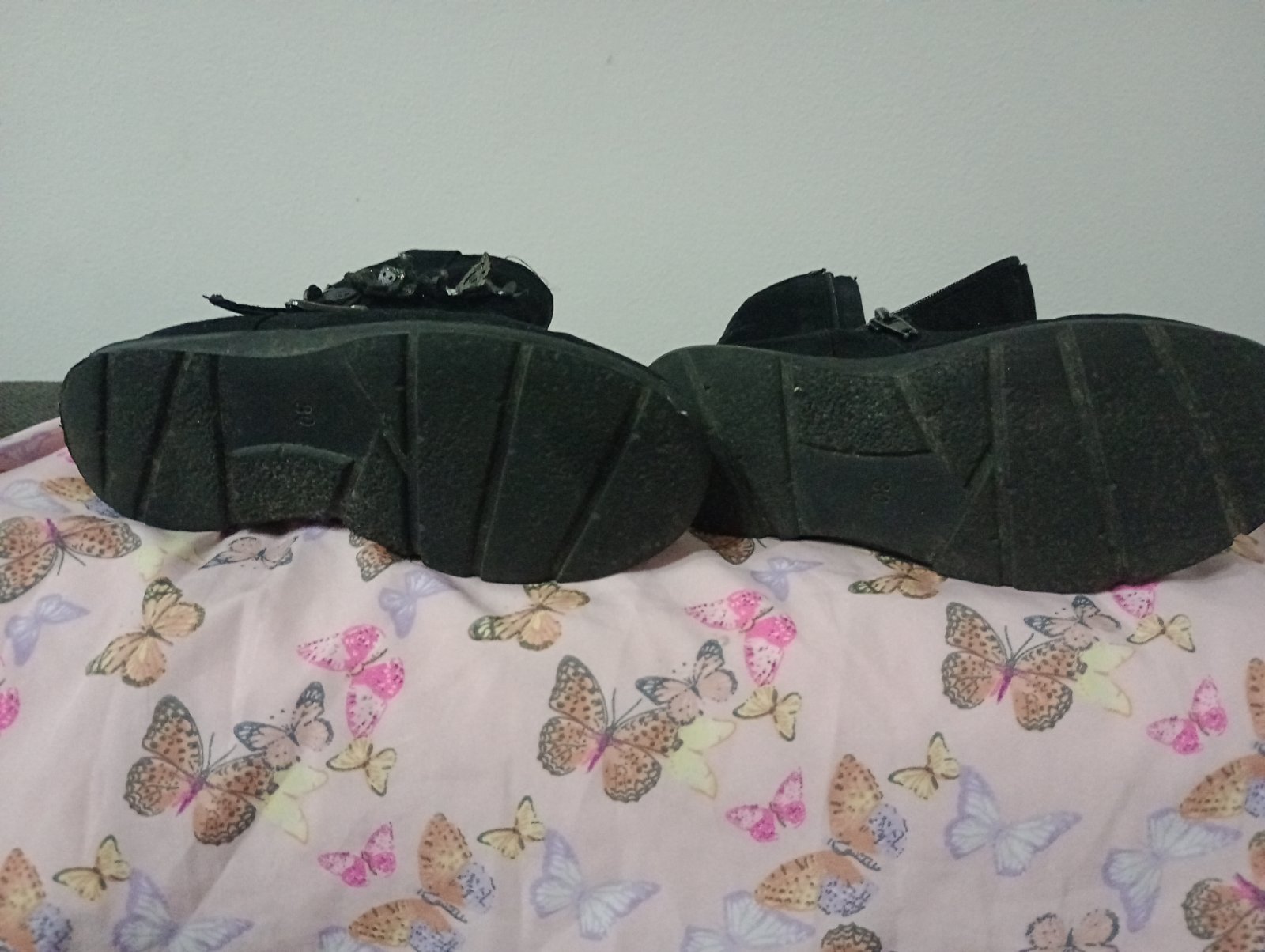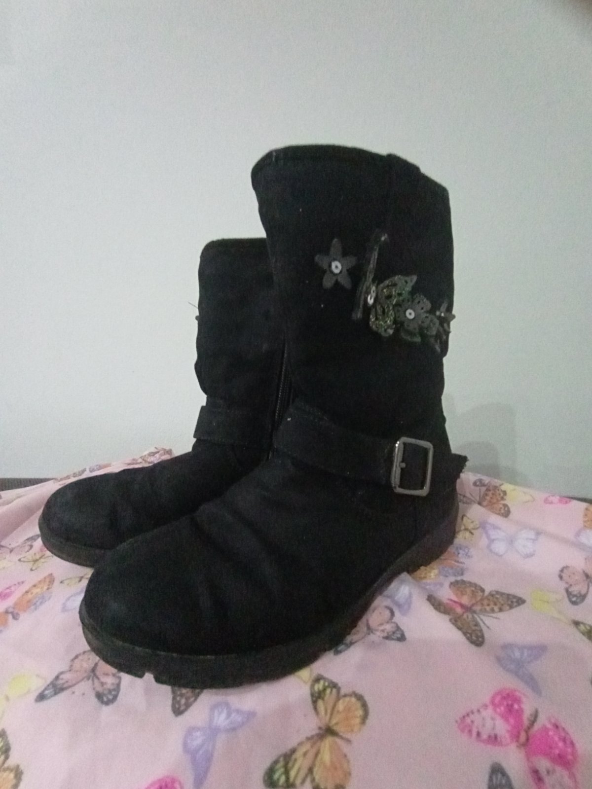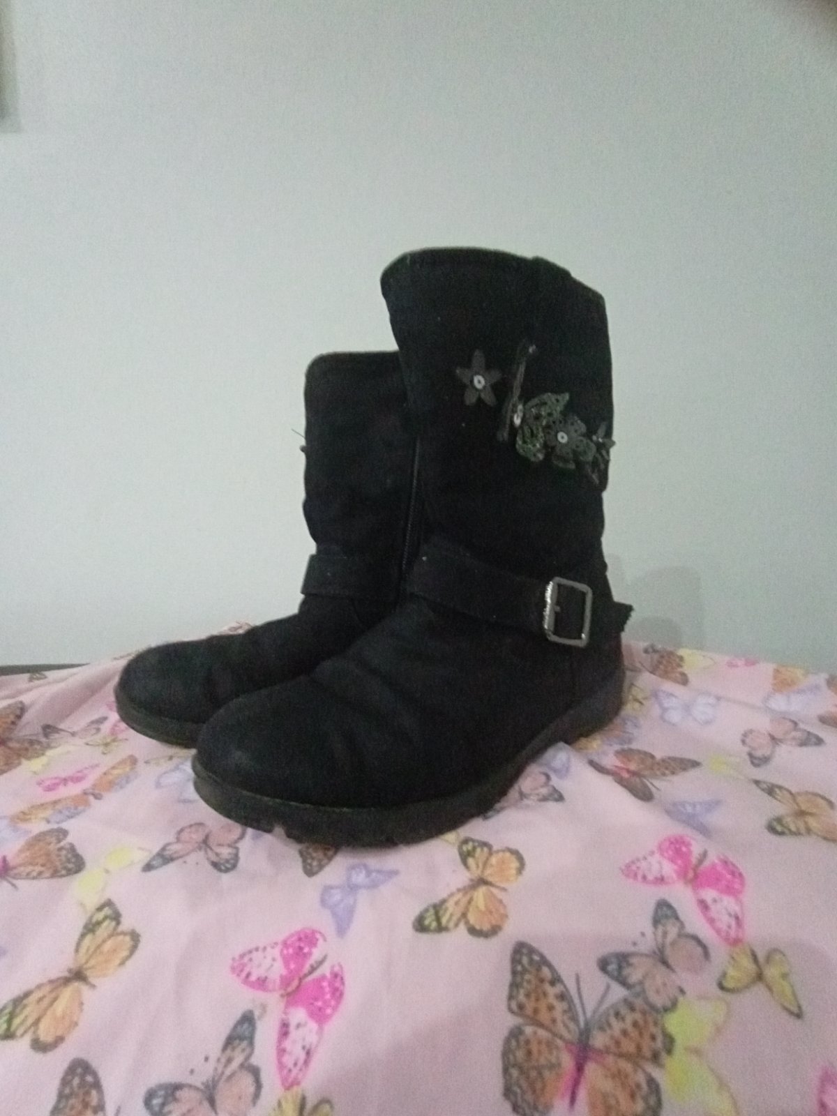 V super stave, podrážka neschodena, zipsu fungujú. Na oboch vonkajších stranách motýliky a kvietky. Zateplené, veľkosť 30, VD:19 cm. Zn. Cupcake
