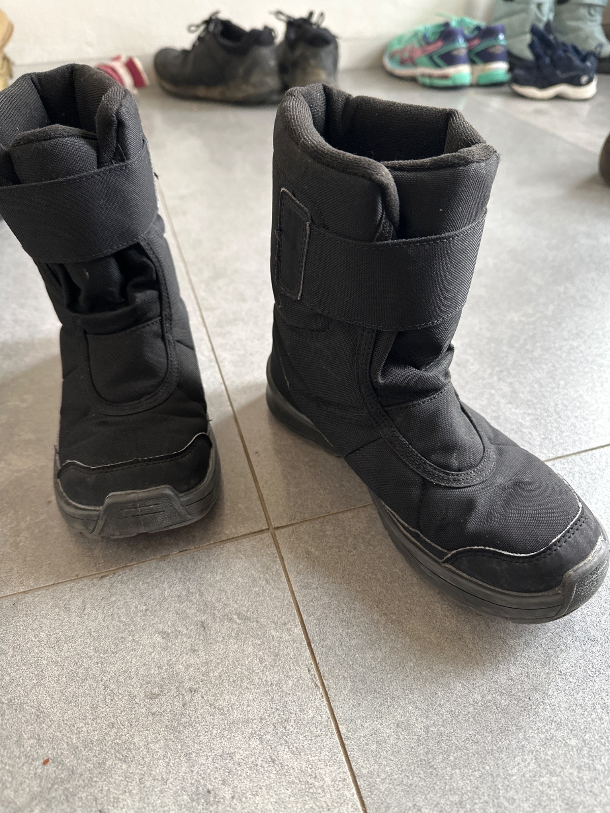 Predám v dobrom nosenom stave čierne nepremokavé snehulky, má jednej je trosku odlepená špička, ( viď. foto) ale na sankovacku a do školy ešte poslúžia