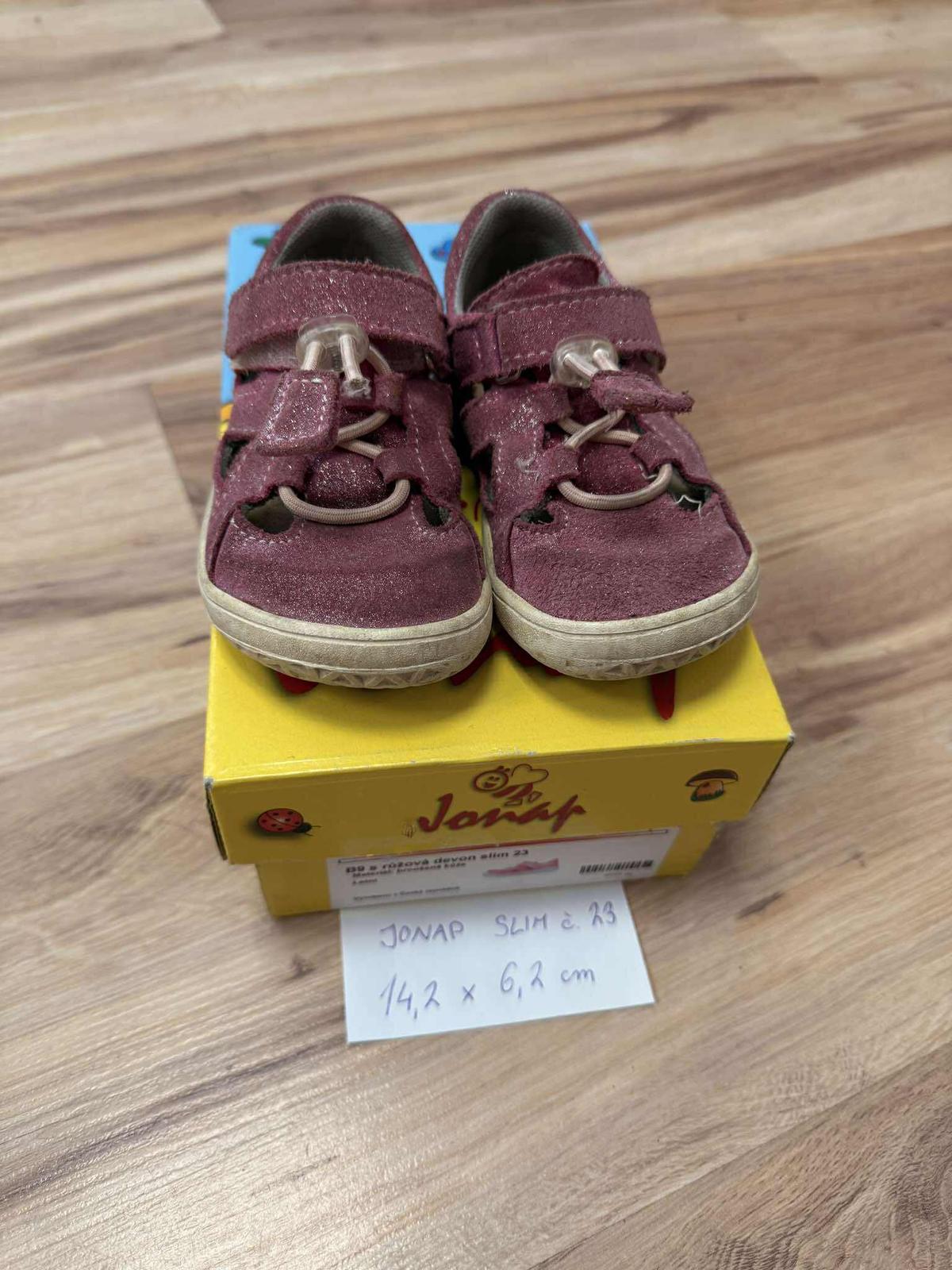 Predam detske barefoot sandalky zn.Jonap c.23. Zachovale, bez funkcnych poskodeni, len ten vrsok je uz vyblednuty. Podrazky vyrazne neschodene, paty mierne zosuchane. Stav je podrobne nafoteny. Su...