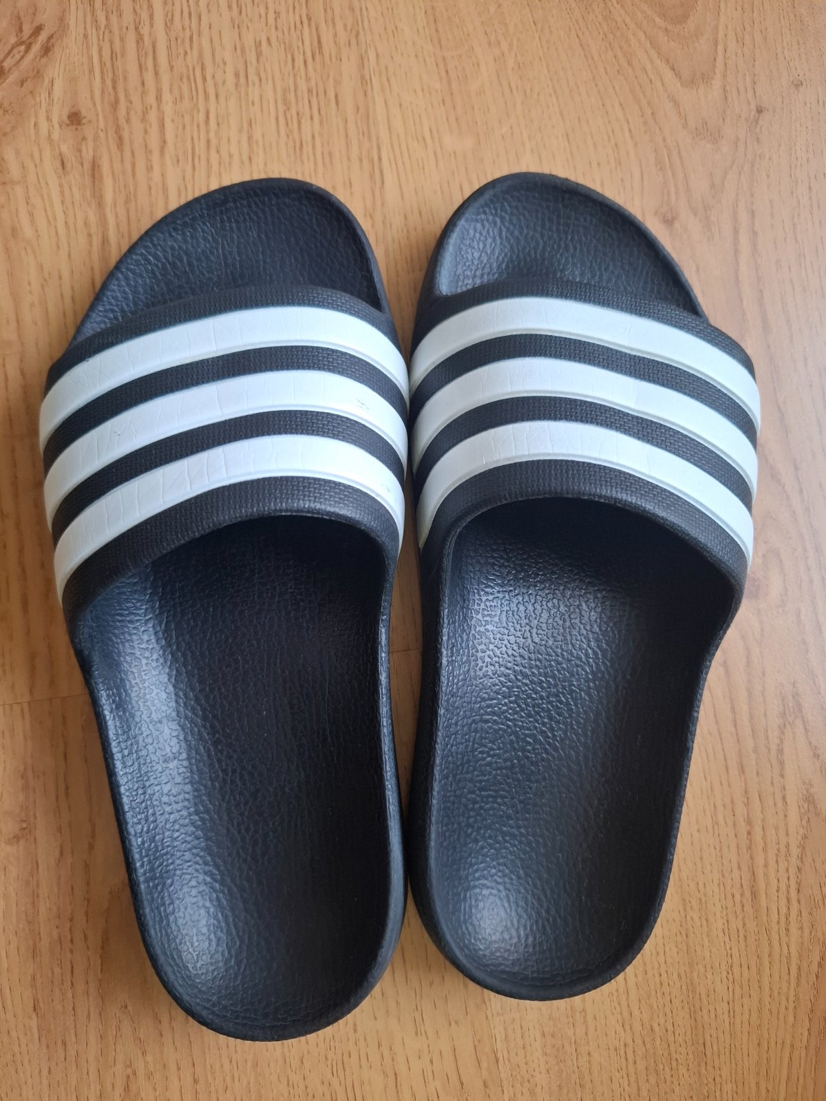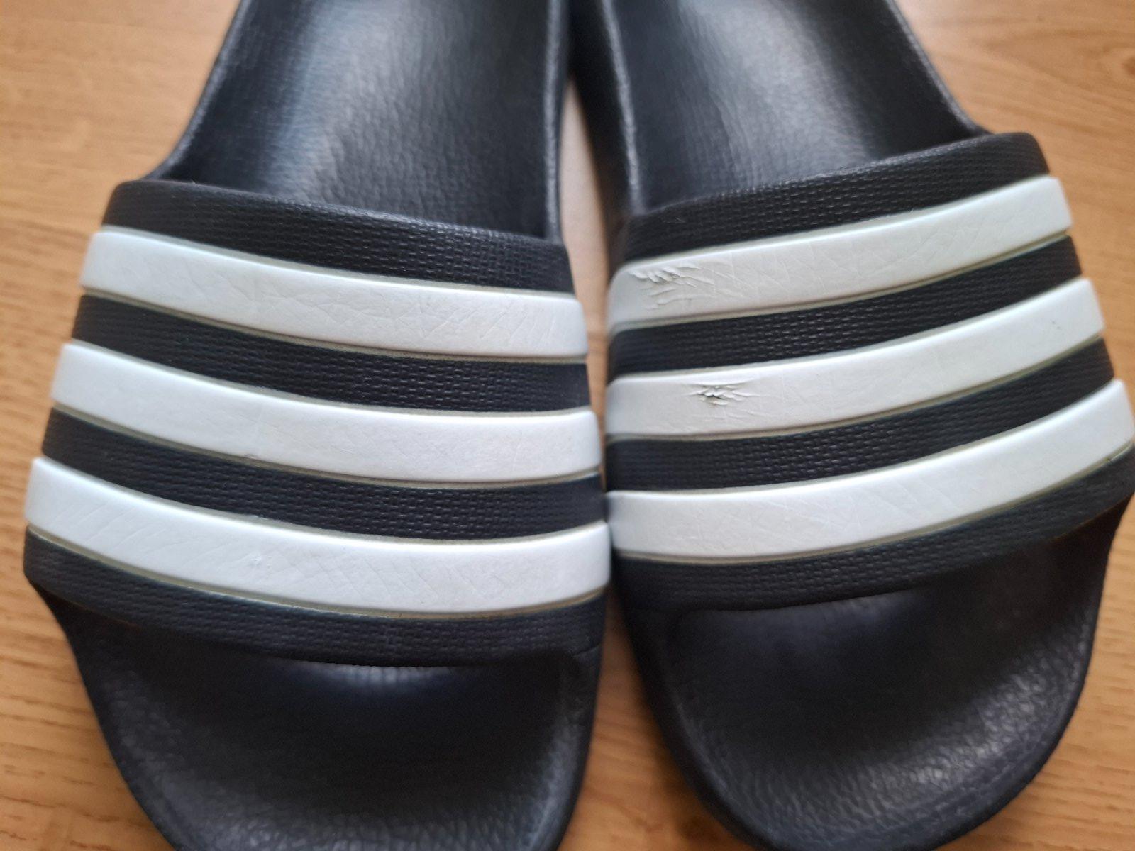 Iba trochu popraskané na ľavej šľapke na bielom pruhu.