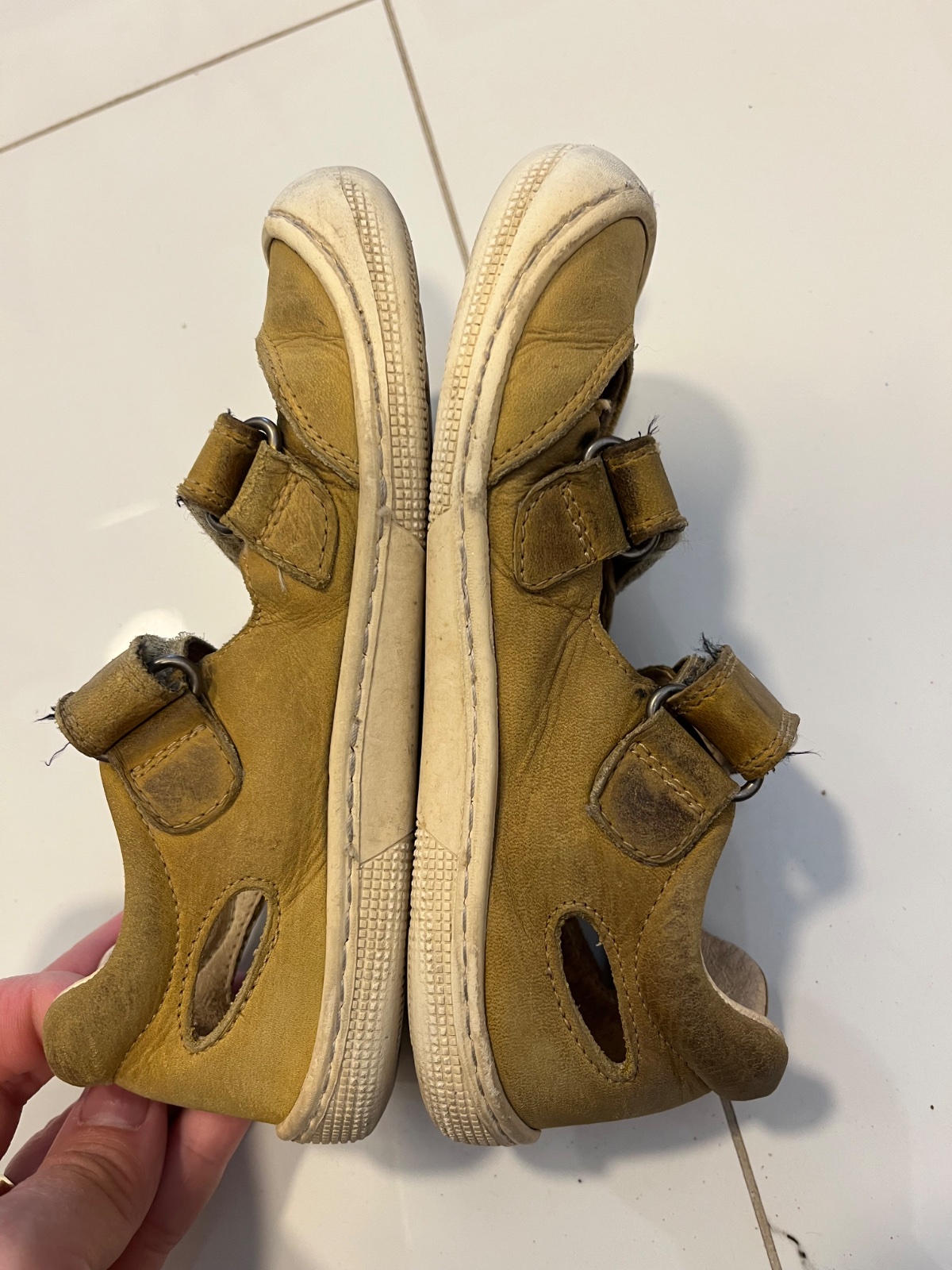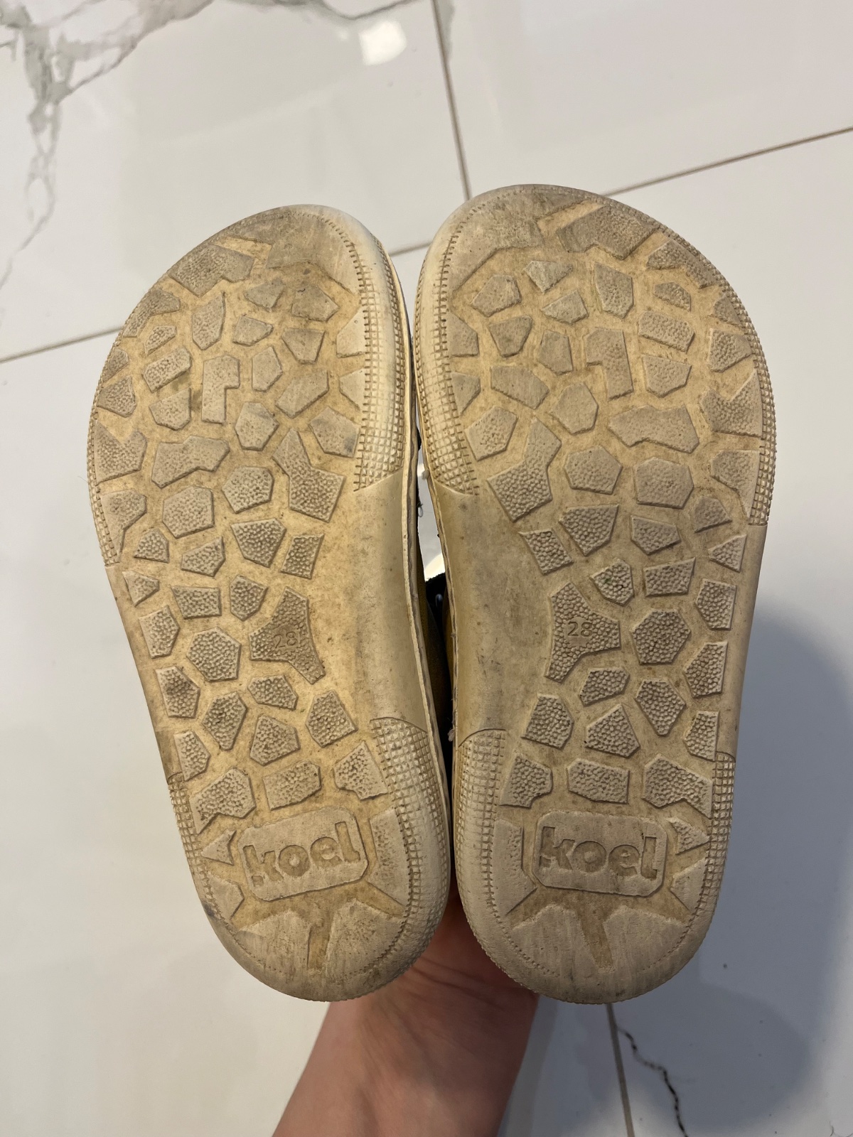 Barefoot sandále Koel4kids, nosené jedným dieťaťom. Je to vegánska koža a žiaľ pustili farbu, inak plne funkčné. VD 18,0. Posúvam za symbolickú cenu.