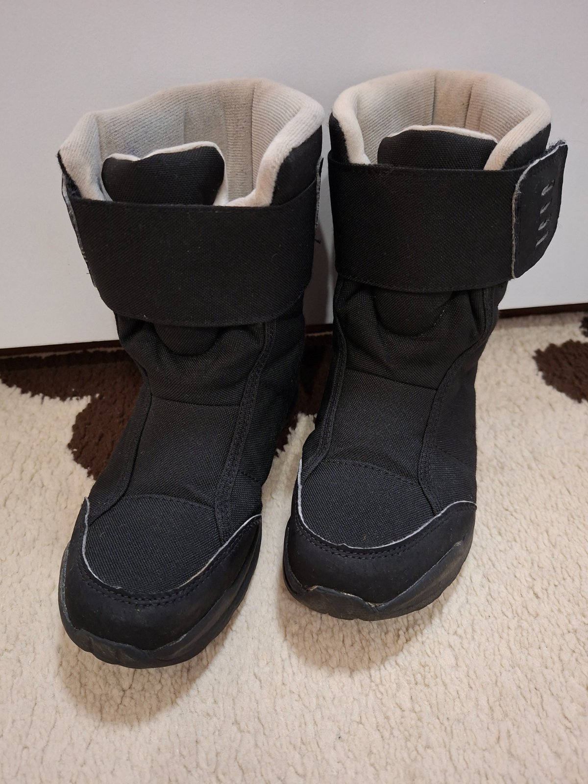 Ponukam par krat obute neposkodene detske zimne zateplene topanky, znacka Decathlon, velkost 33. Topanky su vyrobene z nepremokaveho materialu v ciernej farbe s hrubou podrazkou, so zateplenim, s u...