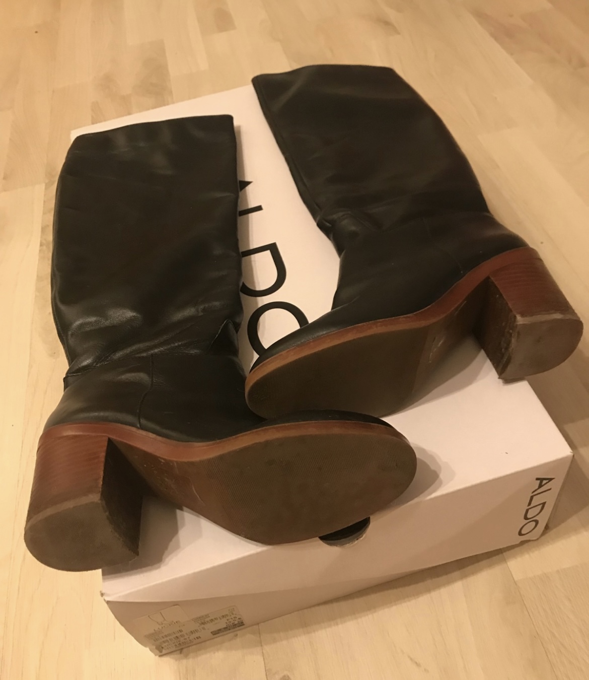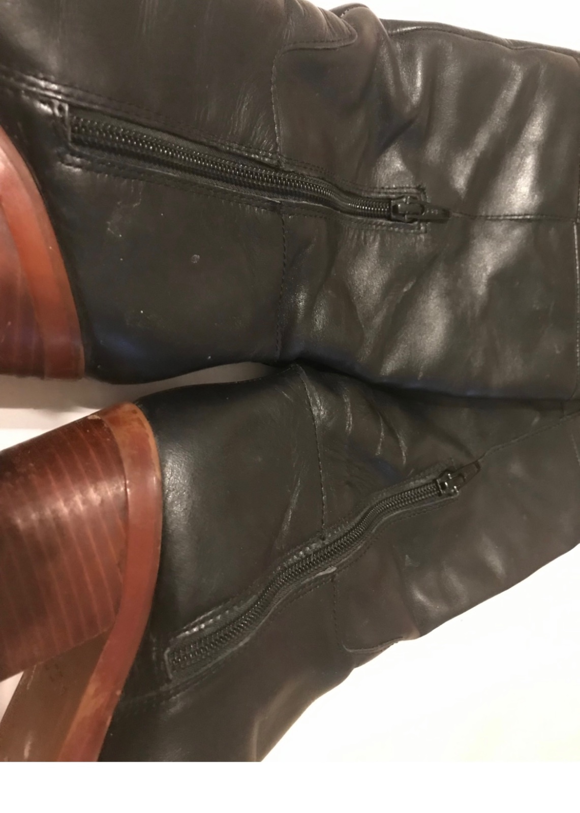 Nosené, kožené, mierne ošúchané podpatky viď foto, podpatok 7,5cm, dĺžka čižmy 50cm vrátane podpatku, šírka hore 18,5cm x2, dole zips viď foto