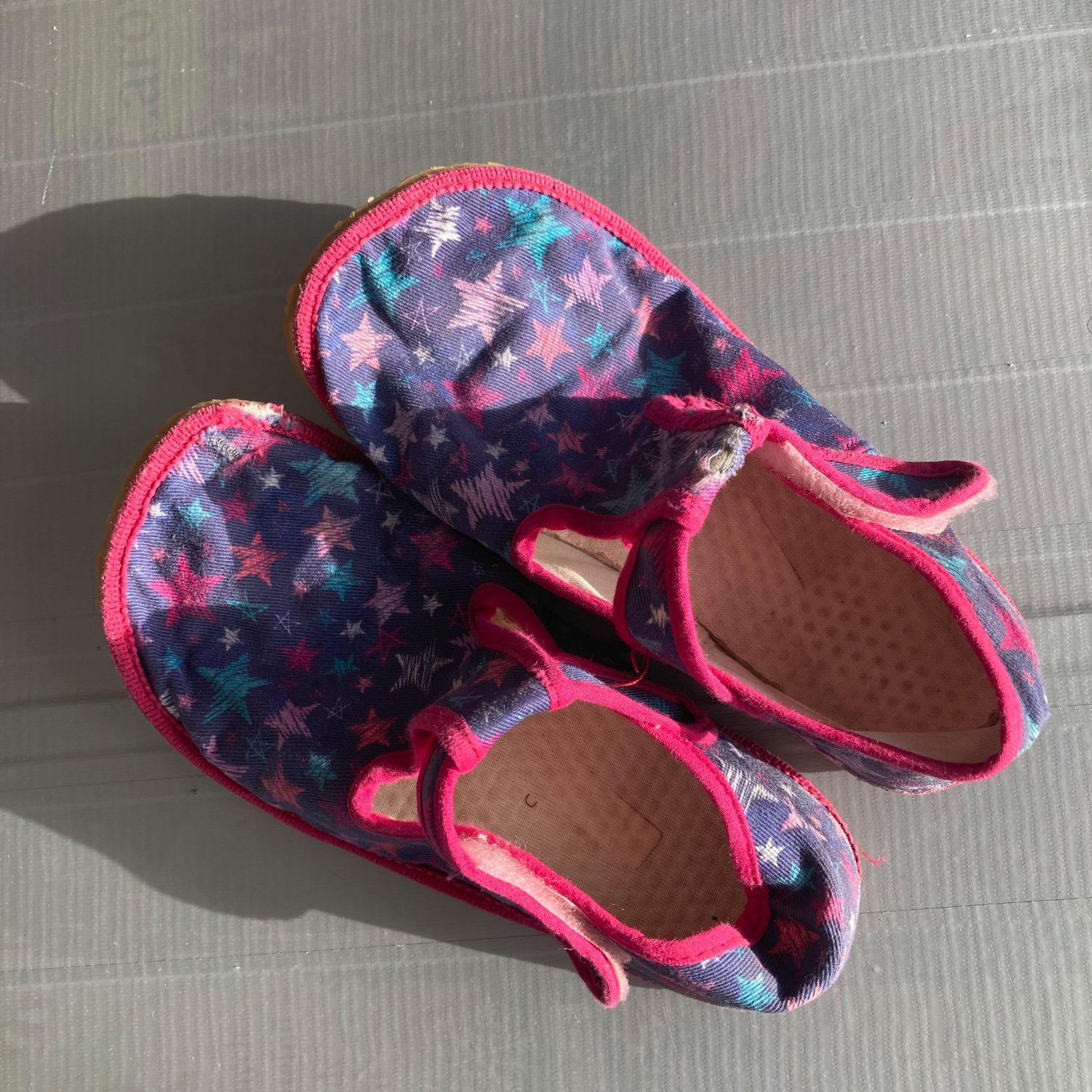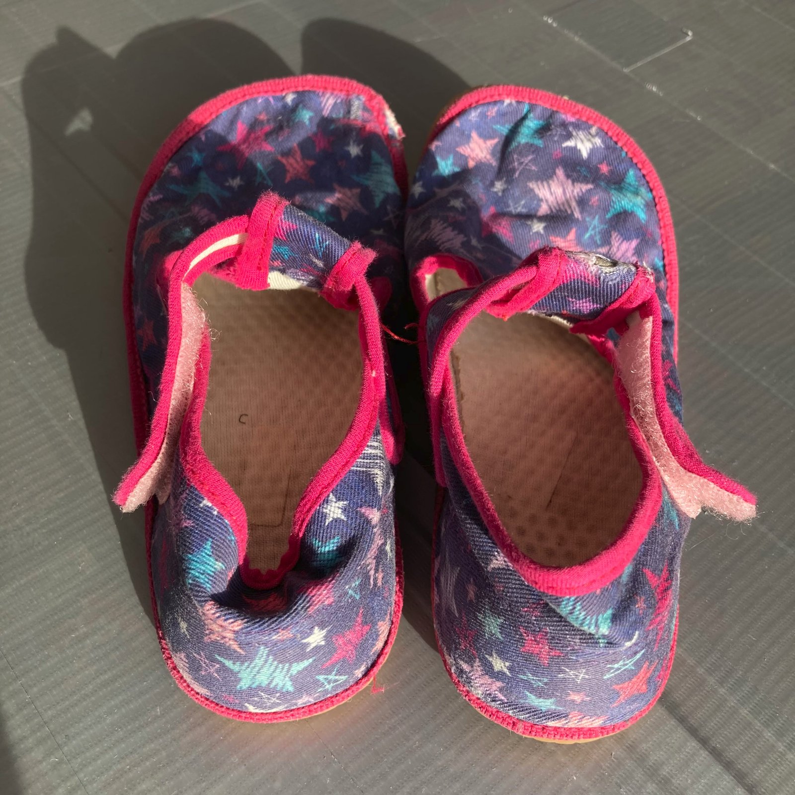 Barefoot papucky znacky Beda, velkost 31, rozmery: 20,1 x 8,0 cm. Je na nich vidiet osuchanie na niektorych castiach vrchnej casti.