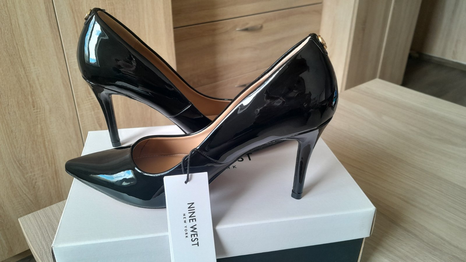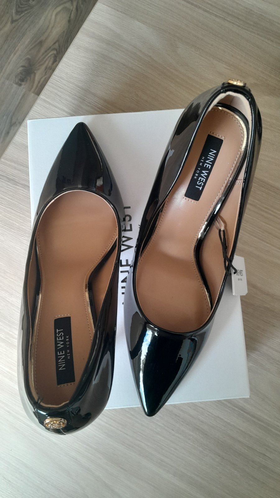 Predám úplne nové, len vyskúšané dámske čierne lakovane lodičky zn. NINE WEST, veľkosť 40, dĺžka chodidlá 26 cm. Podpätok 9 cm. Kupované v 07/2025, predávam aj s faktúrou.