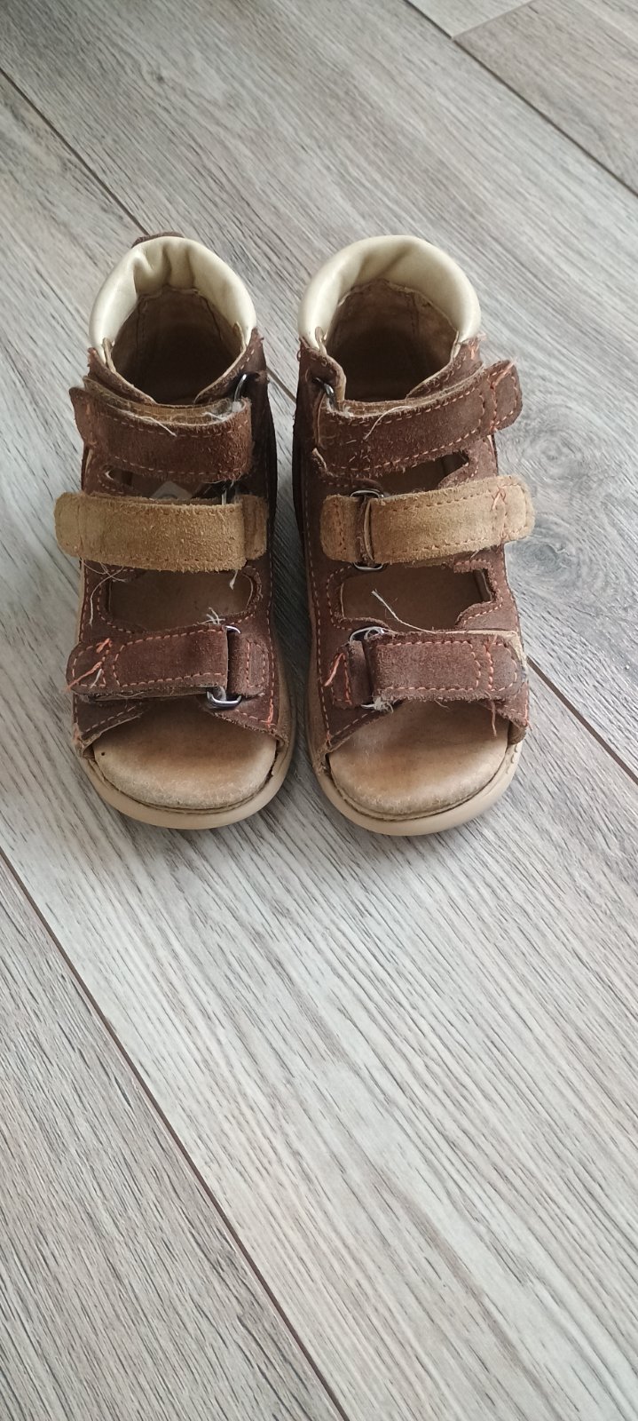 Členkové kožené topánky pre chlapčeka, vo farbe hnedá-khaki, zapínanie na suchý zips. Kúpené u Baťu v 06/2022, ešte v záruke. Zabudli sme na ne, a synčekovi sú už malé 🙊 Vnútorná dĺžka stielky 17 cm.
