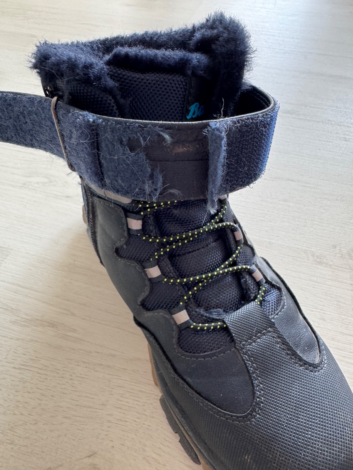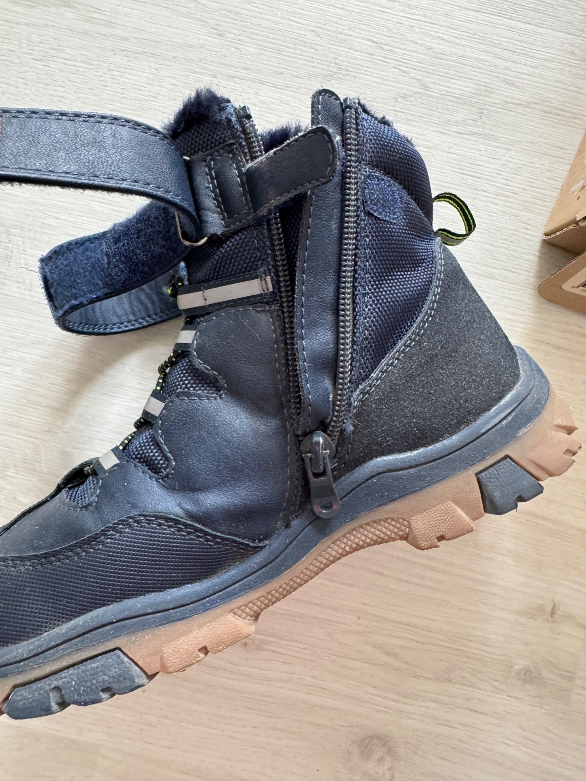 Vo vnutri tepla kozusinka, zapinanie zboku zips, a vpredu suchy zips. Na jednej topanke je z vnutornej strany suchy zips zodraty, ale je to stale funkcne. Preto aj nizsia cena.