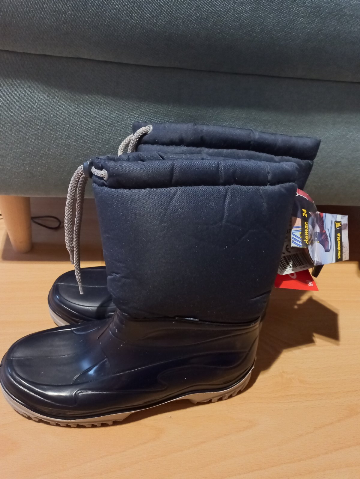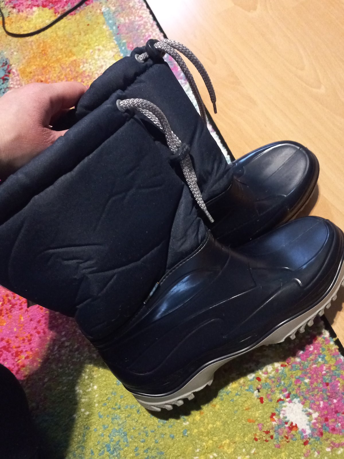 Párkrát obuté zateplené čižmy, spodná časť gumená, takže vhodné aj do čľapkanice, hore sťahovacia šnúrka.