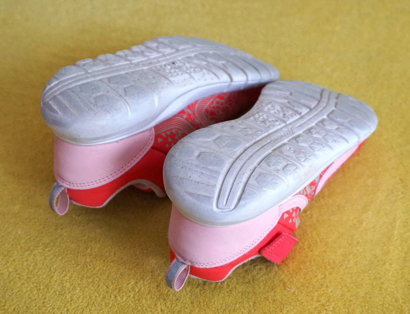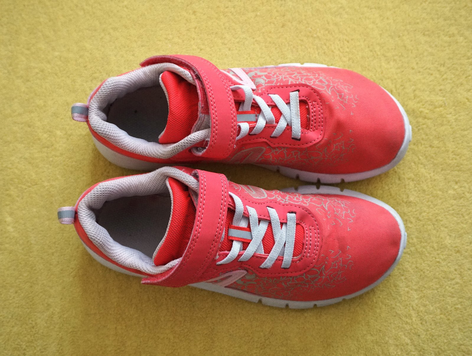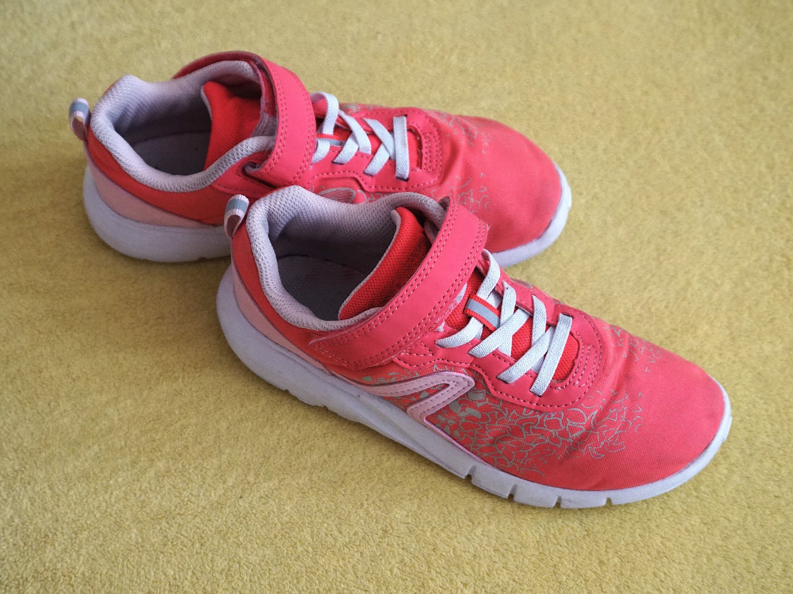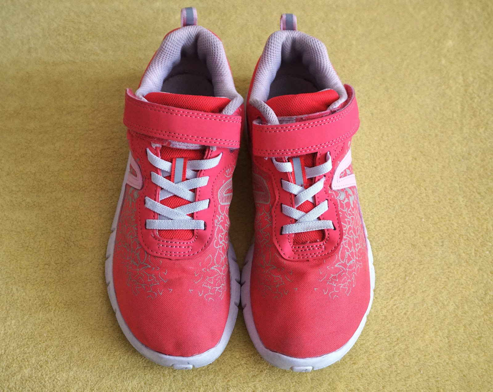 Ľahučké textilné dievčenské tenisky, pohodlné zapínanie na suchý zips. Značka Decathlon, veľkosť 35. Bežné známky používania, bez poškodení.