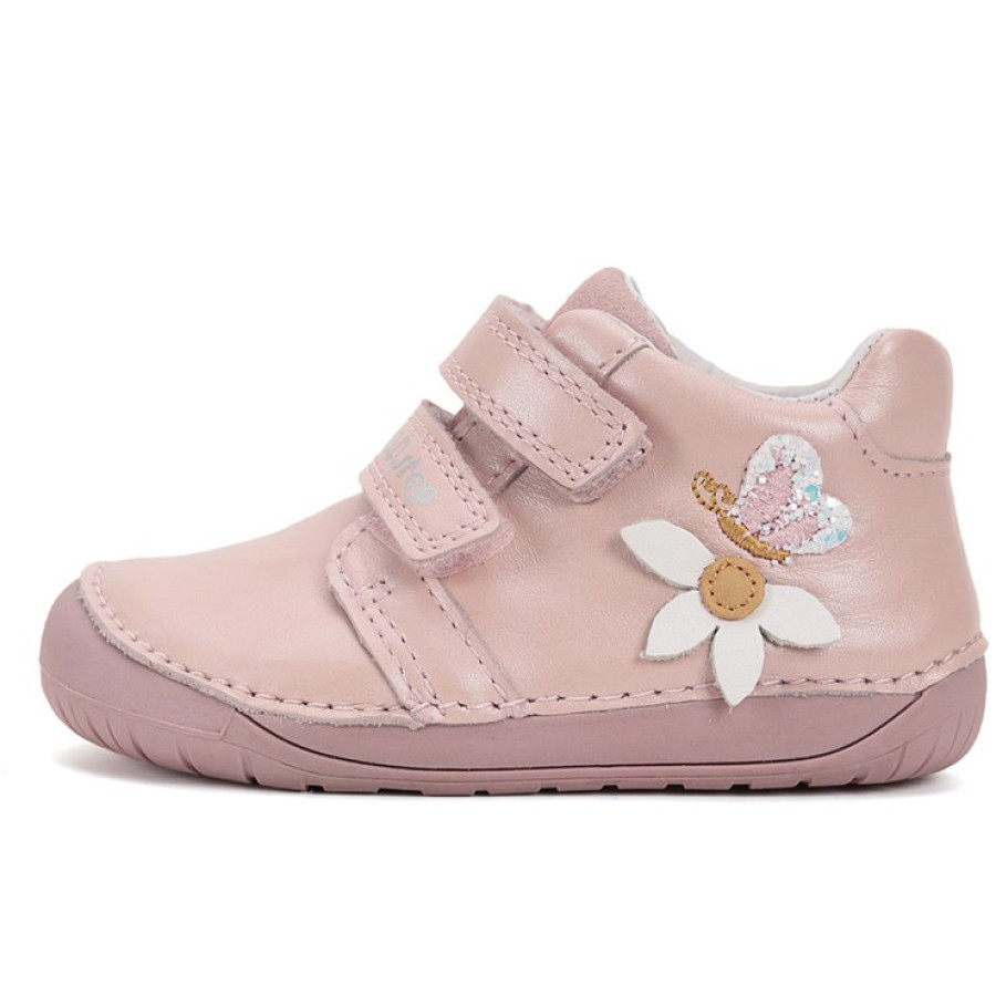 Roztomilé dievčenské topánky v jemnej ružovej farbe sú ideálne pre prvé kroky. Vyrobené z kvalitnej mäkkej kože, s flexibilnou protišmykovou podrážkou, ktorá podporuje prirodzený pohyb chodidla. Praktické zapínanie na dva suché zipsy zabezpečí jednoduché obúvanie a pevné uchytenie. Ozdobené jemným motívom kvetinky a trblietavého srdiečka pre veselý, dievčenský vzhľad.