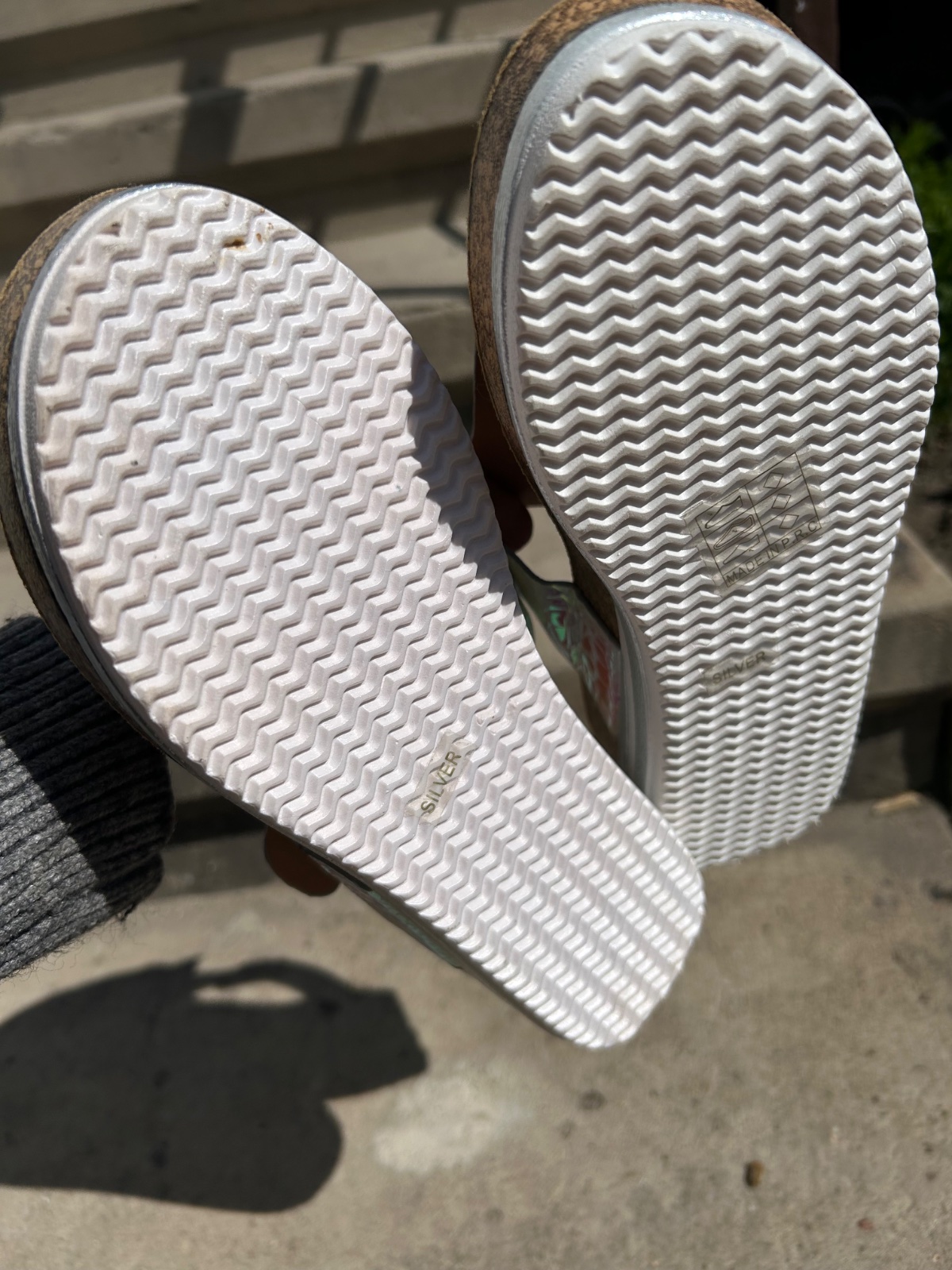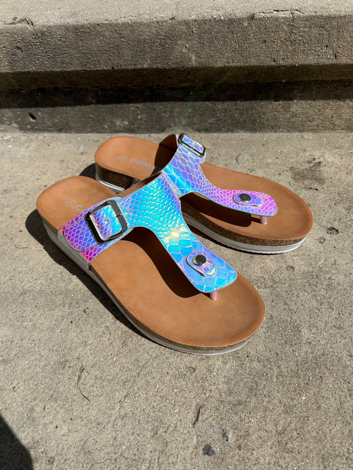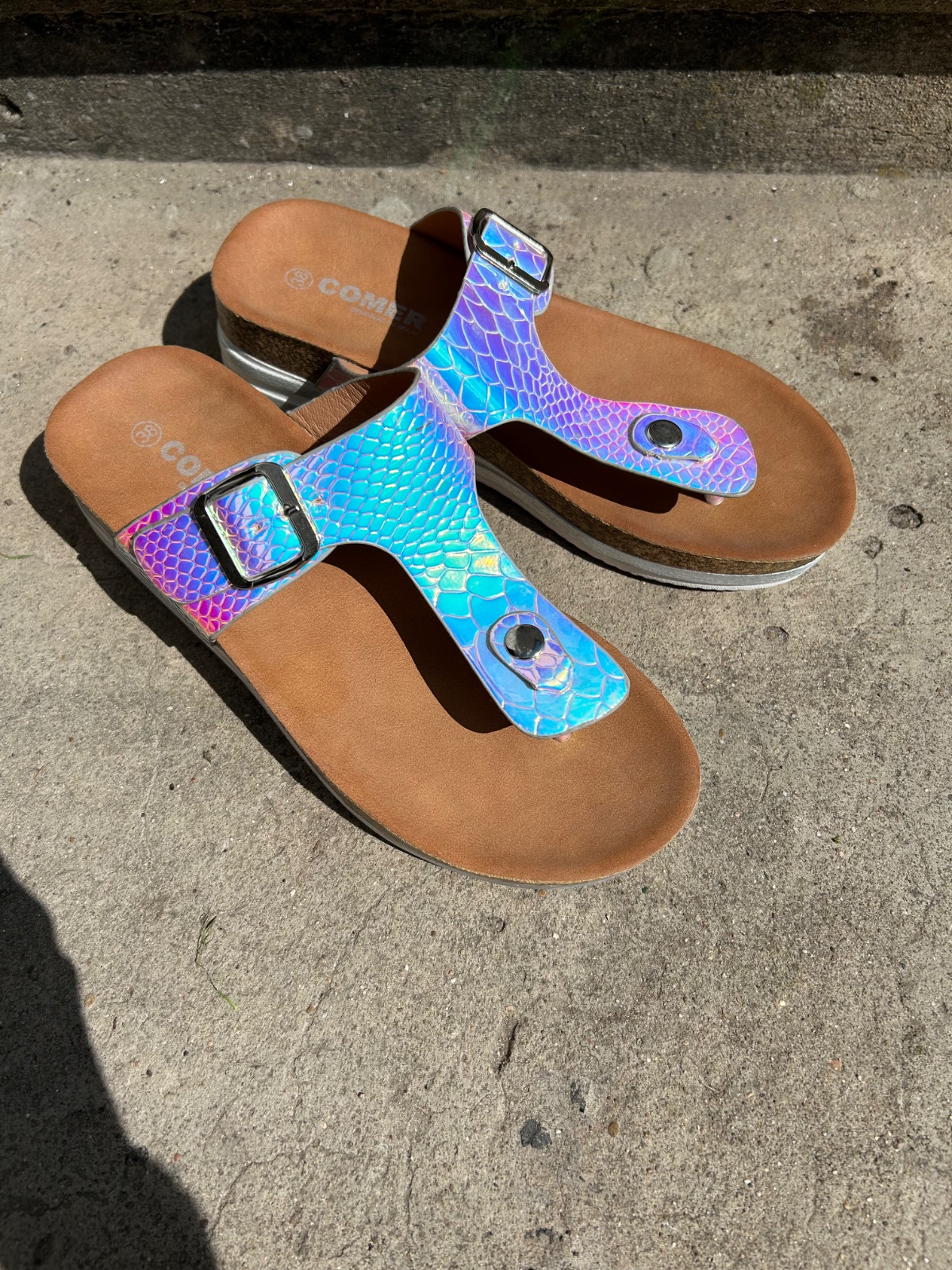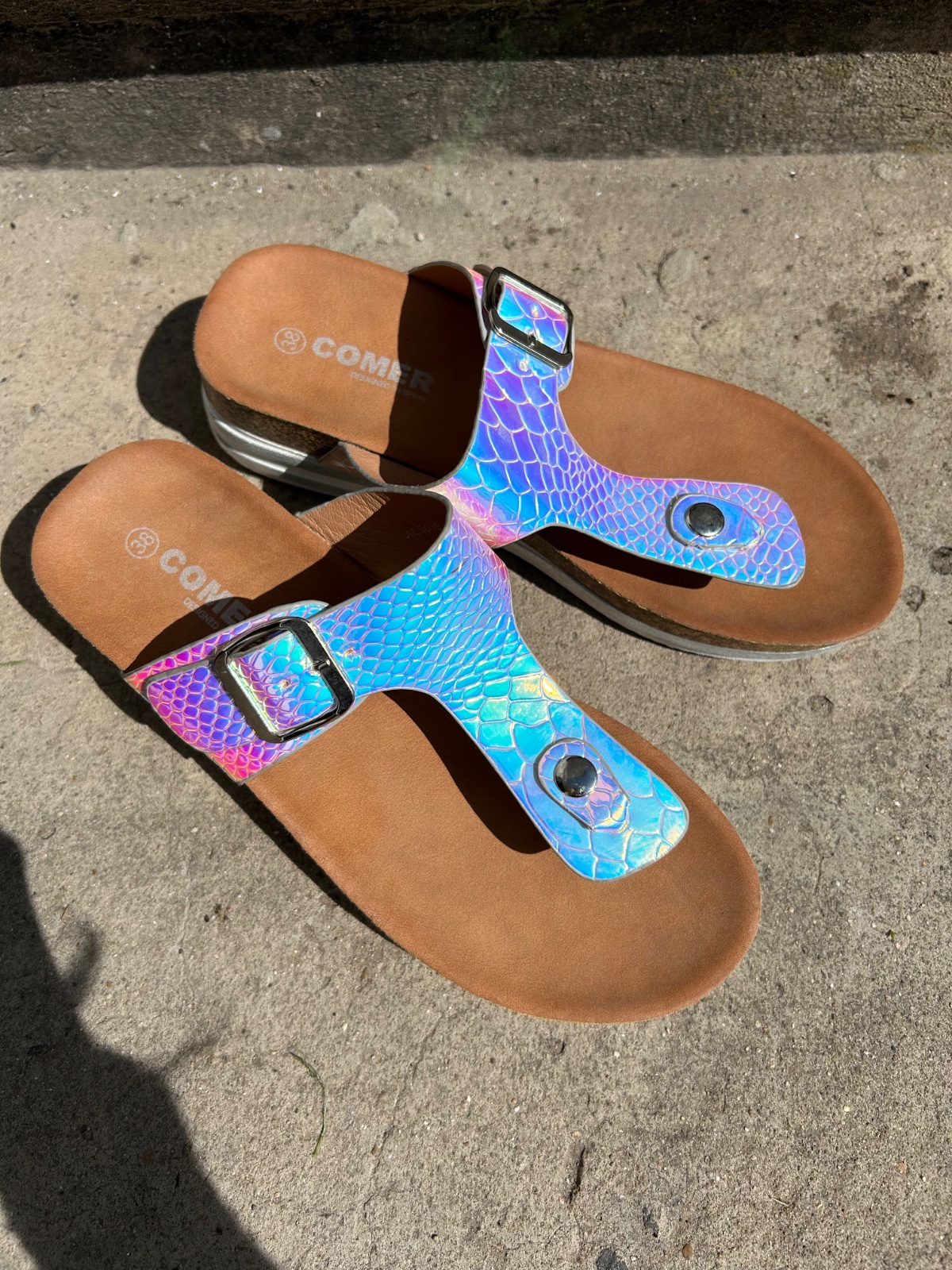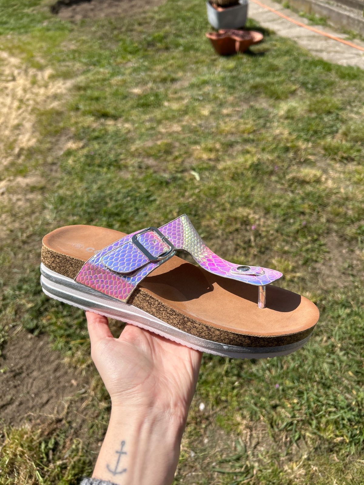 Farebné šľapky medzi prsty na miernom klinovom opätku. Neboli nikdy nosené.