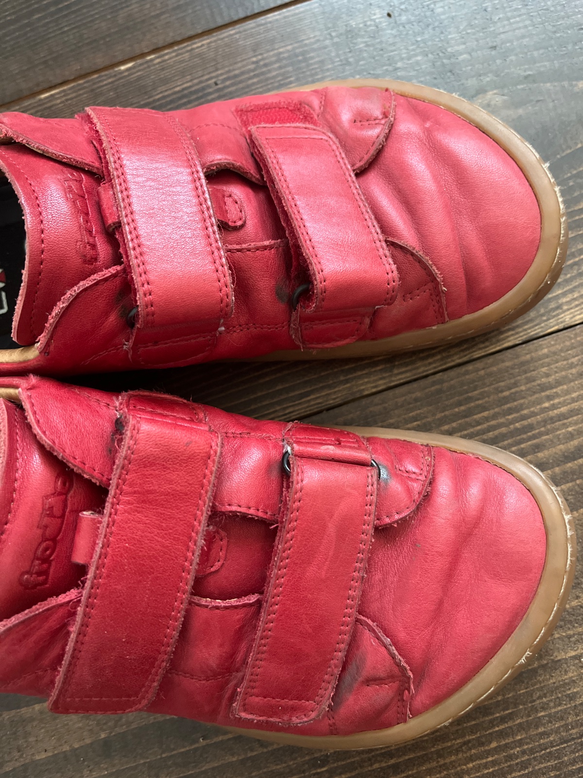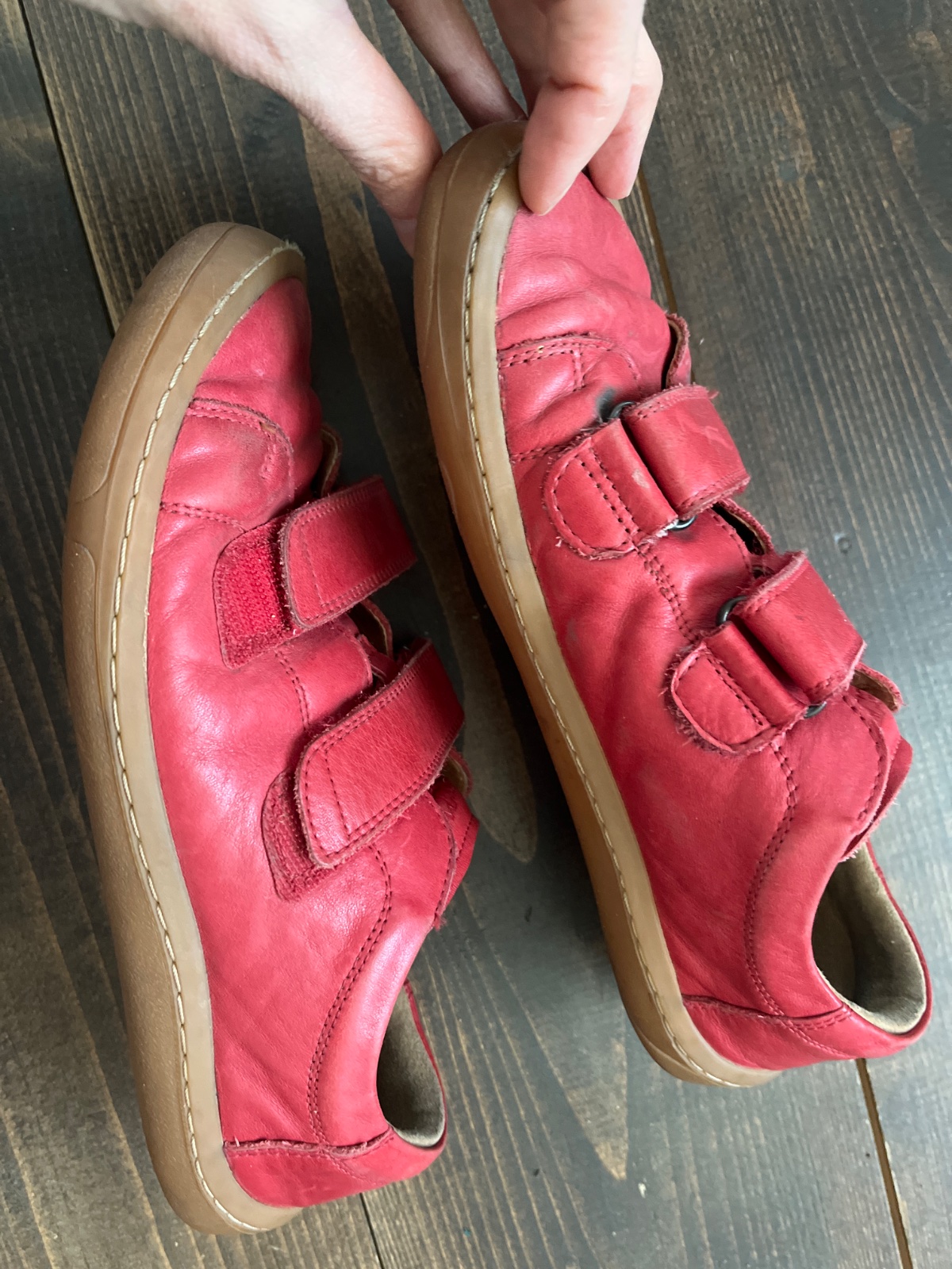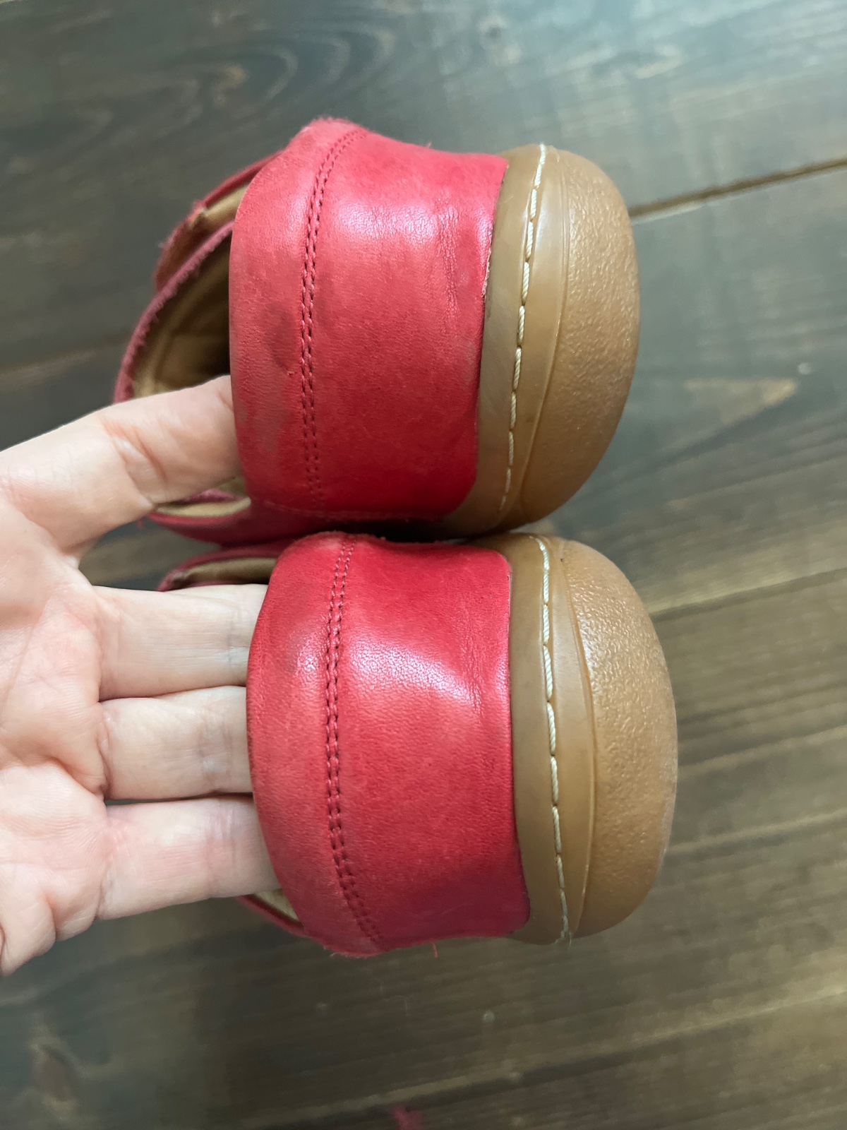 Balerínky nosené s ortopedickými vložkami, pôvodná vložka sa nám kdesi stratila, tak prikladám ortopedické vložky a náhradné vložky z iných topánok. Nosenie vidno, ale žiadne ošúchané časti, sú vo veľmi dobrom stave. Ošetrované včelím voskom.