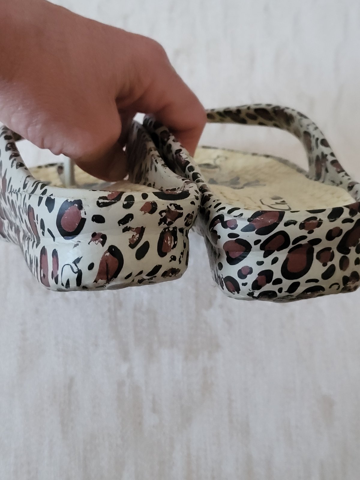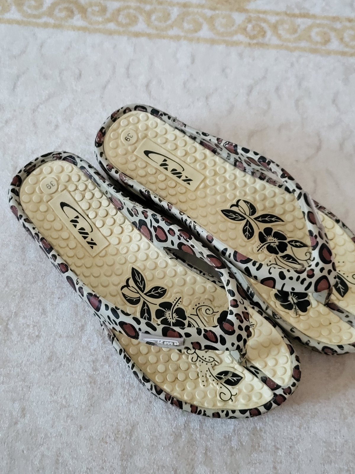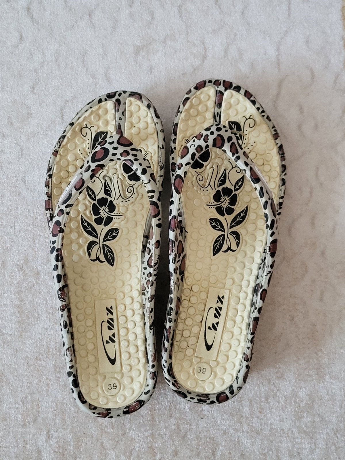 Šľapky veľkosť uvedená 40, UK 7, ale sú menšie tak na 39 sedia veľkosťou. Majú kožené vnútro. Kupované v Taliansku. Farba je svetlá zlato hnedá