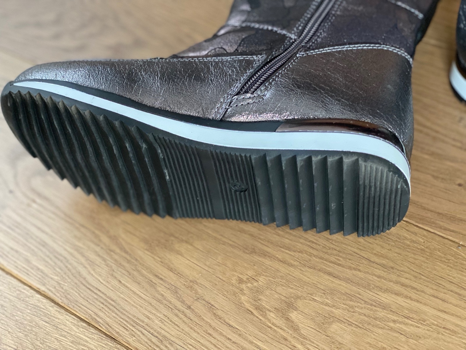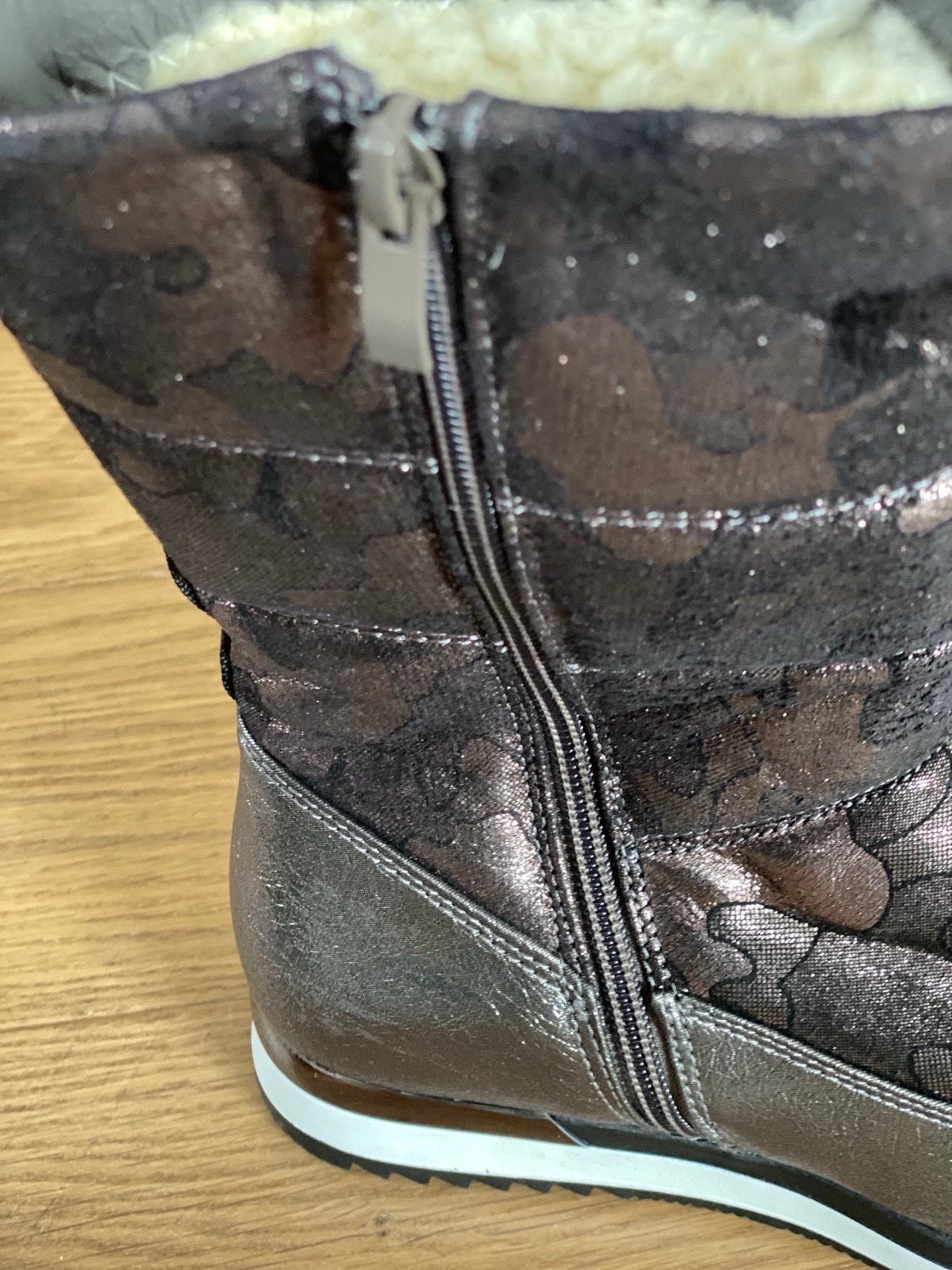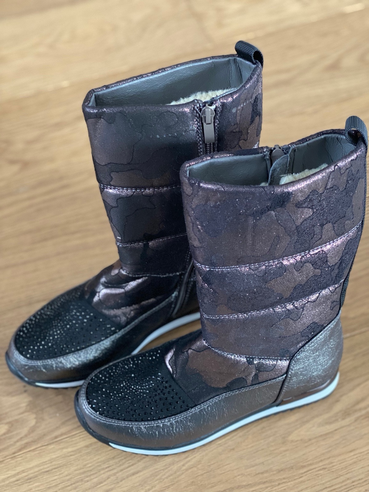 Predám čižmy. Zapínanie na zips. Vnútro zateplené kožušinou. Farba sivo-hnedá s leskom.