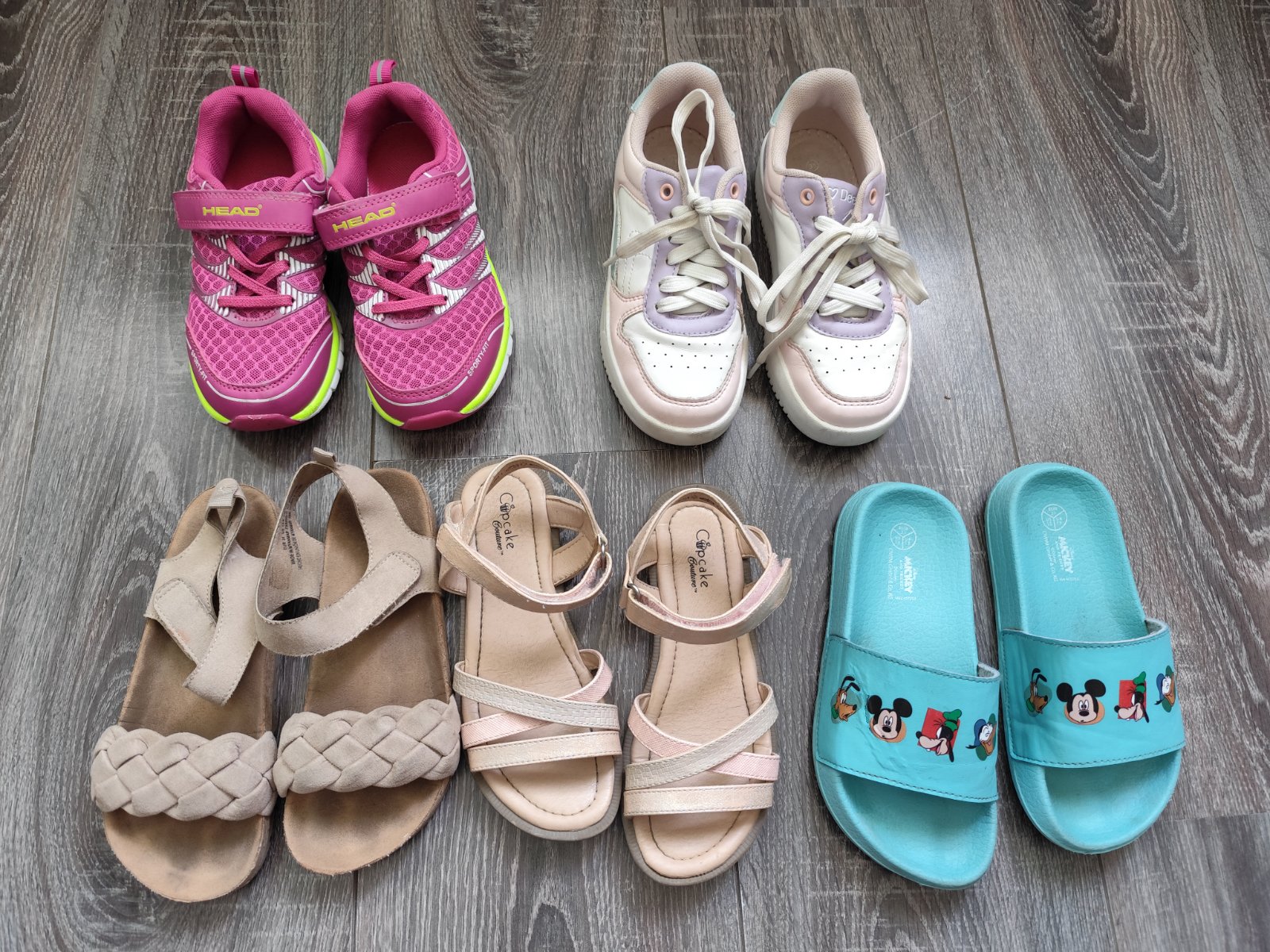 Sandálky v perfektnom stave .Obe nosené len jednu sezónu.Korkove sú značky H&M a druhé Deichmann.Ruzove tenisky sme nosili jeden škôlky rok na telesnú,kupované v športovom obchode Biele tenisky sú CCC