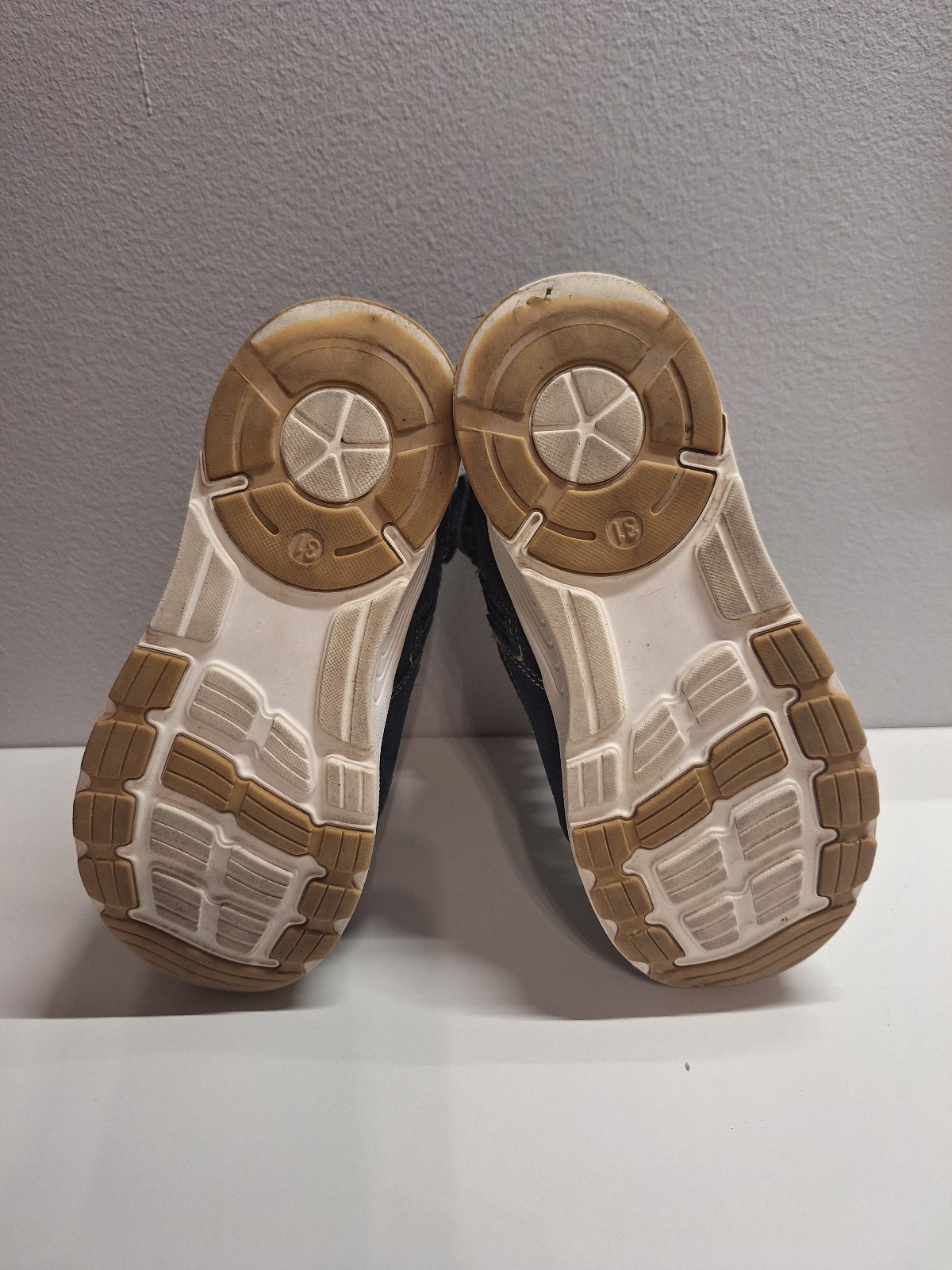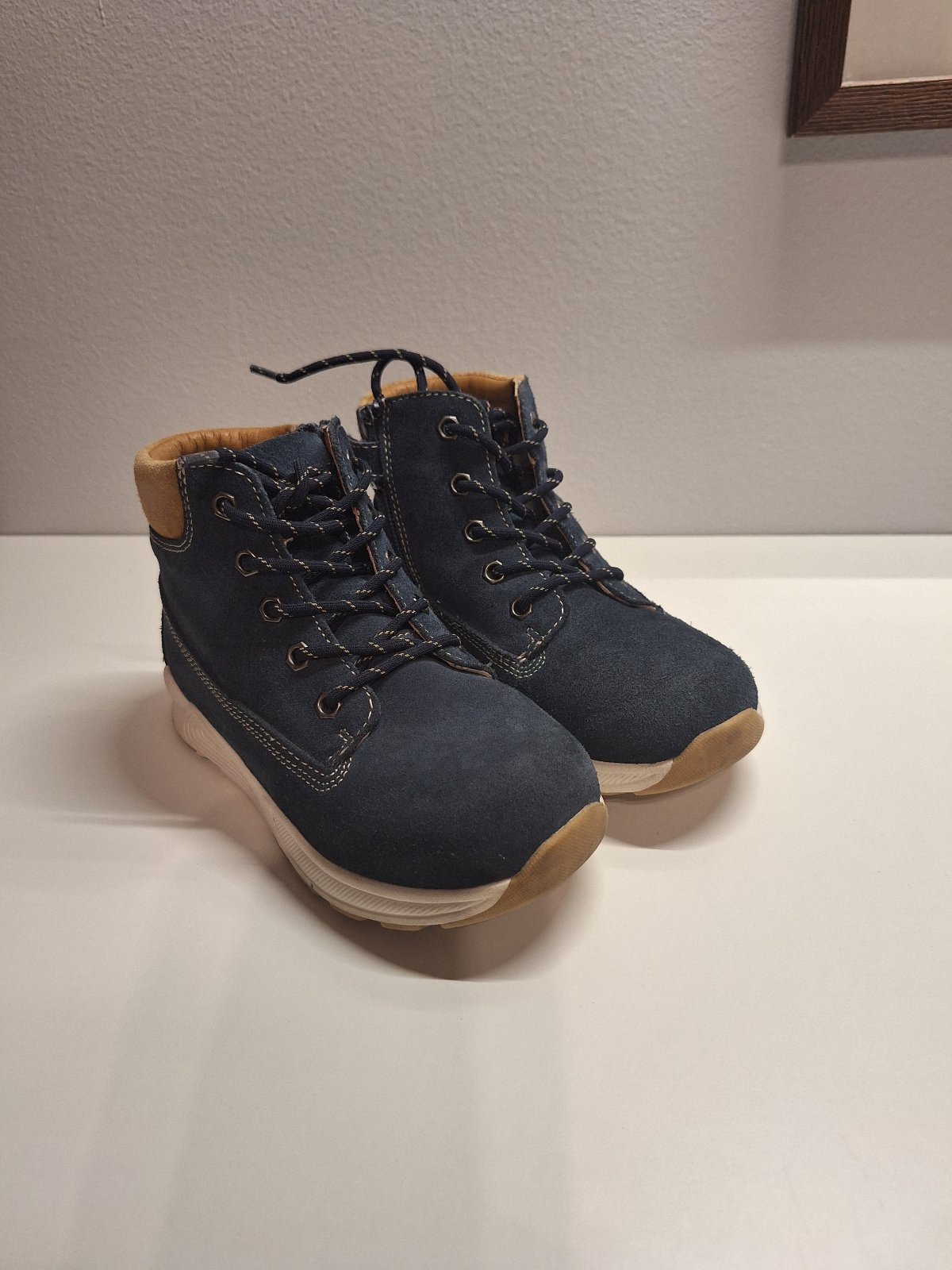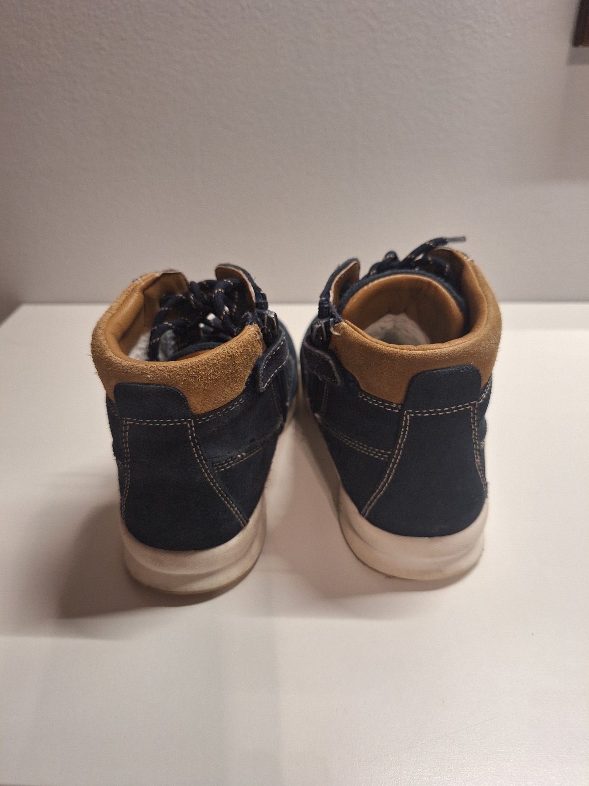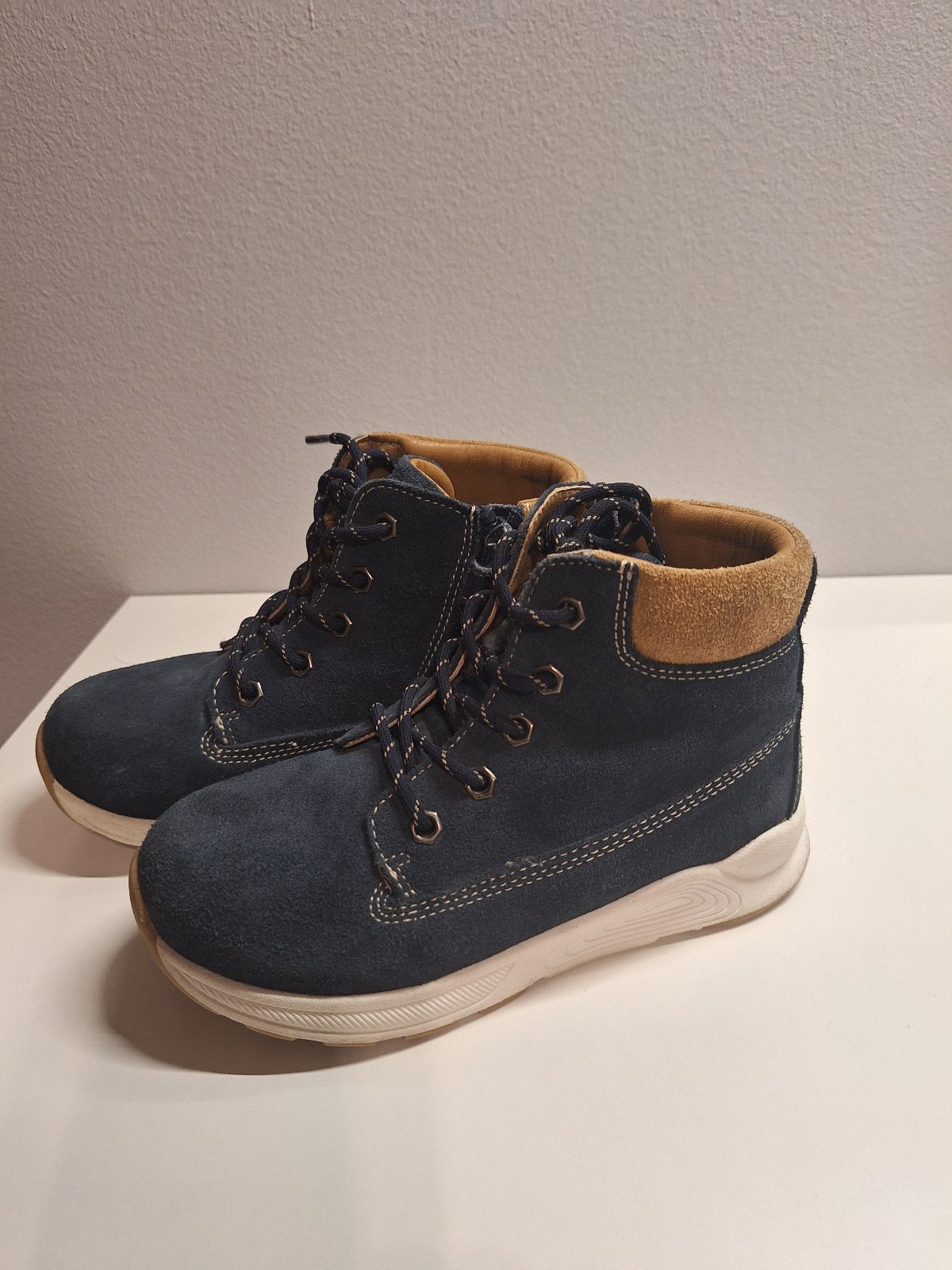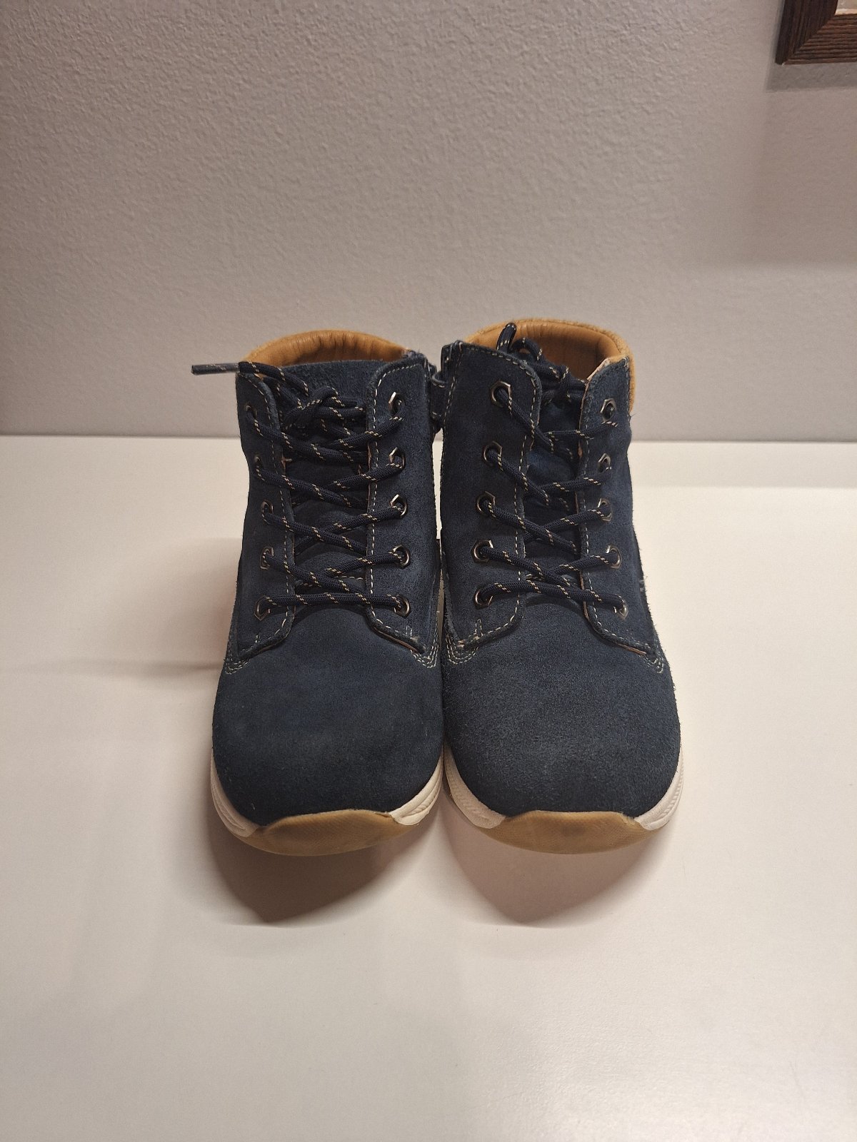 Nosené z brúsenej kože a zateplené kožušinkou. Čižmy majú krásnu sýtu tmavomodrú farbu. Bez akýchkoľvek poškodení. Žiadne fľaky ani diery. Koža nie je nikde odretá. Zipsy plne funkčné. Podrážky sa nikde neodlepujú. Len schodená podrážka na pätách. Dierka na päte je len povrchová od zapychnutého kamienku. Nezatekajú.