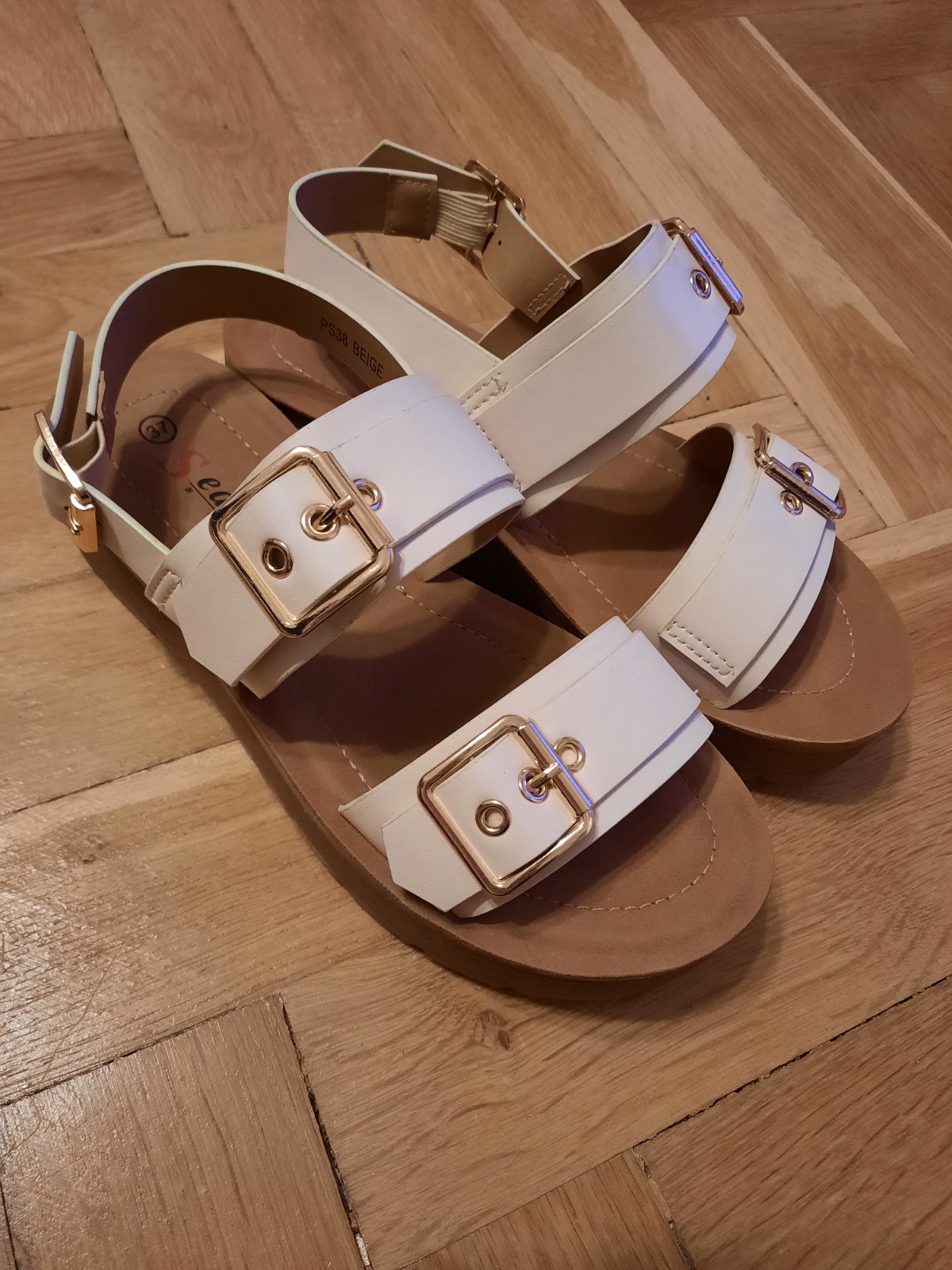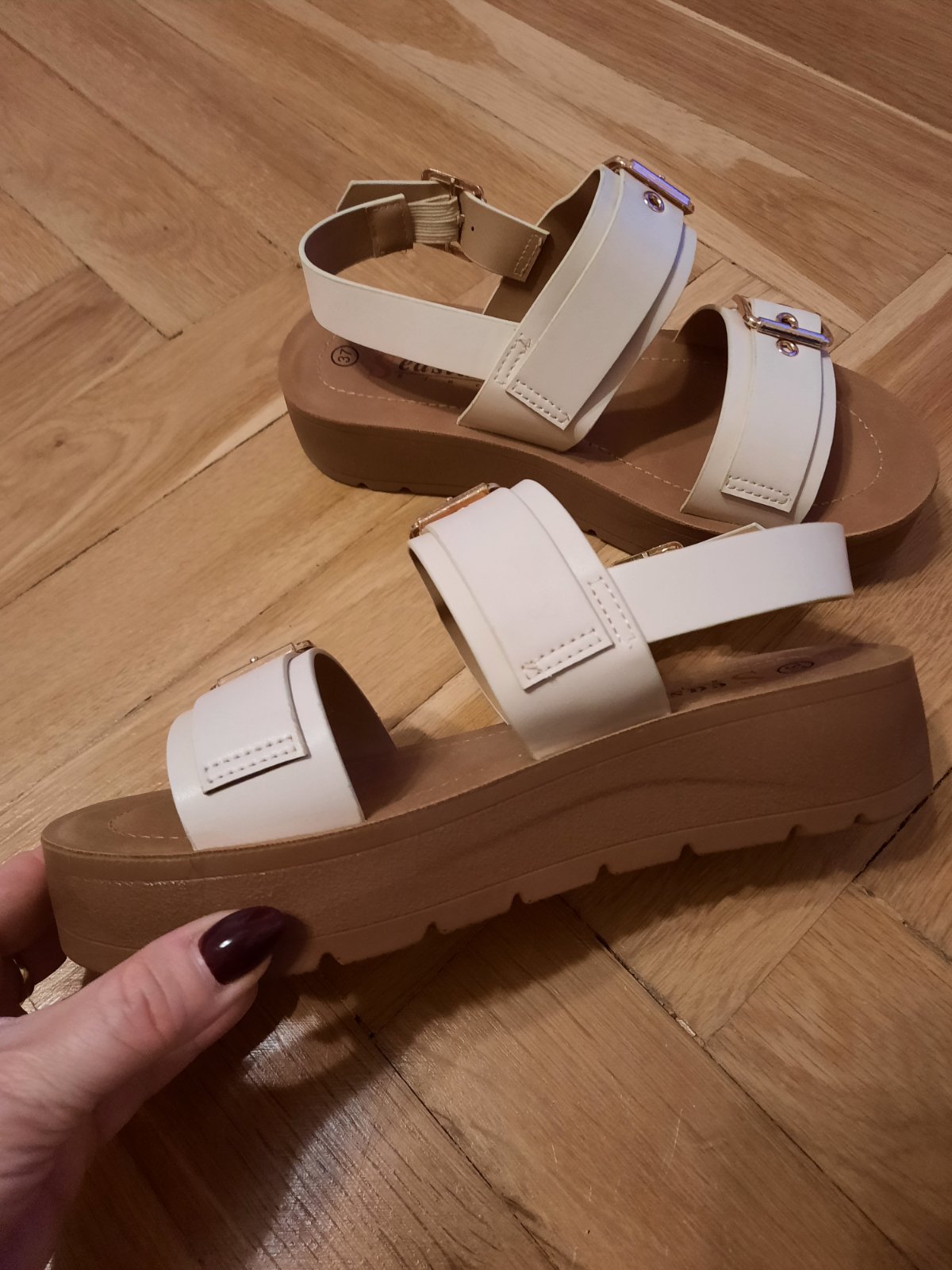 Krémové sandálky na podpätku so zapínaním okolo členka. Podpätok meria 9 cm. Nosené boli málo, sú v dobrom stave ale sem tam je vidieť lepidlo. Pri nosení to ale nie je vidieť. Na nohe vyzerajú sup...