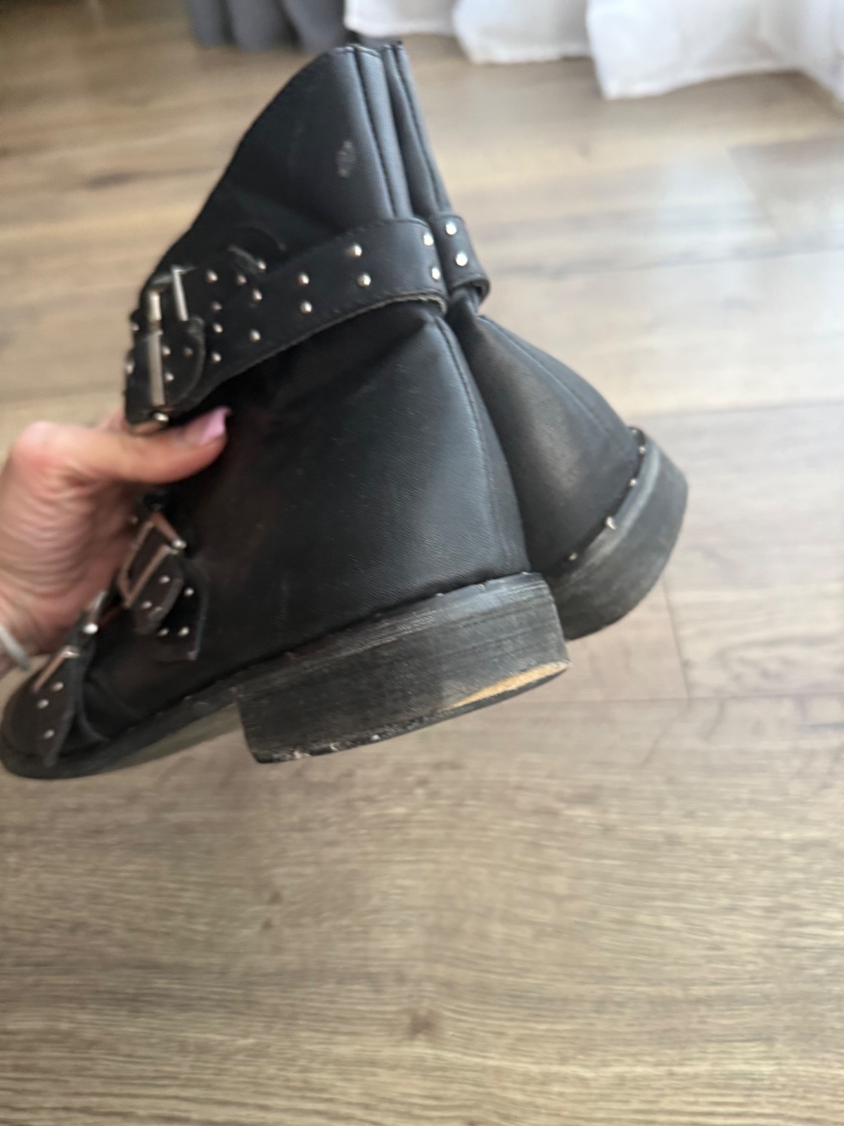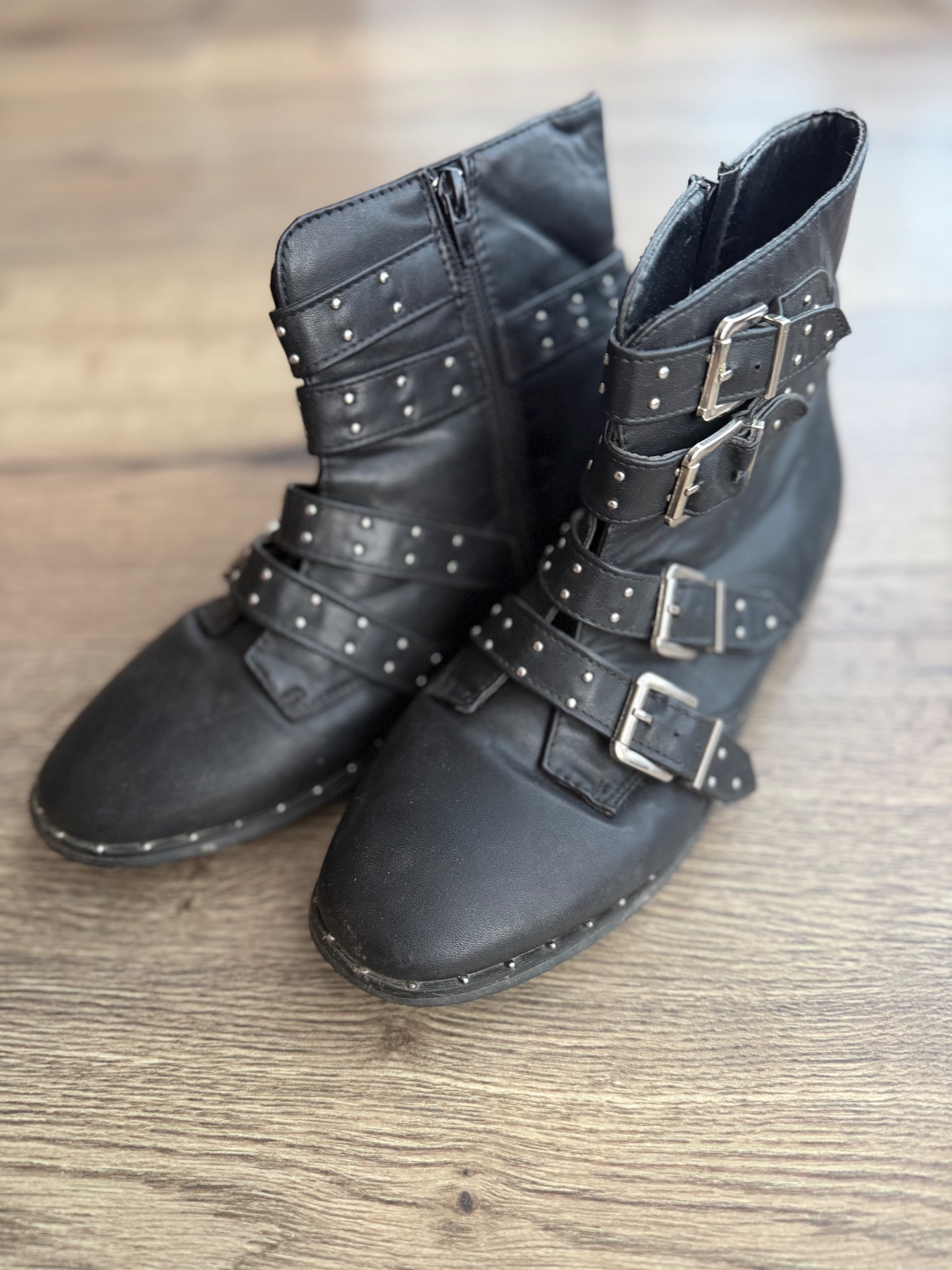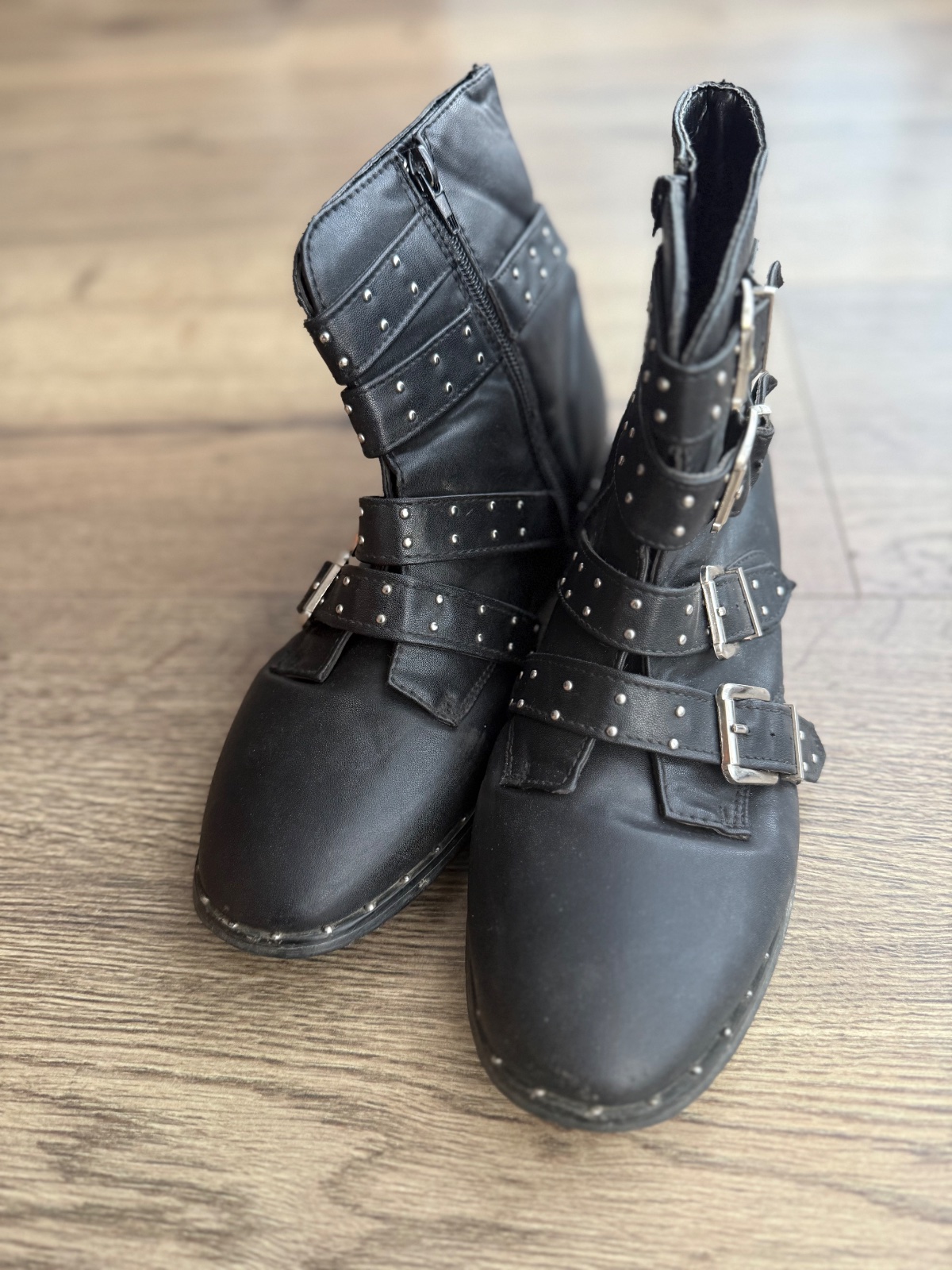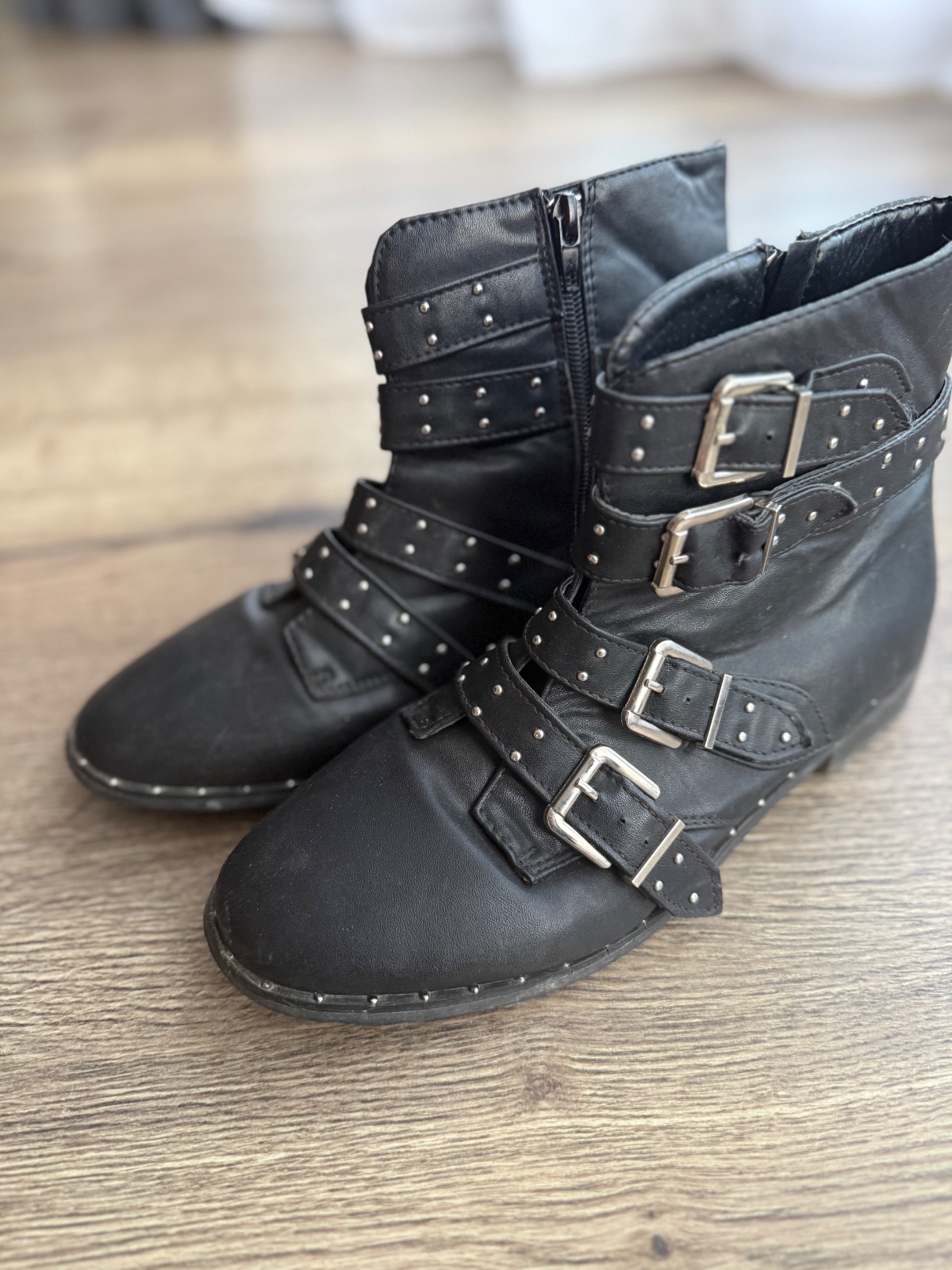 Predám tieto moderné čižmy s výraznými prackami a jemným kovovým zdobením, ktoré krásne doplnia každý outfit – či už k rifliam, legínam alebo šatám.