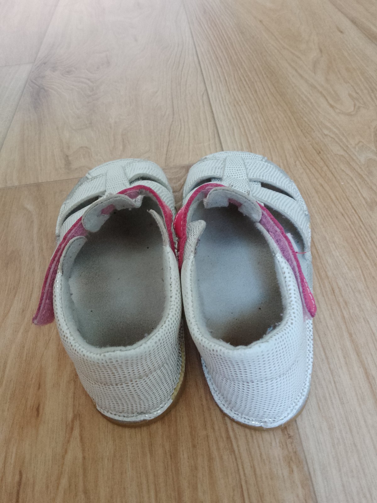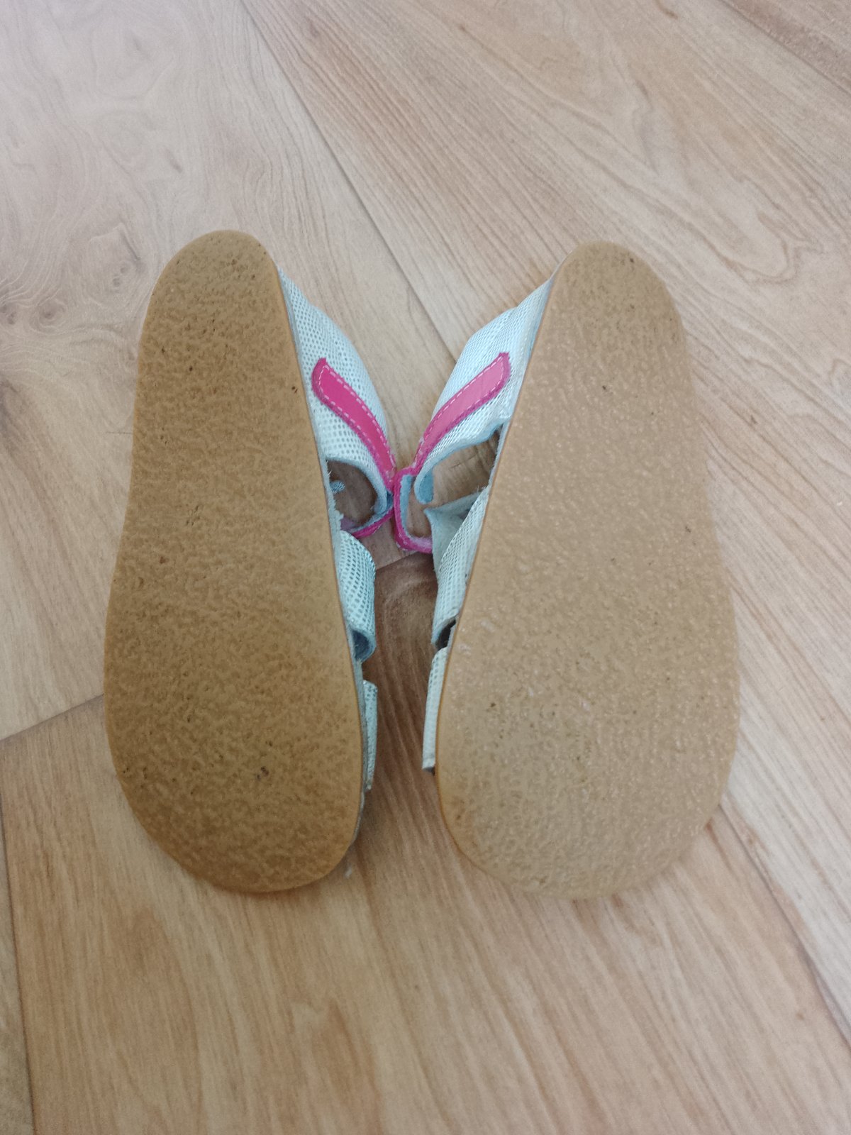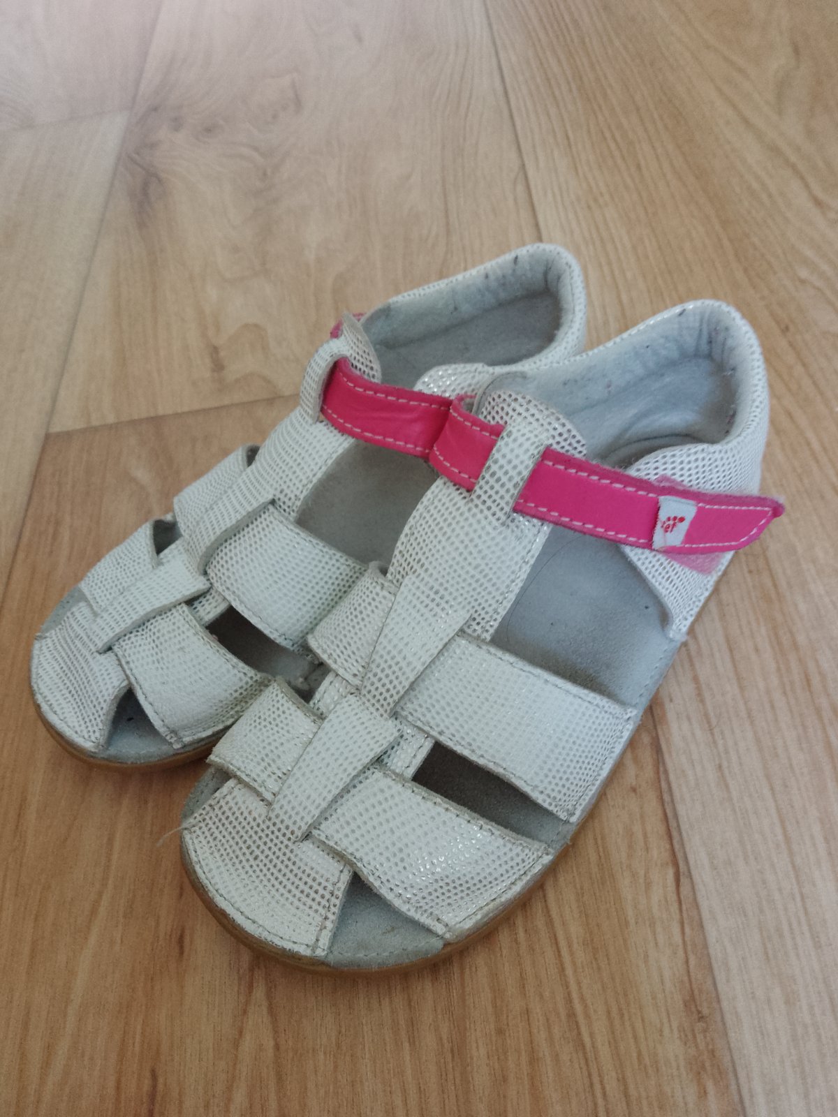 Málo nosené mäkkučké sandálky na tenkej gumenej podrážke vo veľmi dobrom stave. Nosené viac ako prezuvky než na von. Suché zipsy držia dobre, podrážka bez poškodení. VD cca 18.8 cm.