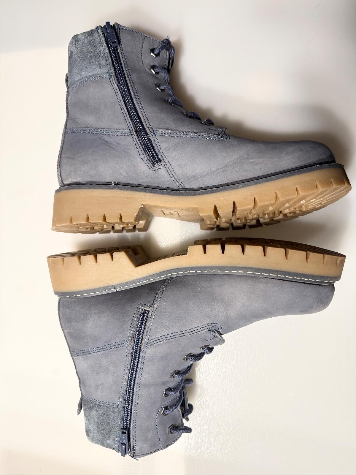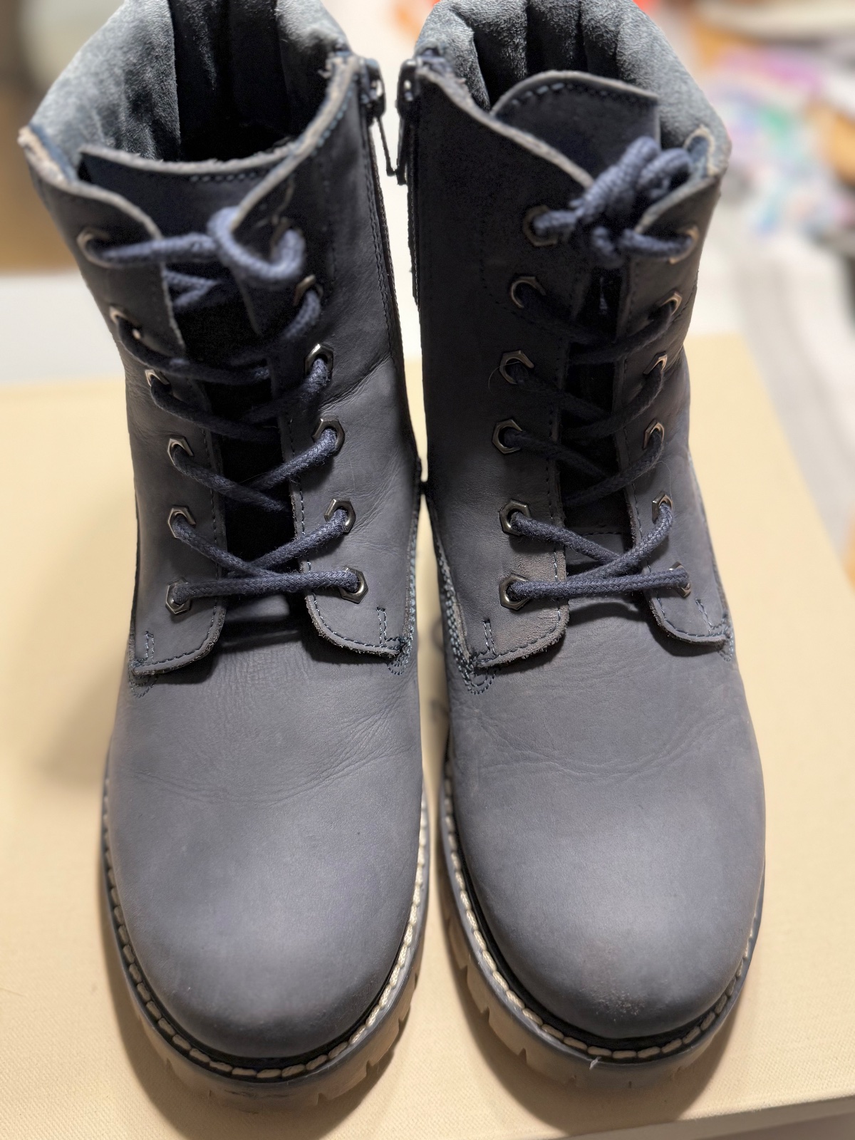 Štýlové kožené čižmy pre mladú dámu, nosené na striedačku a preto v peknom stave, ošetrované prípravkami na kožu. Veľkosť sedí, zipsy funkčné, vnútri jemne vyteplené flísom. Na pravej topánke vpred...