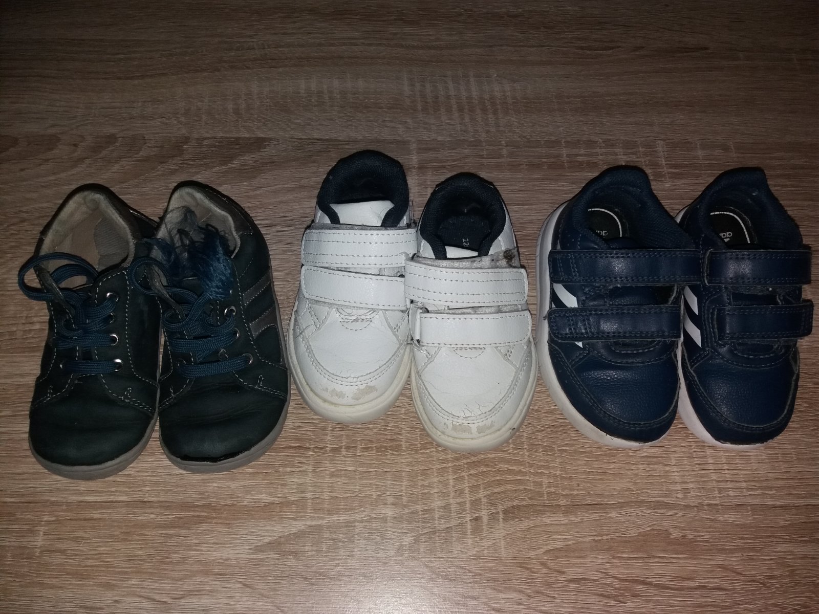Predám topánky pre chlapca, sú bez poškodenia, boli vypraté v práčke. Pridám k ním aj biele tenisky (predok ošúchaný od odrážadla) veľkosť 22/23 + tmavomodré tenisky Adidas (predok trošku natrhnutý od odrážadla) veľkosť 23 + tmavomodré kožené topánky (predok na jednej pol páre prilepený so sekundovým lepidlom, je to vidieť) veľkosť 23. Cena je za všetky.