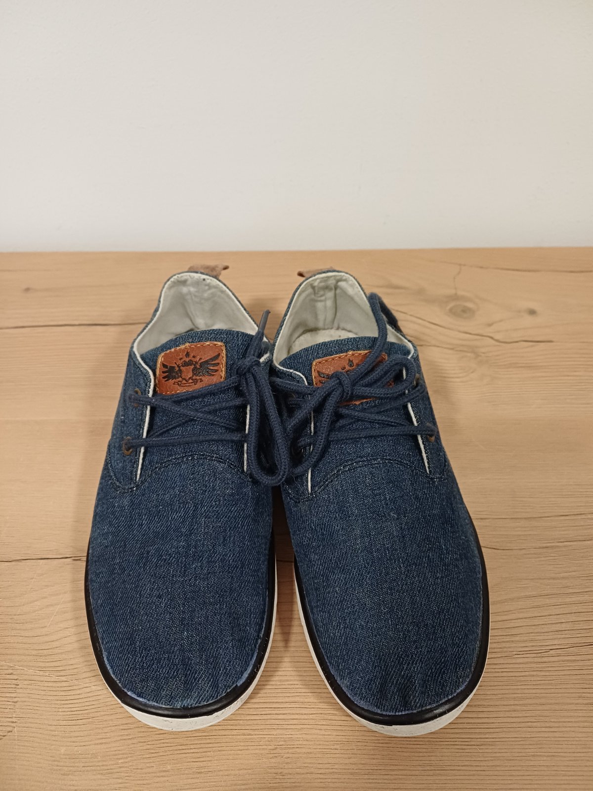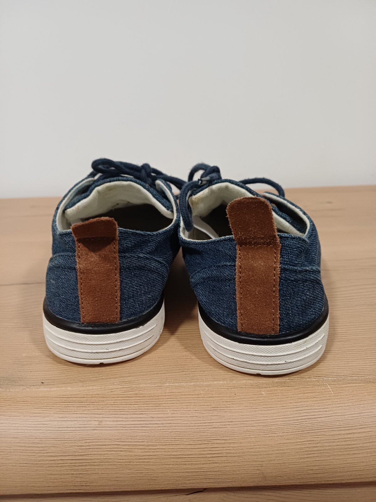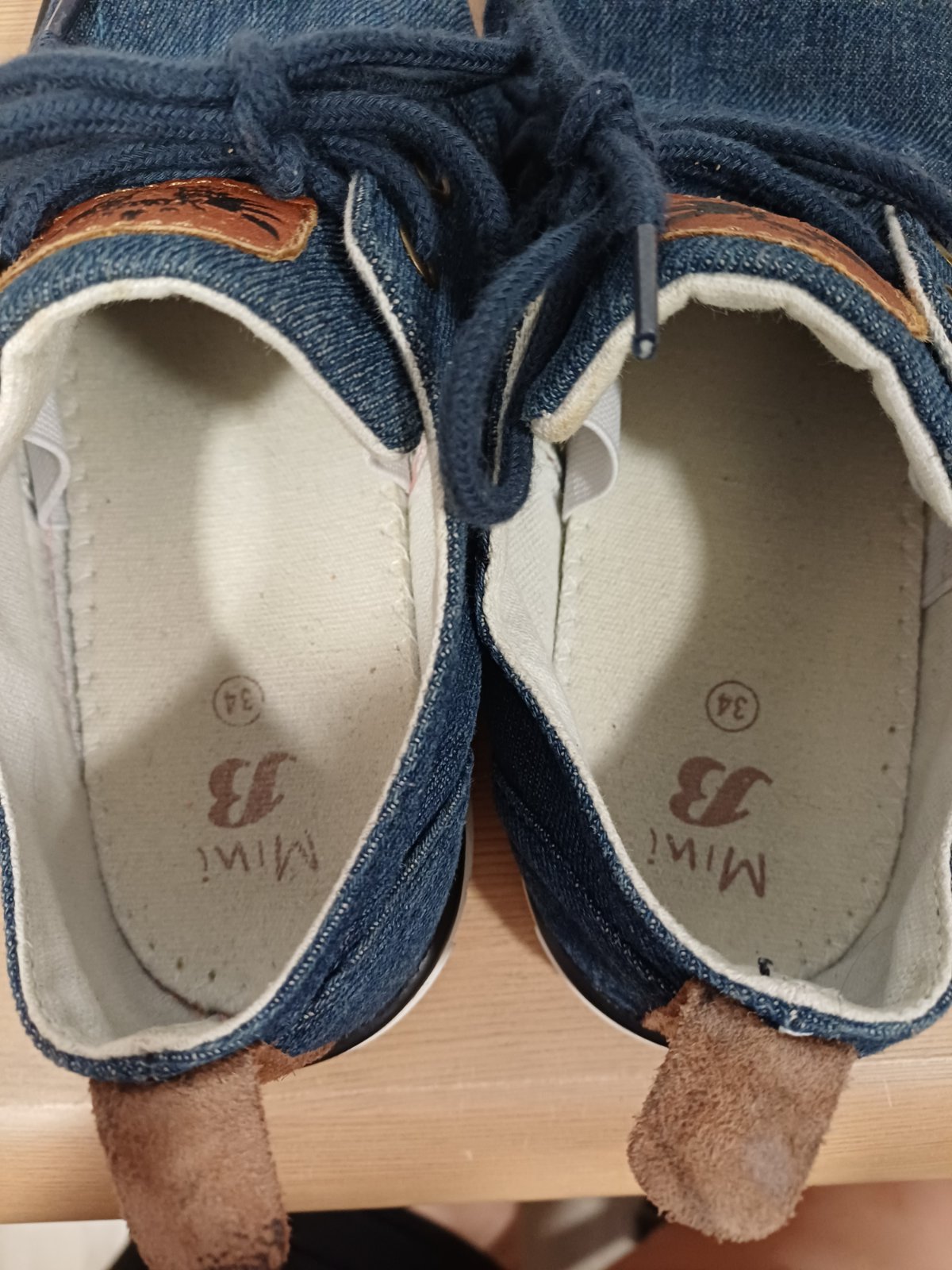 Veľmi zachovale tenisky, kupované počas lockdownu, rýchlo z nich vyrastol, imitácia rifloviny a oranžovou kombináciou, zapínanie na 2suche zipsy.
