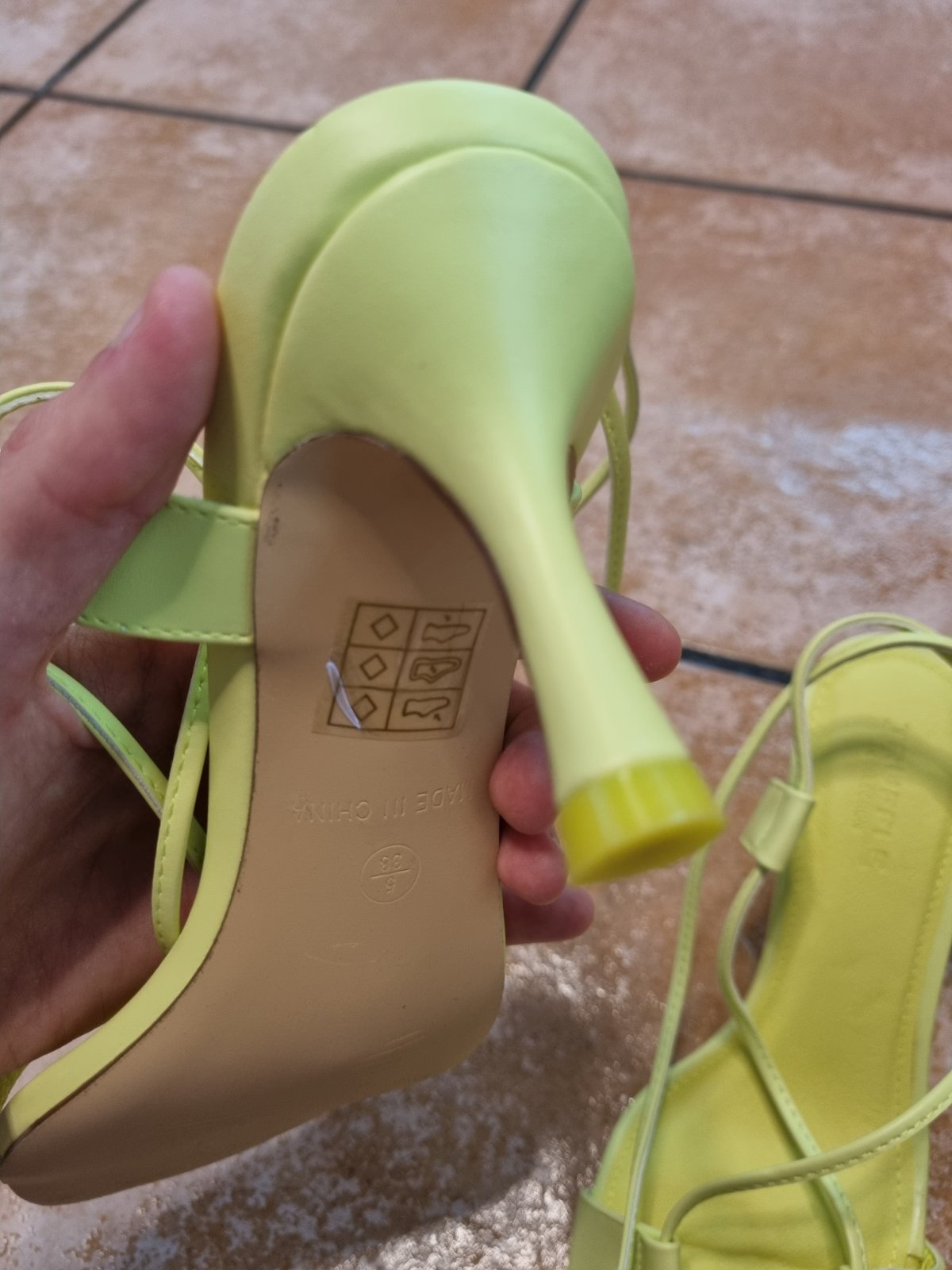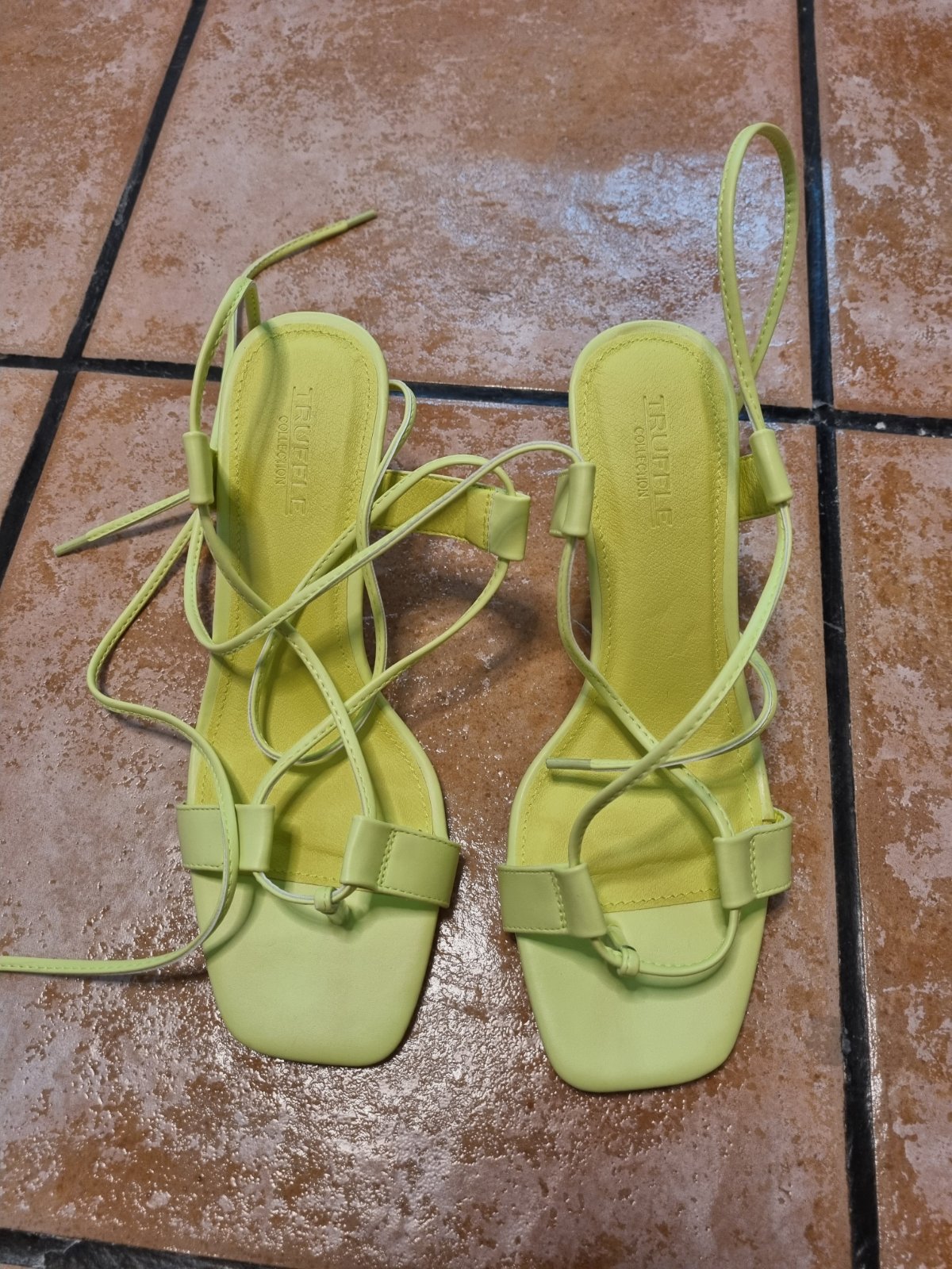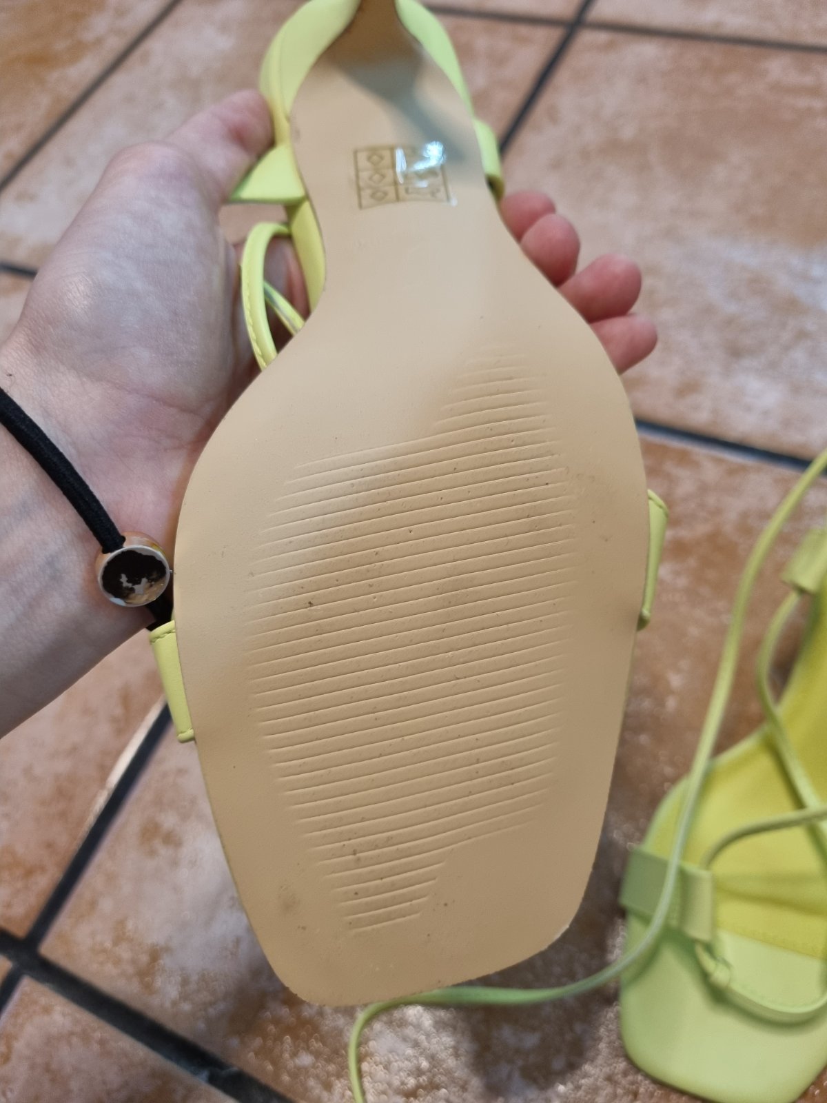 Brutálne sandálky, šnurovanie krásne ukáže. Je to neónová zelená / žltá farba. Neboli nikdy obuté, nakoľko nemali moju veľkosť a dúfala, som, že aj 38 sadnú, lebo sa mi veľmi páčili, ale nesadli :(