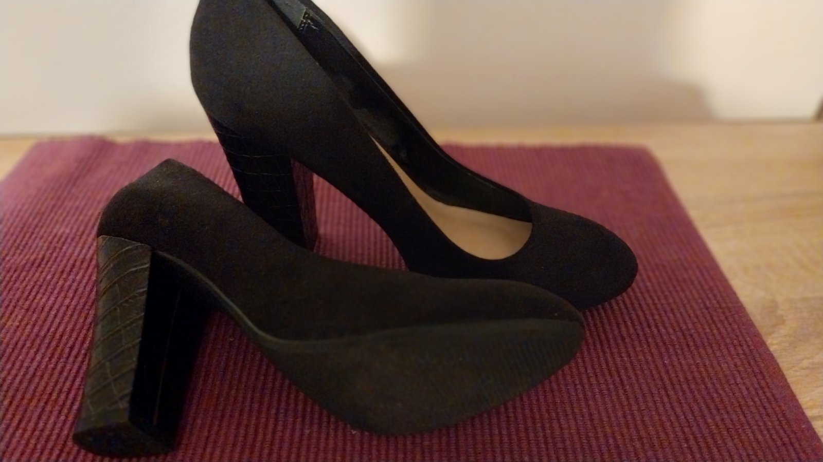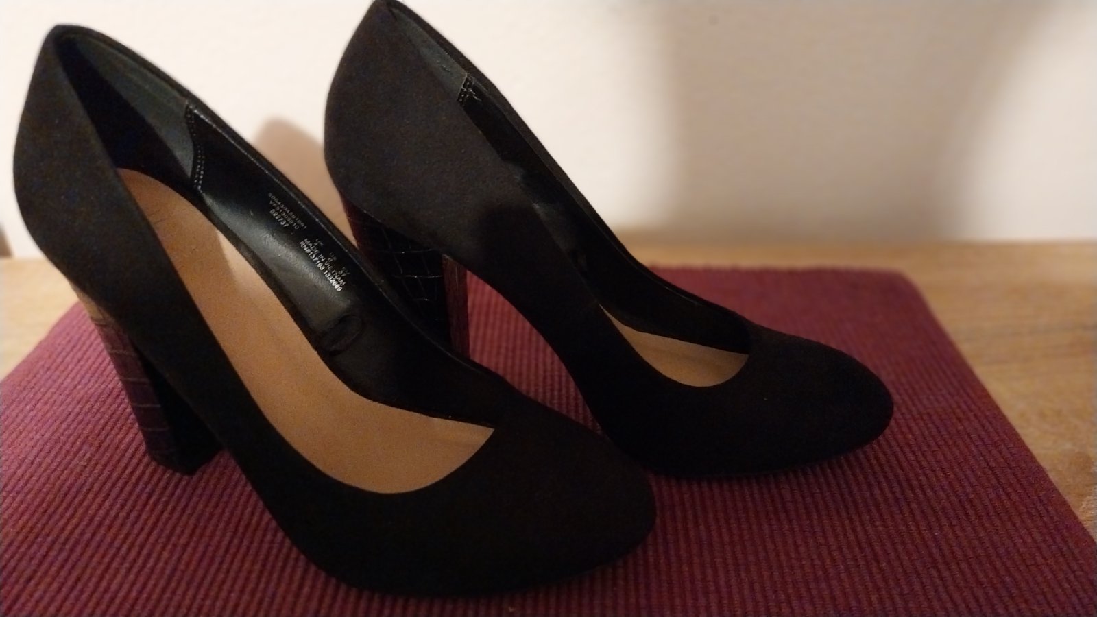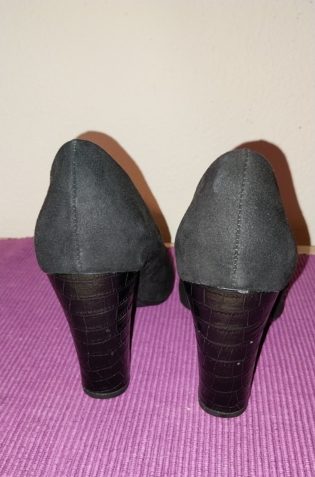 Čierne lodičky na pohodlnom hrubšom podpätku - je stabilný a dobre sa na ňom chodí. Veľkosť je označená 37, ale sedí na veľ. 36 a tak aj udávam. 2x obuté, stav 100%.