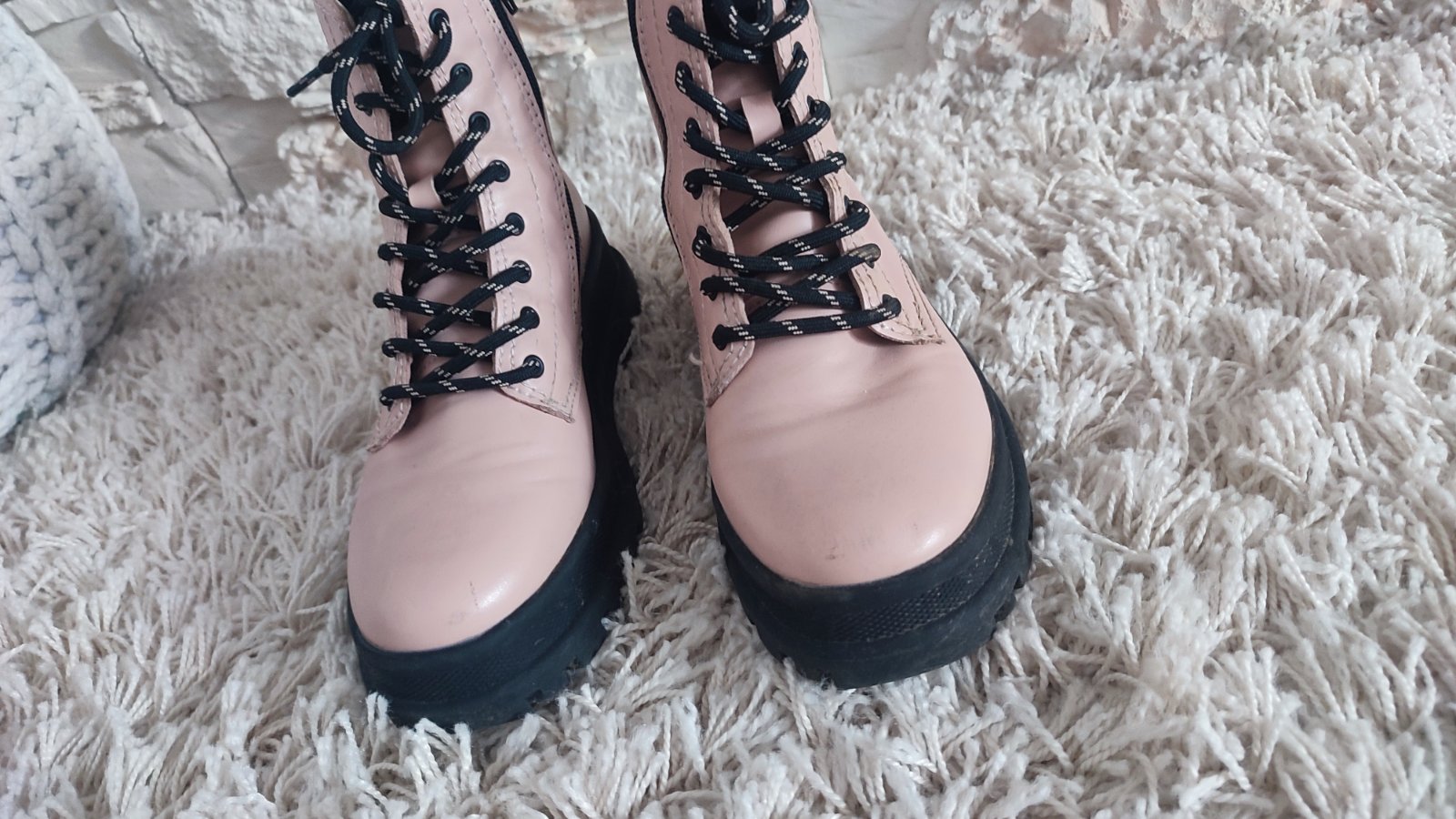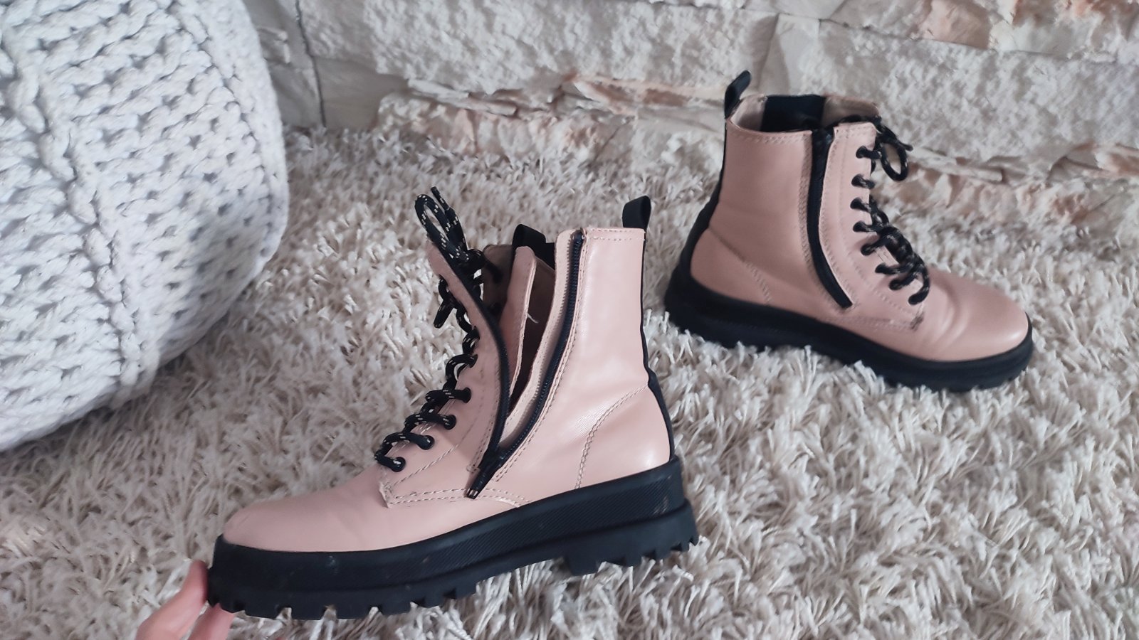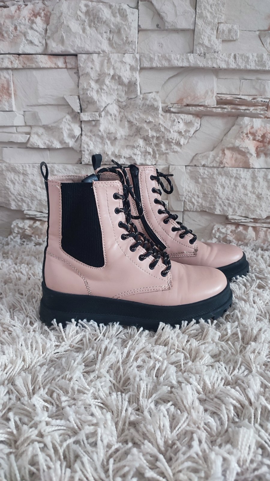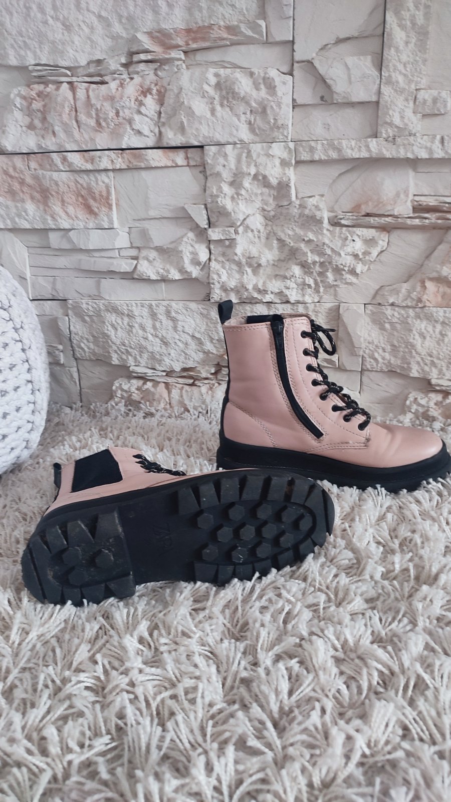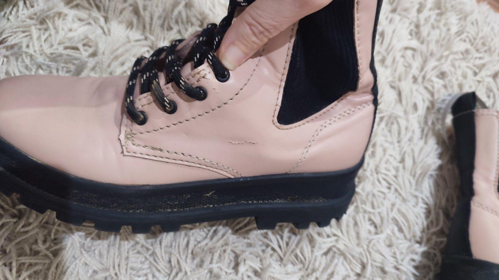 Ponukam púdrovo- ruzove topanky s traktorkovou podrazkou, su mierne zateplene, pre ľahšie obuvanie majú z vnútornej strany zips. Použité max.3 krat., mali sme toho vela. Ako stali , tak teraz vidím,ze pukla koženka, na jednej topánke.