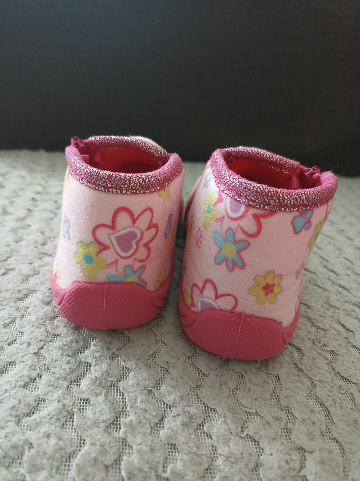 Posuvam papucky slovenskej znacky Manik. V dobrom stave, bez poskodenia, lahko sa obuvaju. Nosene asi dva mesiace, potom sme uz potrebovali vacsie. VD 13 cm